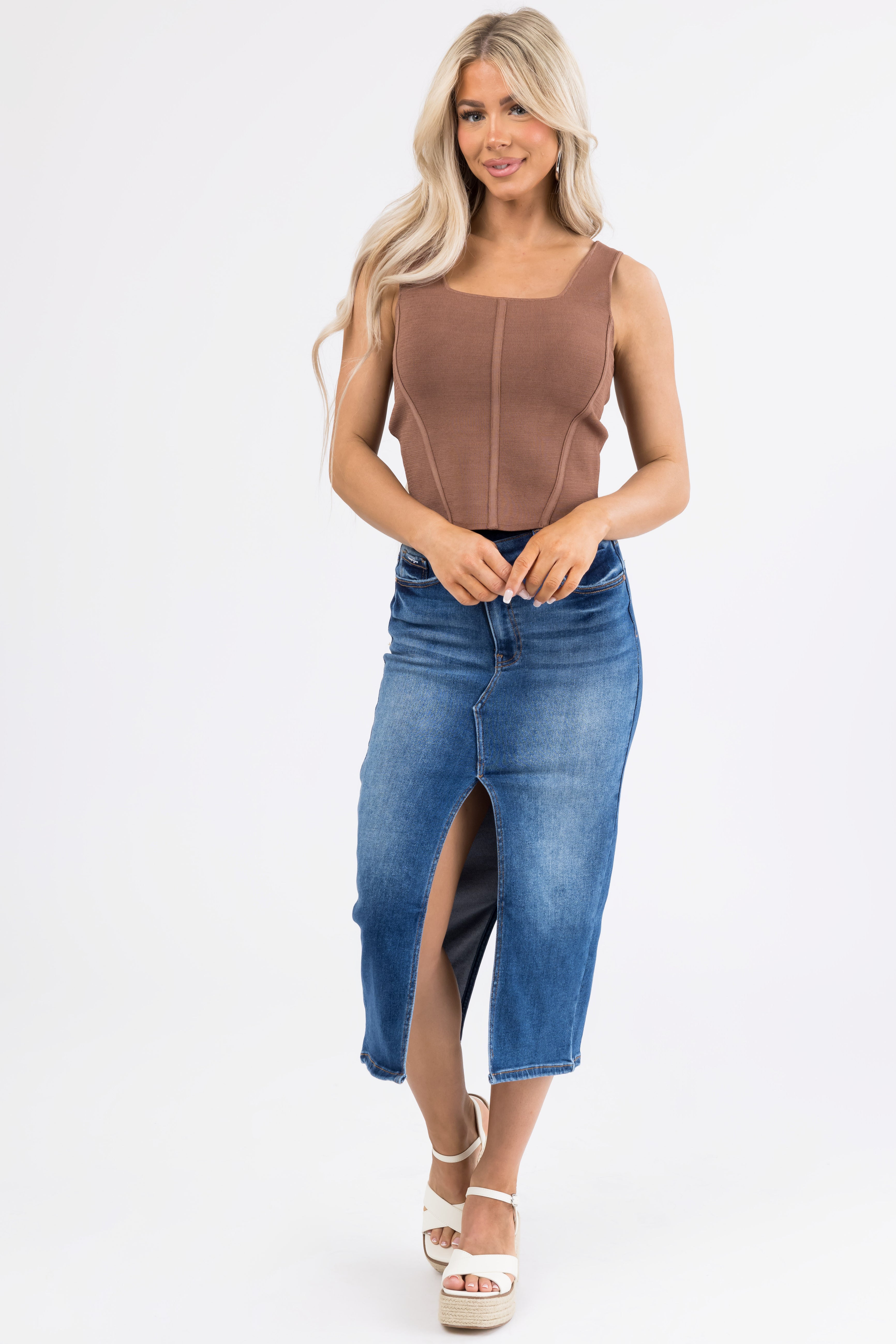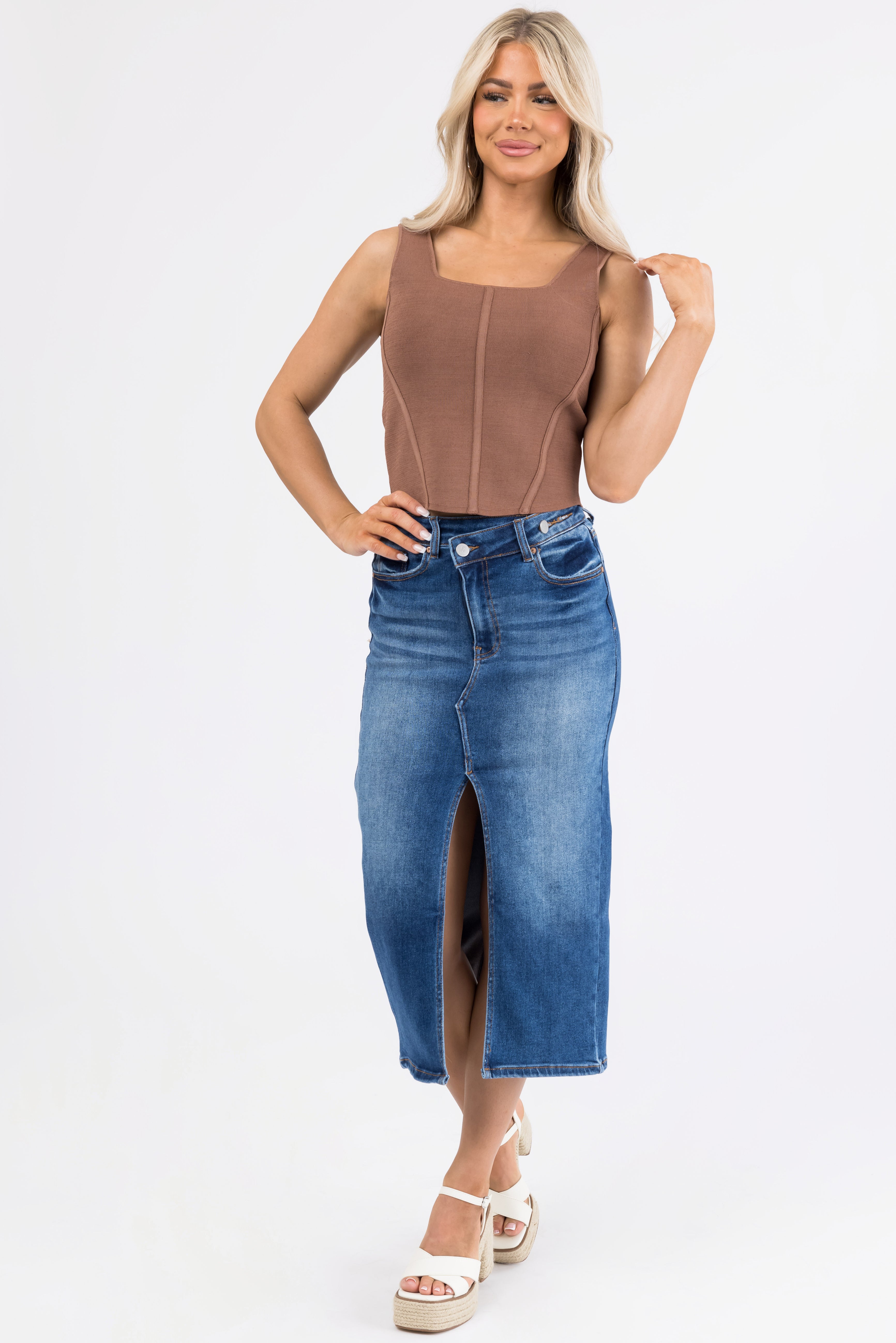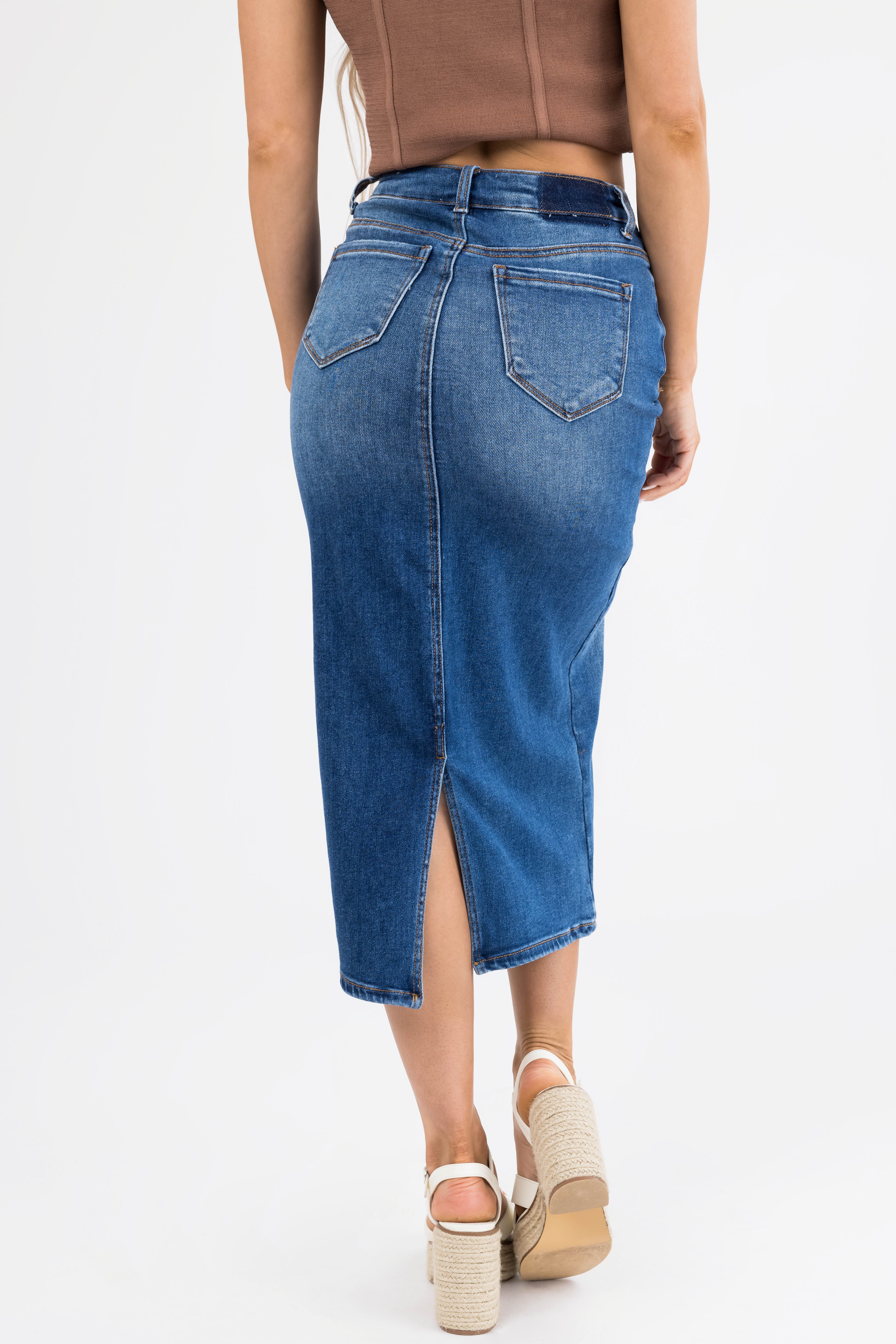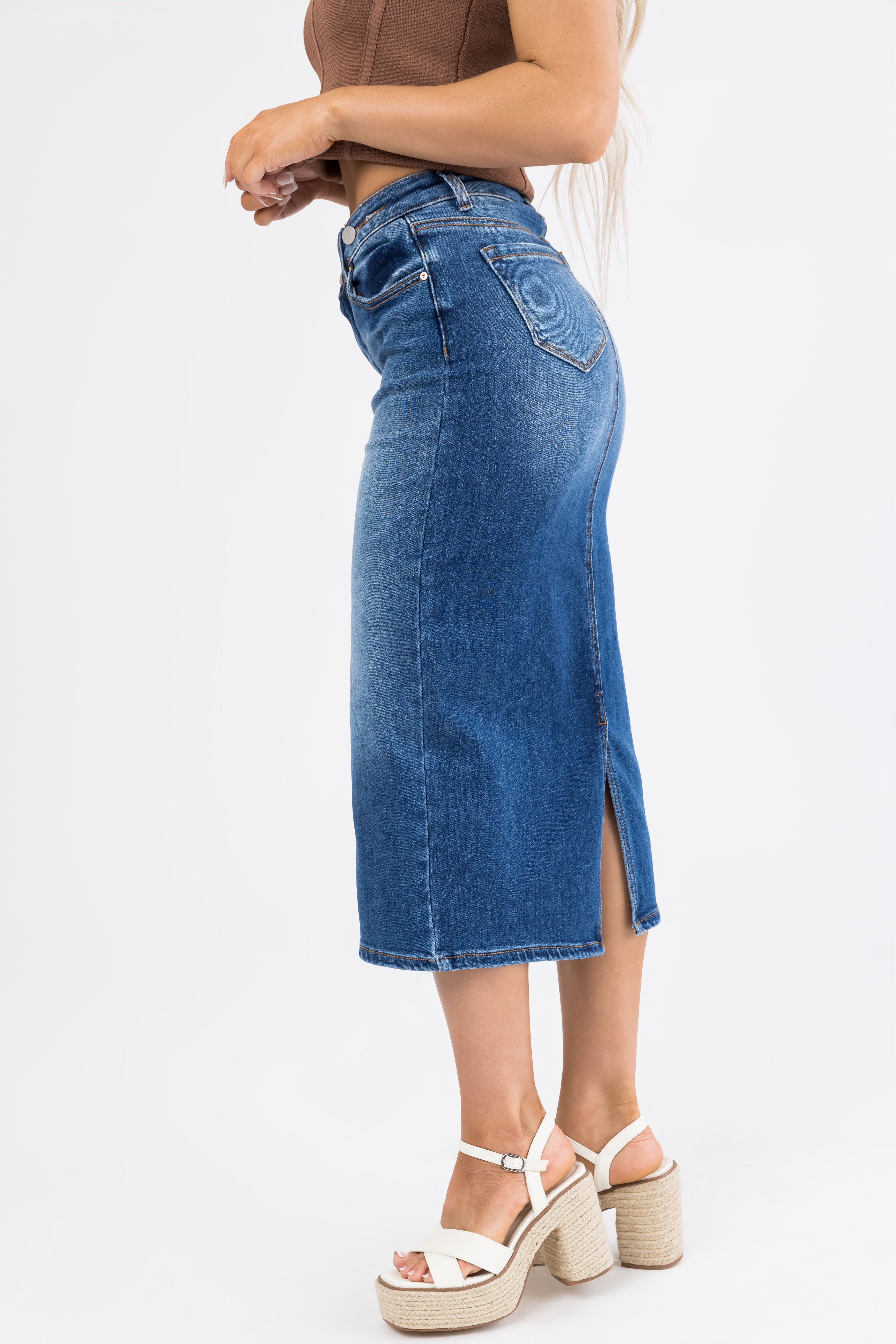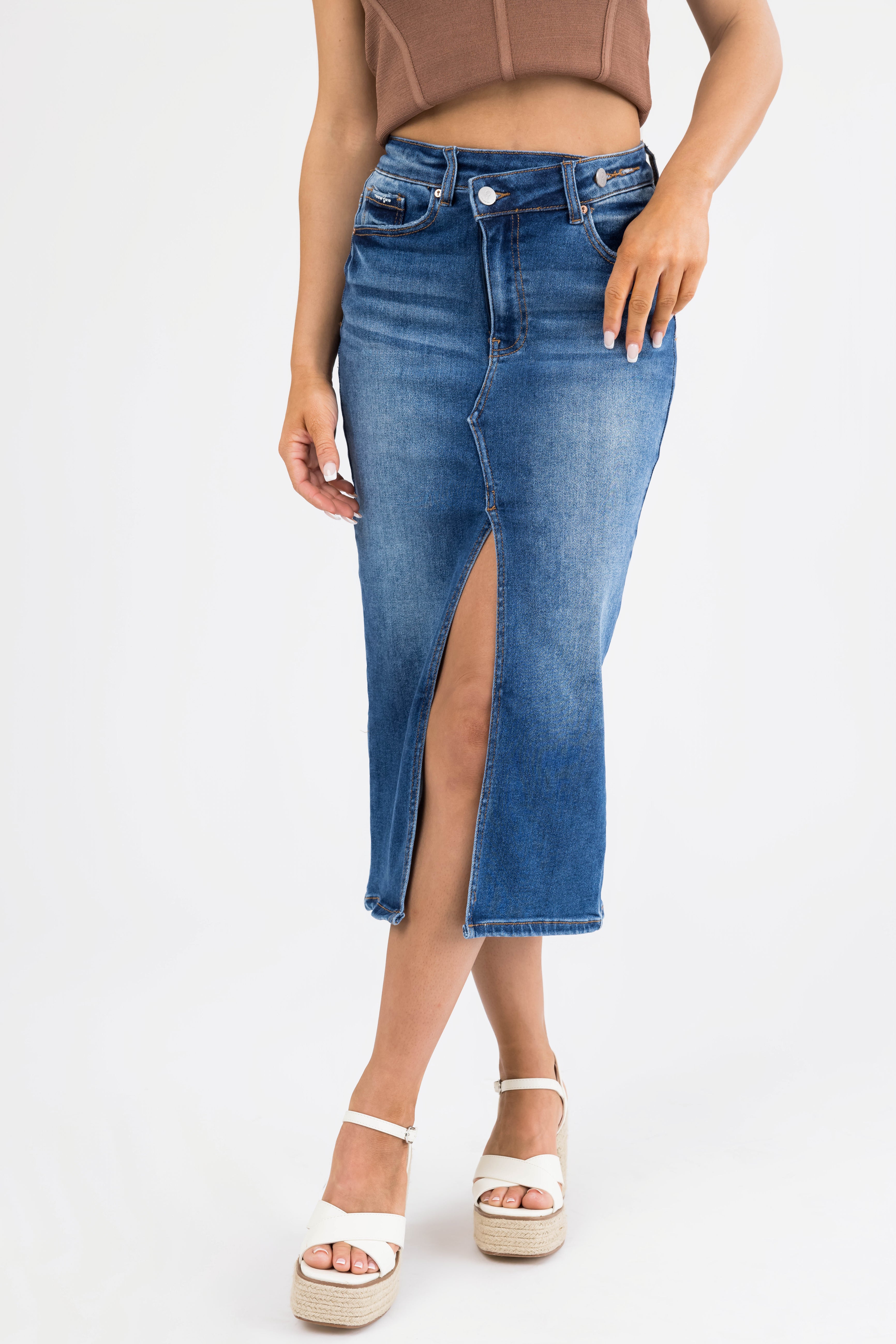 Experience effortless style with our Blue Denim Crossover Midi Skirt, available in XS, S, M, and L sizes. Crafted from a blend of 65% Cotton, 32% Polyester, 1.5% Viscose, and 1.5% Spandex, this stretchy denim skirt features a zippered fly, double button crossover closure, belt loops, and 5 pockets. The front and back hem slits add a trendy touch. Imported and unlined, this skirt is both fashionable and comfortable. Care instructions: Turn inside out, machine wash cold, tumble dry low. Model #1 is wearing size Small. Model #2 is wearing size Small.