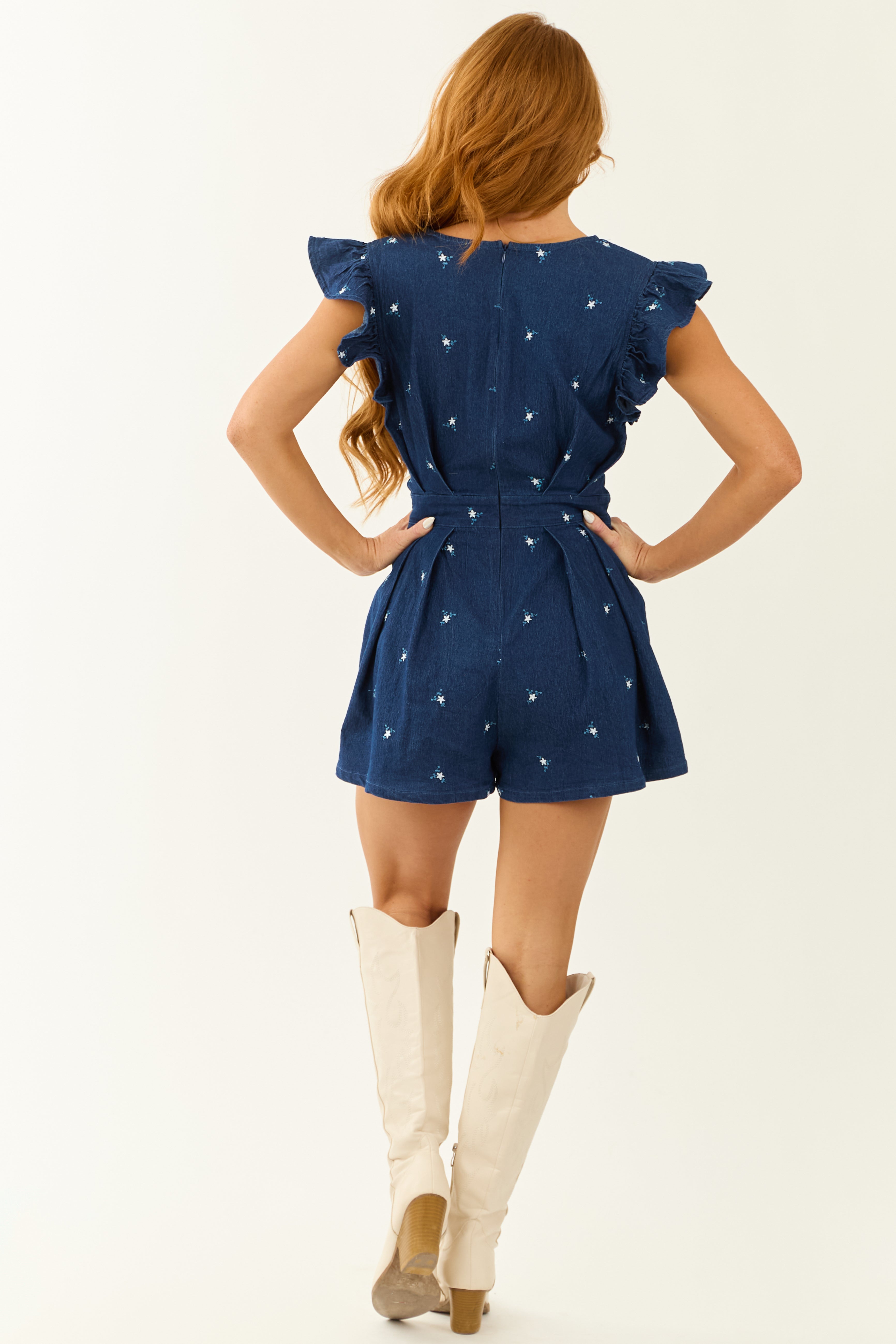 This Blue Denim Floral Embroidered Romper Dress features sweet stitched blooms, a flattering dark wash, and soft feminine details. The dress fits loosely in the bust and is more fitted at the waist, offering a blend of denim charm and delicate embroidery. Made of stretchy denim with an elastic waistband and pleated details, it showcases star floral embroidery in Off White and Azure hues. With ruffle cap sleeves, a V-neck, and a back zipper closure, this dress is both stylish and comfortable. Crafted from 68% Cotton, 30% Polyester, and 2% Spandex, this imported piece is a must-have for your summer wardrobe. Model is wearing a size Small. Available in sizes S, M, and L.