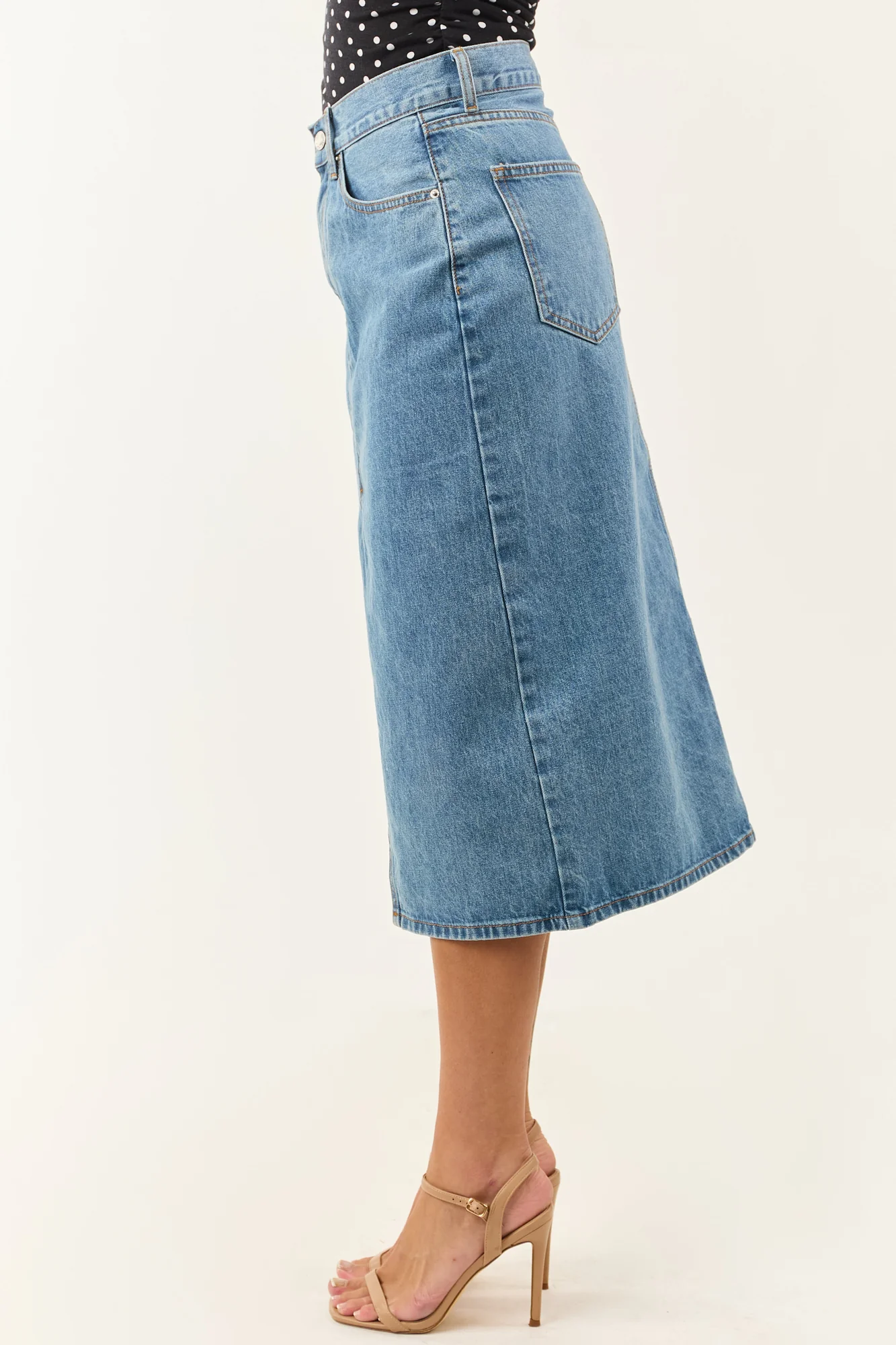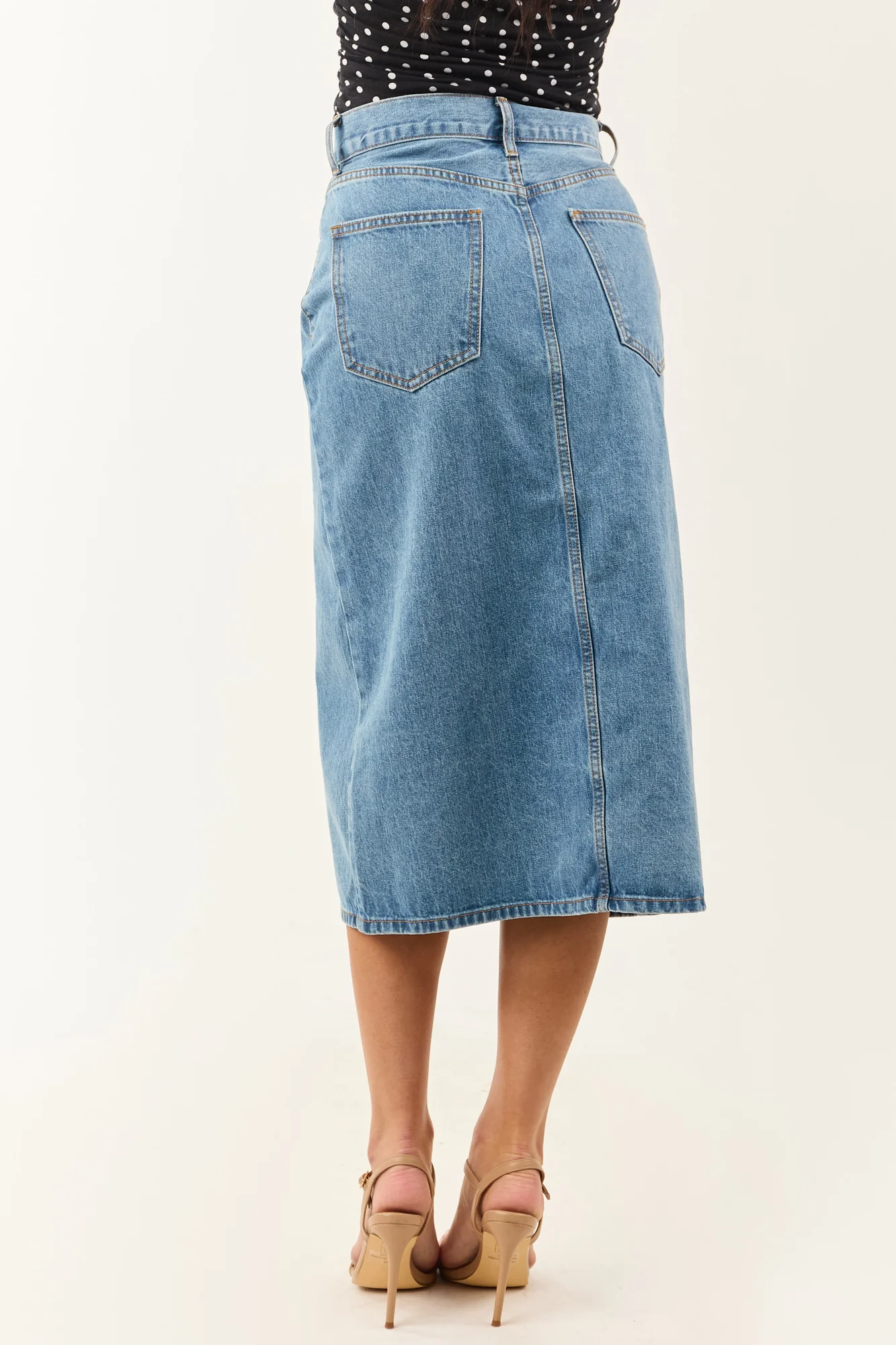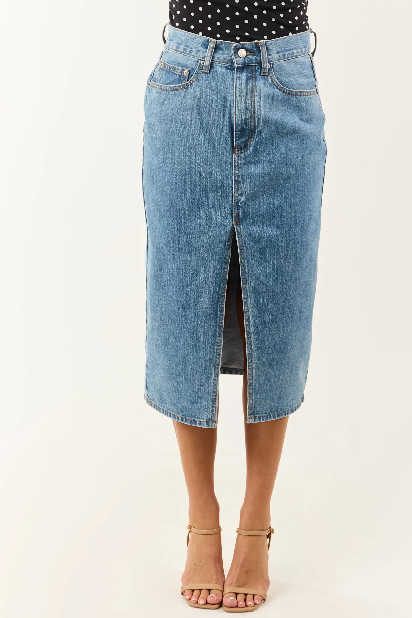 This blue denim midi skirt with a front slit offers effortless movement and style. Perfect for pairing with a variety of footwear options from boots to sandals. The skirt fits slightly loose in the waist; if between sizes, we recommend sizing down. Detailed with 5 pockets and non-stretchy denim material for a classic look. Front slit measures 15.5 inches. Crafted from 100% Cotton. Imported. Model showcased in size Small, with waist 28 inches, hip 37 inches. Models Profile: Size 1, Height 59″, Bust 34″, Waist 26″.