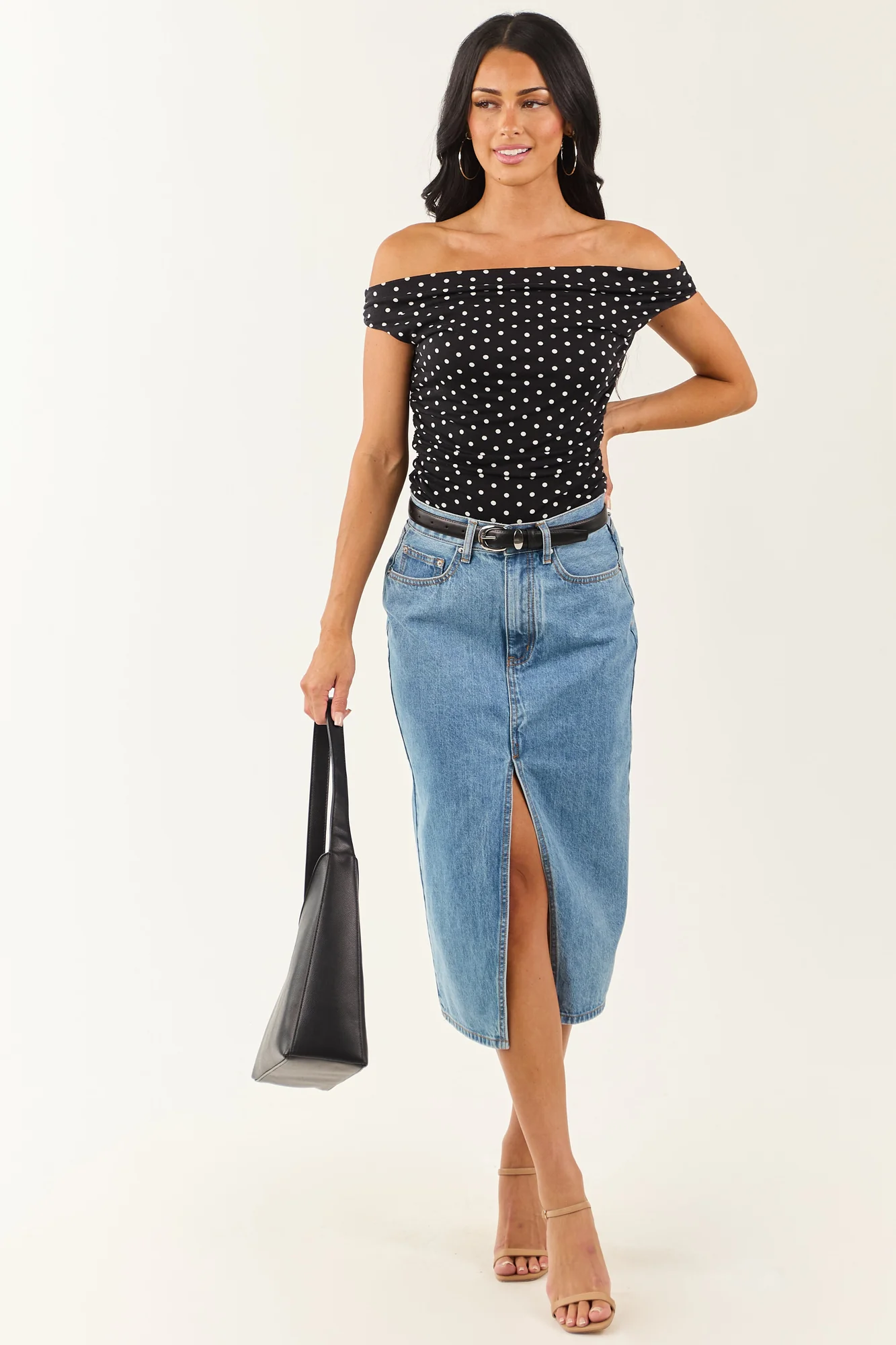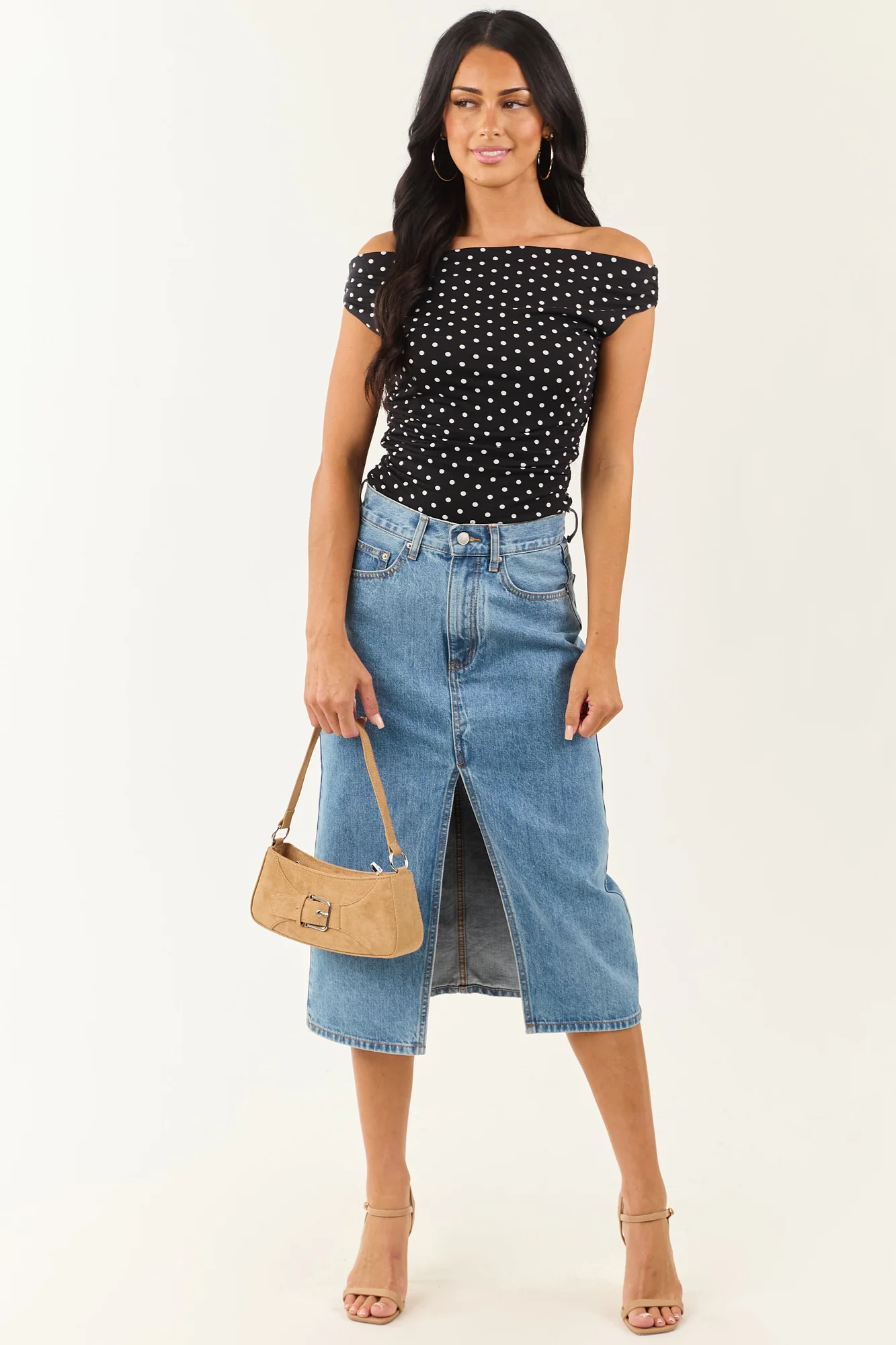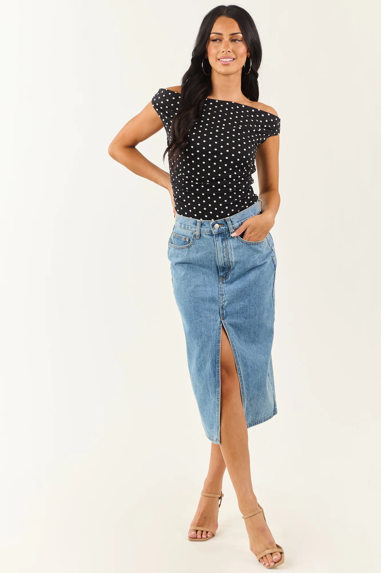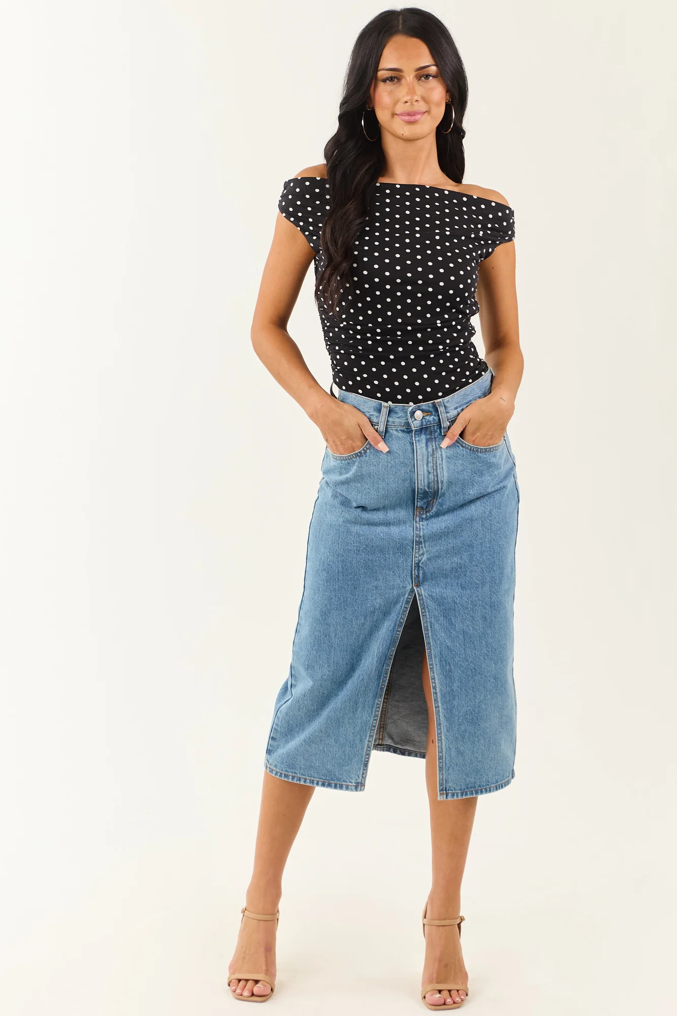 This blue denim midi skirt with a front slit offers effortless movement and style. Perfect for pairing with a variety of footwear options from boots to sandals. The skirt fits slightly loose in the waist; if between sizes, we recommend sizing down. Detailed with 5 pockets and non-stretchy denim material for a classic look. Front slit measures 15.5 inches. Crafted from 100% Cotton. Imported. Model showcased in size Small, with waist 28 inches, hip 37 inches. Models Profile: Size 1, Height 59″, Bust 34″, Waist 26″.