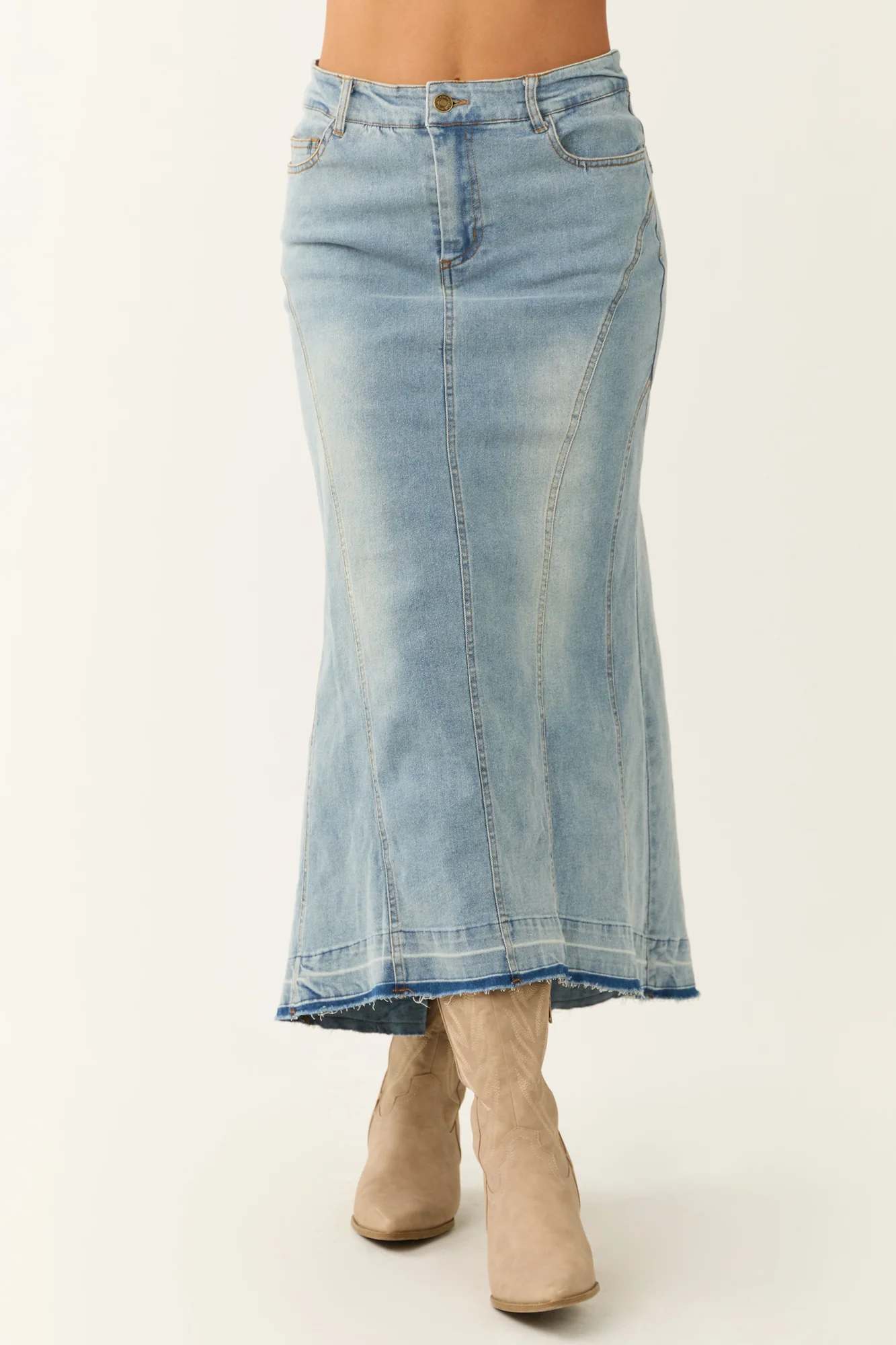 Indulge in timeless elegance with our Blue Denim High-Low Maxi Skirt. Crafted from non-stretchy woven fabric for a classic look, this skirt features a zipper fly with button closure, belt loops, and 5 pockets for practicality. The dark wash raw hem adds a touch of sophistication, while the unlined finish ensures breathability. Made of 68% Cotton, 30% Polyester, and 2% Spandex, this imported skirt is versatile and stylish. Hand wash in cold water for best care. Elevate your everyday outfits effortlessly with this stunning piece. Available in sizes S, M, and L.
