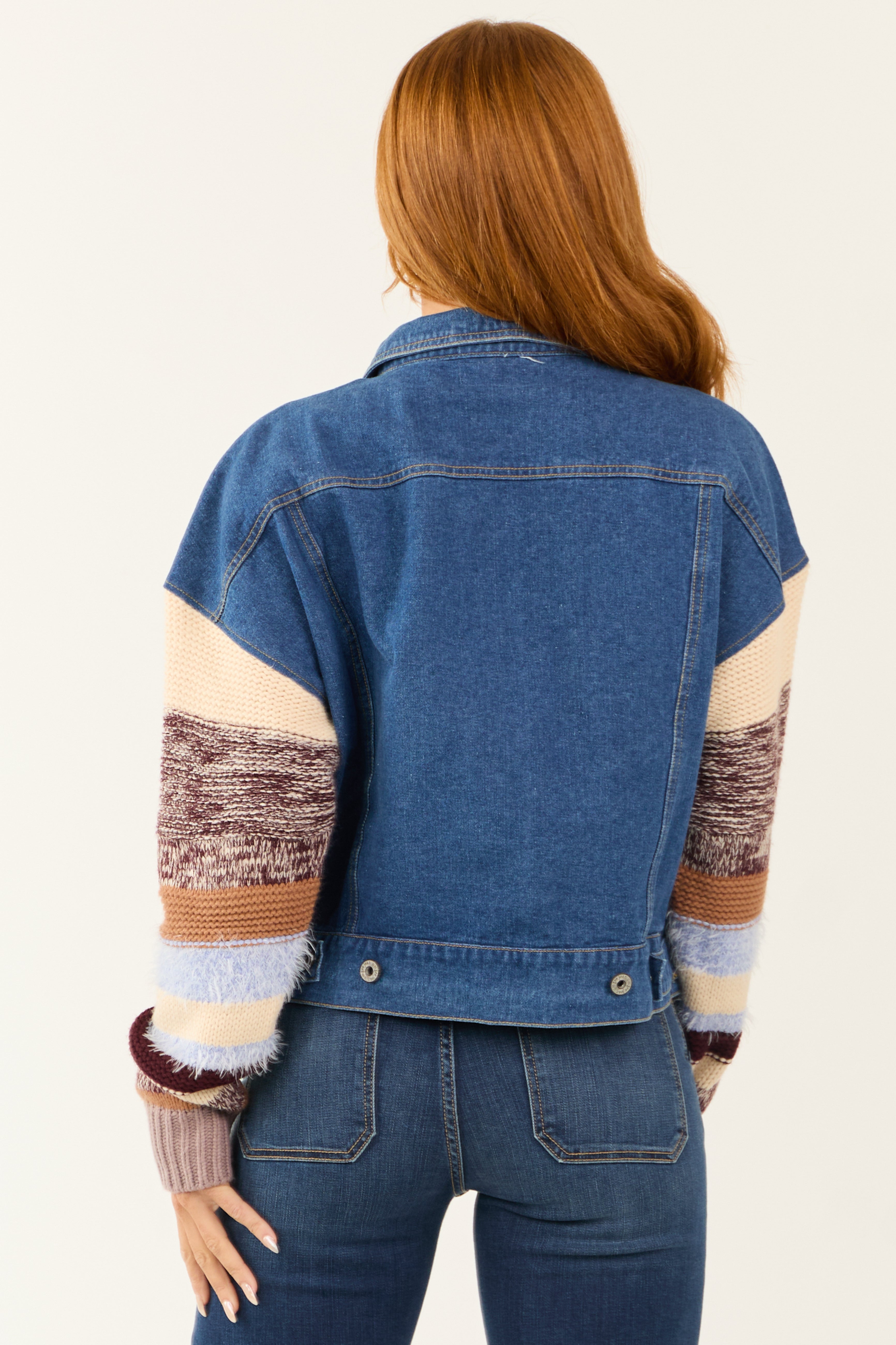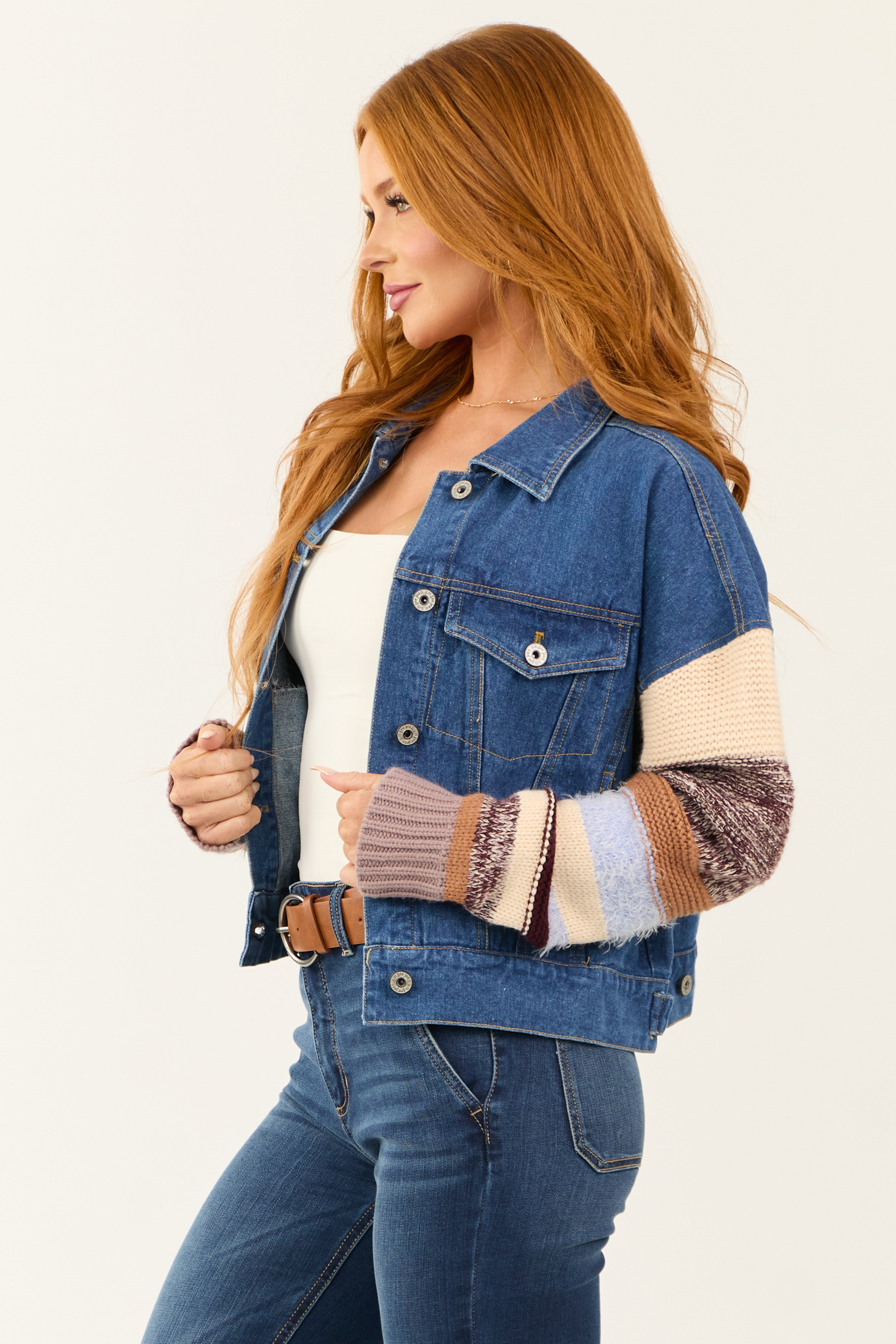 This stylish Blue Denim Jacket with Stretchy Knit Contrast Sleeves is a versatile addition to your wardrobe. Featuring a button-up front, collared design, and side/chest pockets, this jacket is perfect for casual outings. The contrast striped sleeves in Champagne, Mahogany, Copper, Powder Blue, and Dusty Mauve add a pop of color. Made of 95% Cotton and 5% Polyester with 98% Acrylic and 2% Nylon sleeves, this jacket offers both comfort and style. Hand wash cold and hang to dry for best care. Available in sizes S, M, and L.