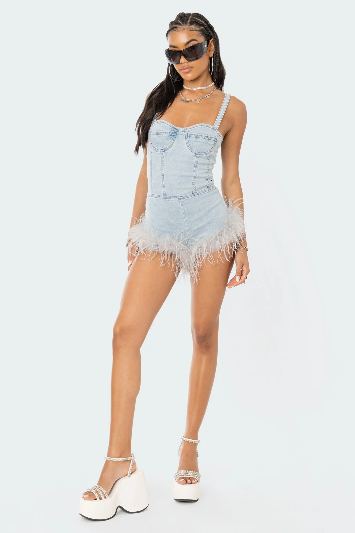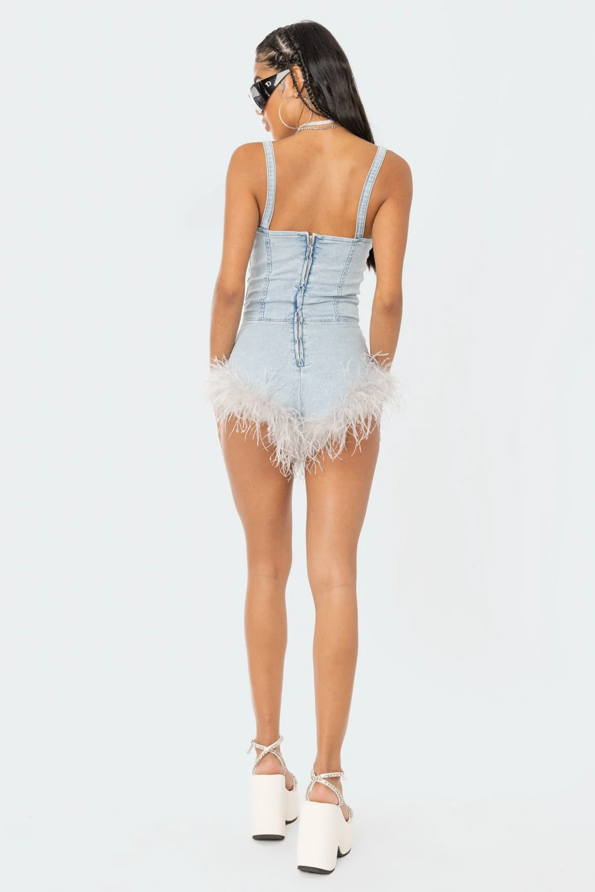 Indulge in the stylish comfort of our Blue Denim Jumpsuit Romper. This romper features a sweetheart neckline, faux feather trim, and is made of a blend of Cotton, Polyester, and Spandex for a perfect fit. Ideal for casual outings or special events, our model showcases its elegance as she enjoys its all-day wear comfort. Remember to wash with similar colors to maintain its exquisite charm.