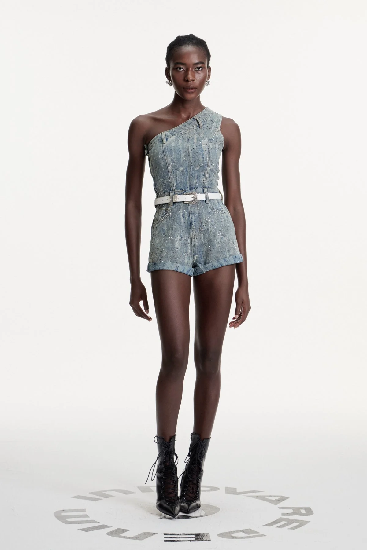 The Blue Denim One Shoulder Jumpsuit offers a contemporary design with durable denim fabric for a sophisticated yet edgy look. Its asymmetrical one-shoulder silhouette adds a modern twist, while the tailored fit ensures flattering comfort. Perfect for versatile styling, transitioning seamlessly from casual daytime wear to chic evening occasions. Crafted for structure and ease, this expertly designed jumpsuit is a statement piece of lasting quality that goes well with urban edge style. Stretch Factor: Non-Stretch. Care Instructions: Gentle machine wash. Please note that color may vary due to lighting in images.