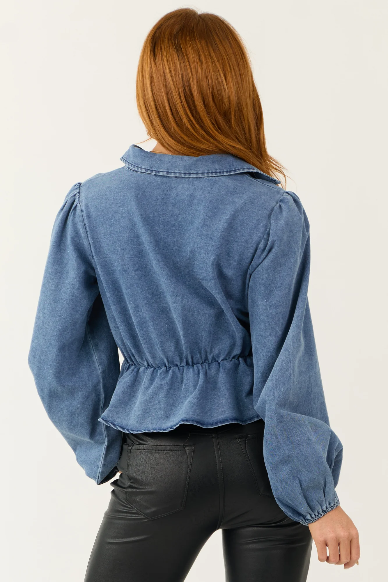 Stay stylish and chic with our trendy blue denim peplum top featuring a V neck with two ties and long puff sleeves. Made from non-stretchy 100% Cotton, this collared top with elastic cuffs and cropped length exudes charm and versatility. The elastic waistline offers a comfortable fit and extra room. Perfect for daytime wear, this top is unlined and easy to care for. Hand wash cold, do not bleach, do not tumble dry, hang dry. Available in sizes Small, Medium, and Large. Model is wearing a size Small. Model’s Profile: Height 55″, Bust 33″, Waist 24″