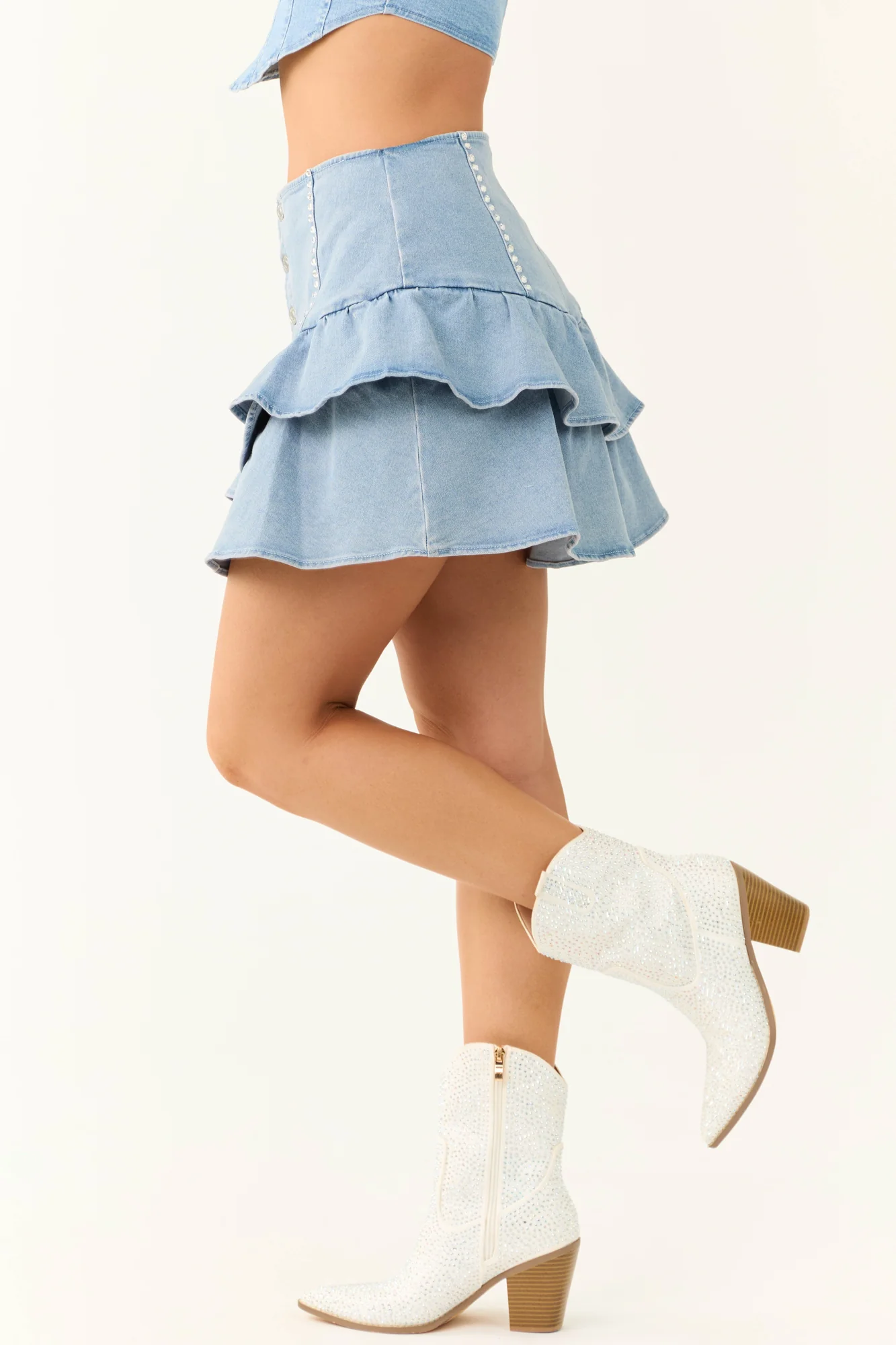 This Blue Denim Ruffle Mini Skirt is a wardrobe essential for any stylish individual. Made of 98% Cotton and 2% Spandex, this semi-stretchy denim skirt features a button-down front with elegant rhinestone details. The drop waist design adds a chic touch while remaining comfortable for all-day wear. Pair it with your favorite top for a trendy look that effortlessly transitions from daytime to date night. Available in sizes S, M, and L. Care Instructions: Hand wash cold, do not bleach, iron low, dry flat, do not dry clean. Model is wearing a size Small. Model’s Profile: Size 1, Height 57, Bust 34, Waist 26.