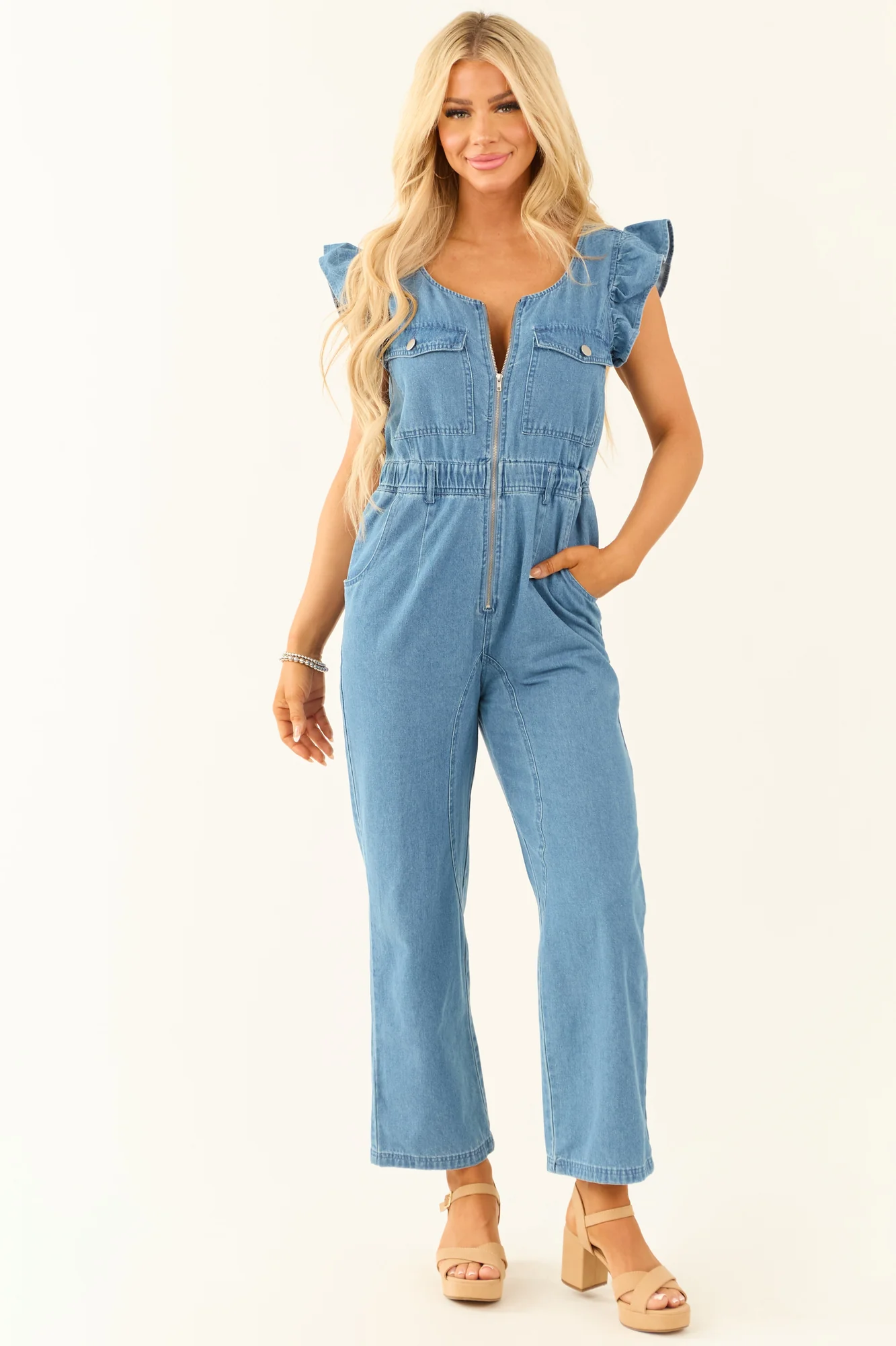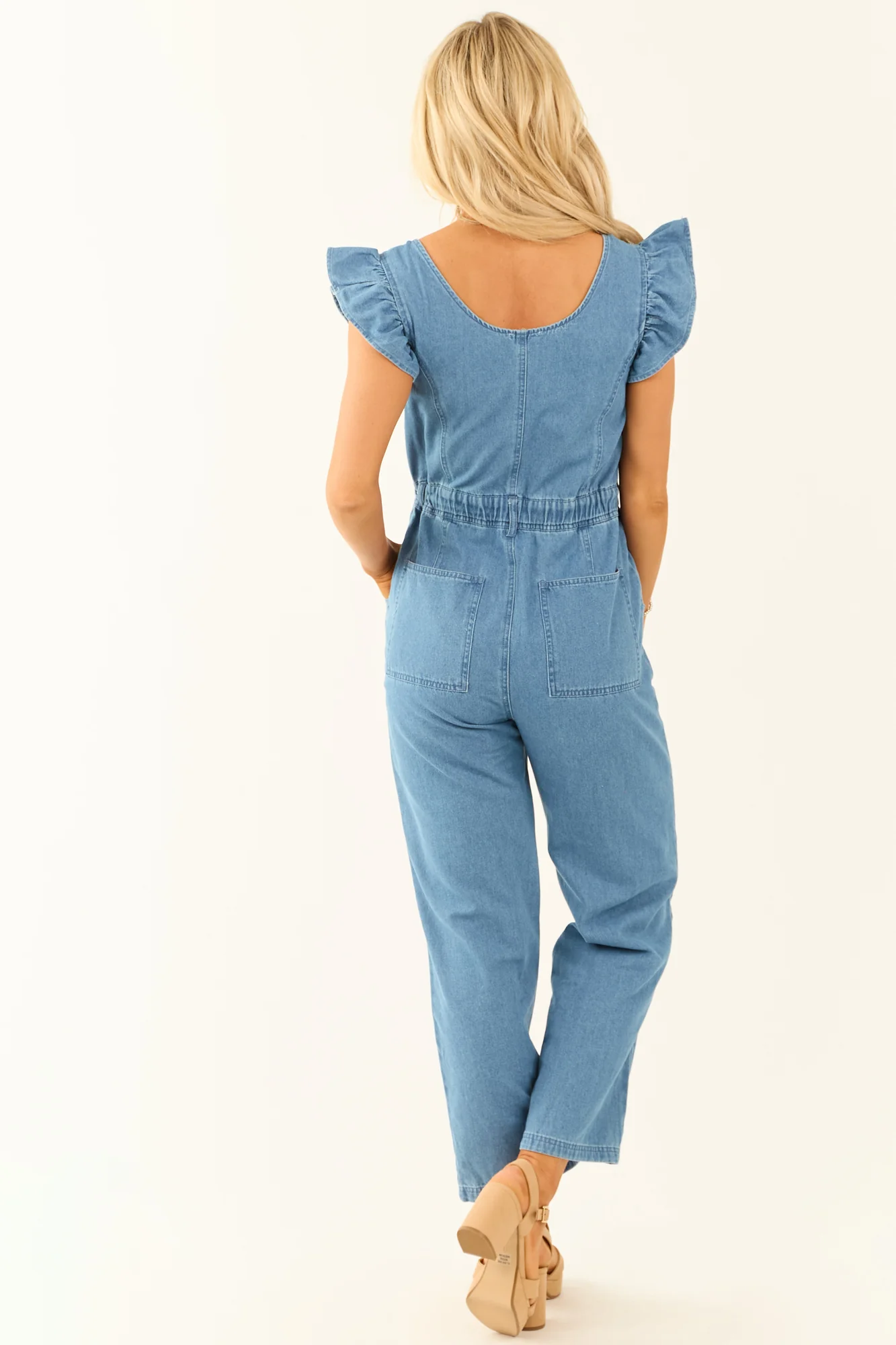 This chic Blue Denim Ruffle Sleeve Jumpsuit is a versatile piece perfect for date nights or going out. Made from 100% Cotton, it features short ruffle sleeves, chest pockets with button closure, belt loops, four pockets, and a wide-leg design for a trendy look. The jumpsuit fits true to size and is non-stretchy. Care instructions: Hand wash in cold water, do not bleach, color separate, hang or line dry. Available in sizes S, M, and L.