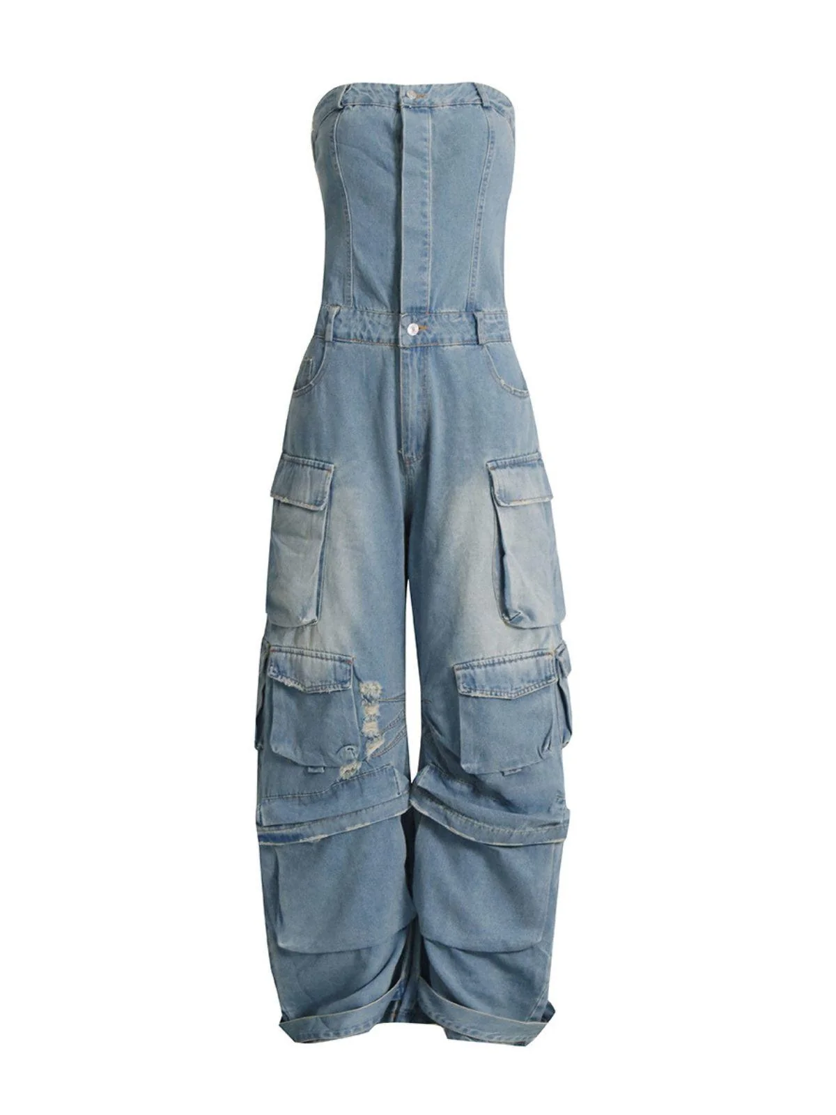 Elevate your style with the Blue Denim Strapless Jumpsuit featuring a chic bandeau silhouette, slim straight legs, and unique pocket details. Crafted from high-quality 100% polyester for durability and comfort. This jumpsuit is machine washable for easy care. Add a trendy touch to your wardrobe for any occasion. Please note: color may vary due to lighting. Model is shown wearing size S. Available sizes: S, M, L, XL.