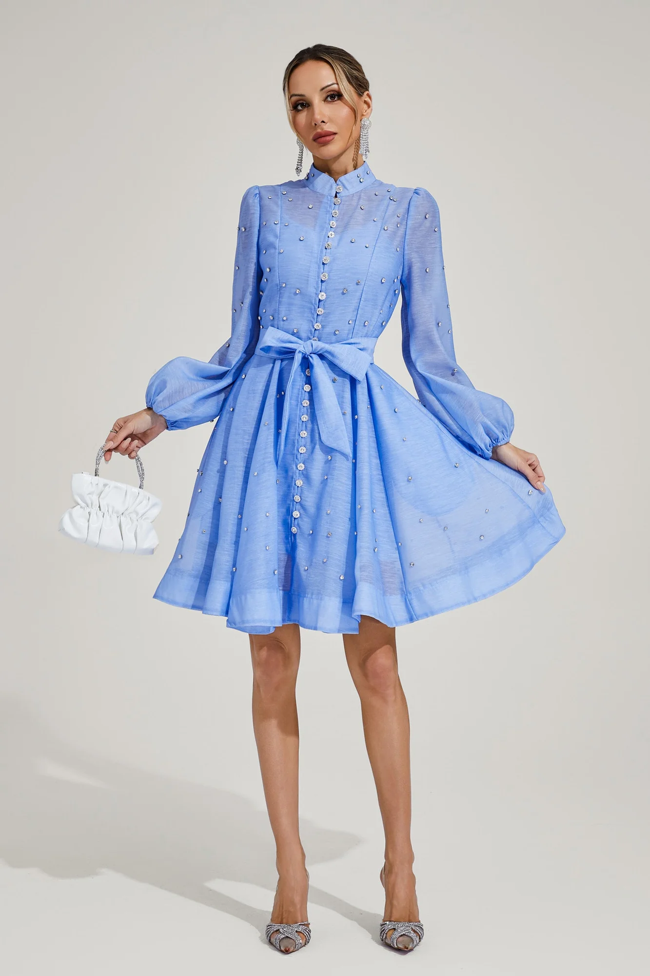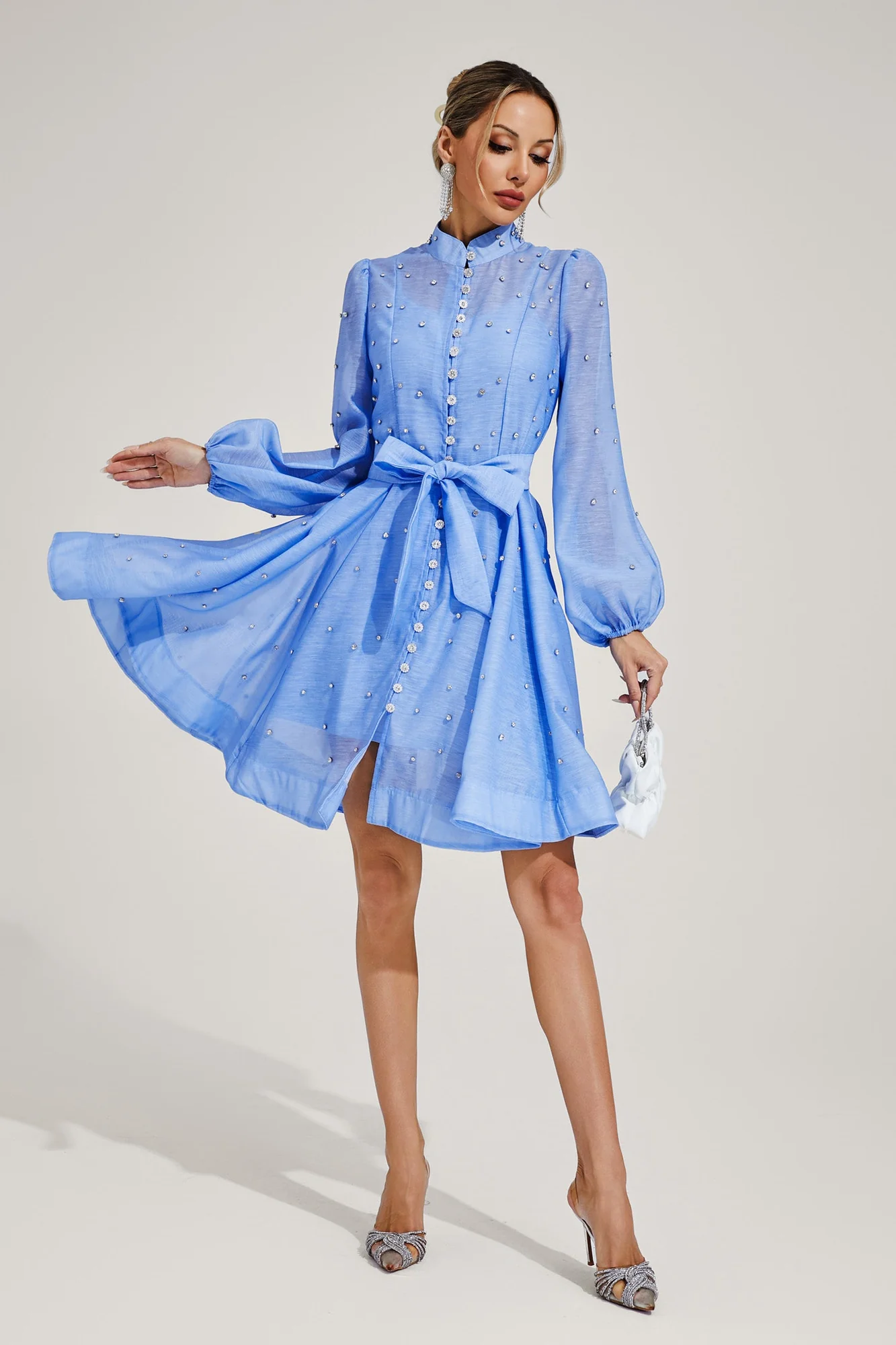 Elevate your wardrobe with our Blue Diamond Embellished Mini Dress with Pearl Detailing, exuding luxury and sophistication. This elegant dress features intricate pearl detailing, a fitted waist, and an included undershirt dress, making it perfect for special events. Crafted from polyester, this dress has a length of approximately 95cm. To ensure longevity, gentle dry cleaning is recommended. The model is 5 ft 7 and wears size S. Please consult our size chart for the best fit, as this item runs true to size and is cut accordingly. Color may vary slightly due to lighting. Trust our product images for accurate color representation.
