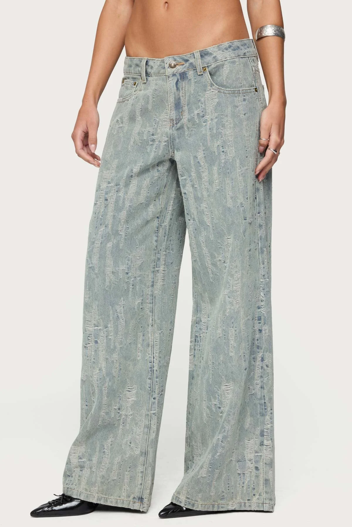 Discover ultimate comfort and style with our blue washed distressed denim low rise jeans. Crafted from a blend of cotton, polyester, and rayon, these jeans feature a wide leg fit and distressed design for a fashionable look. The low rise waist adds a flattering touch, making them perfect for any casual outing. Whether youre running errands or meeting friends, these jeans will keep you looking chic all day long. Model wears size S with inseam of 31.69 inches. Care instructions: Machine wash cold, do not bleach, tumble dry on low, iron at a maximum of 110ºC, do not dry clean.