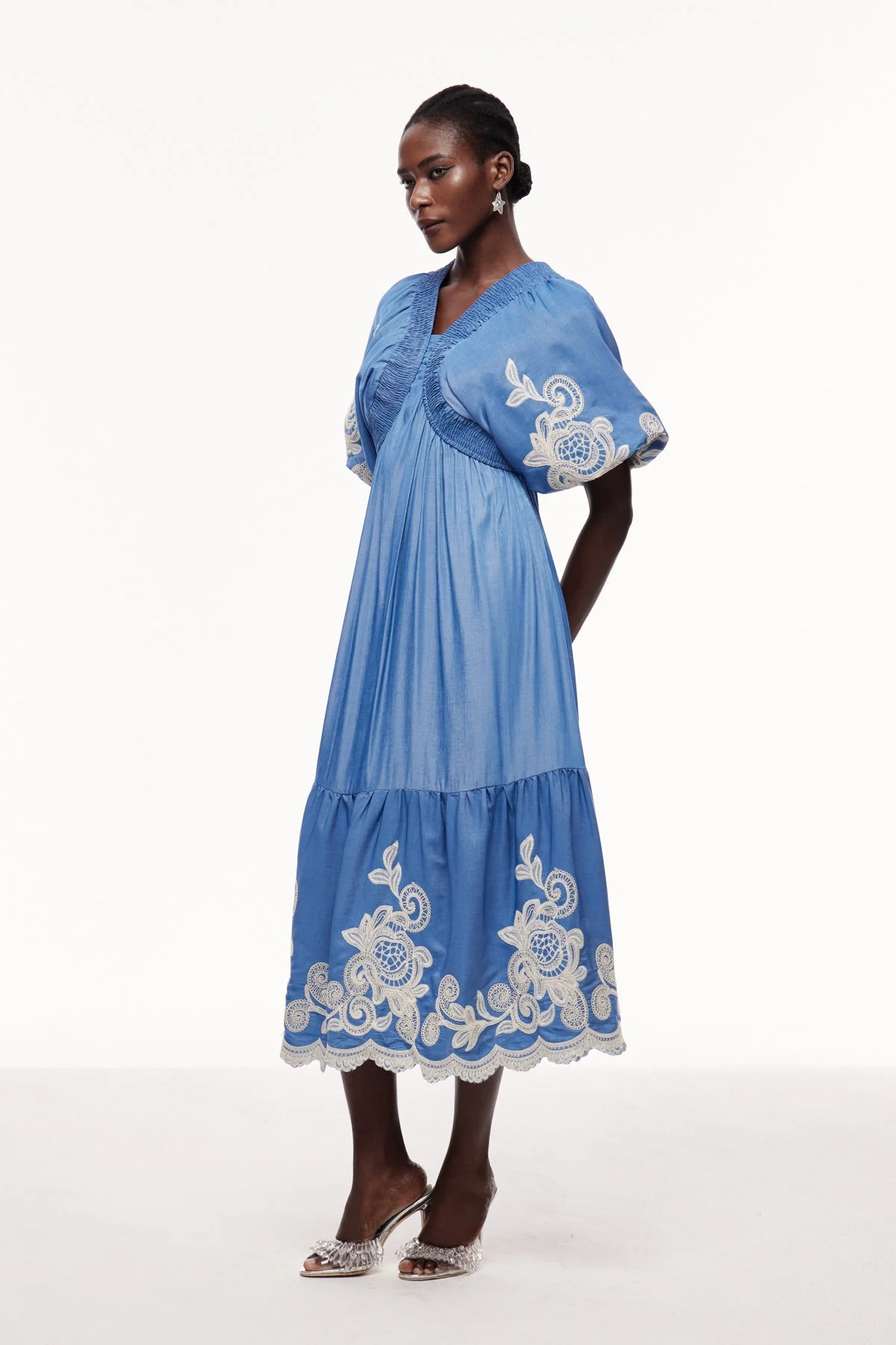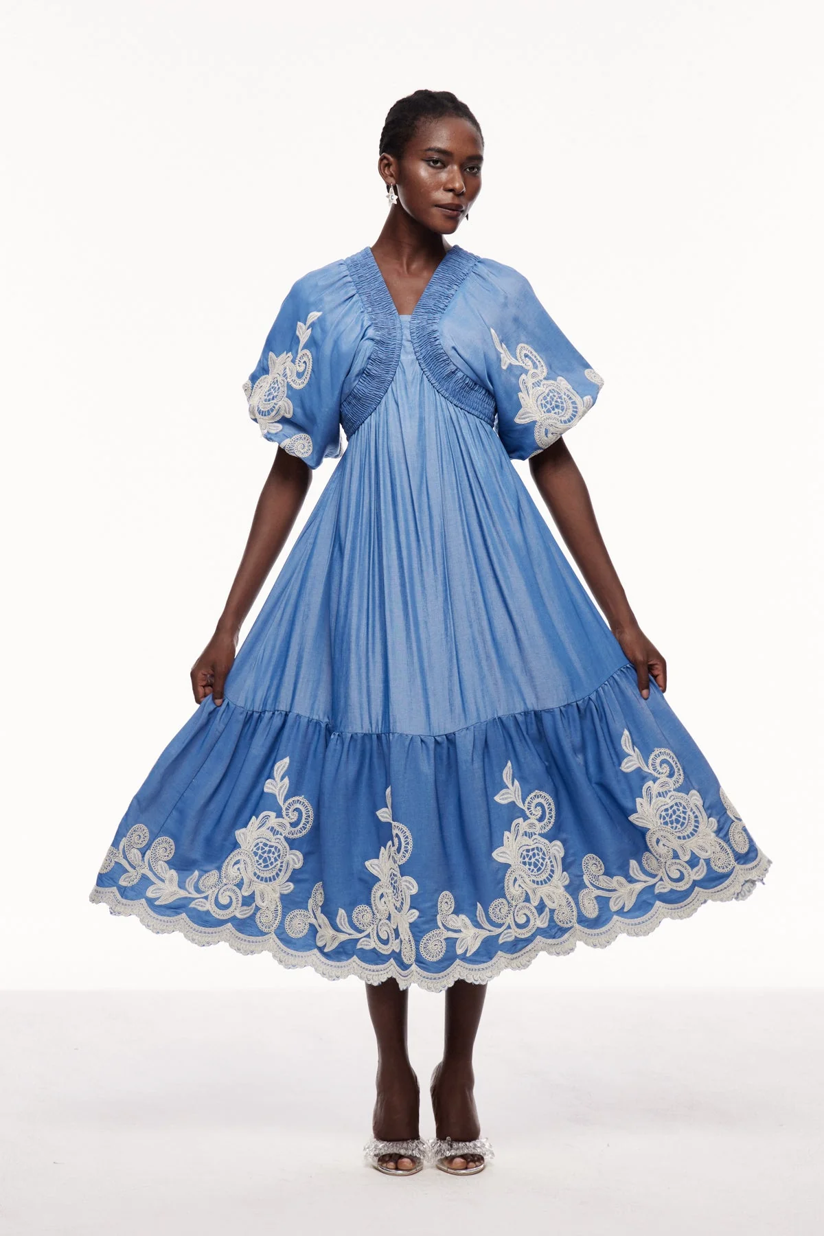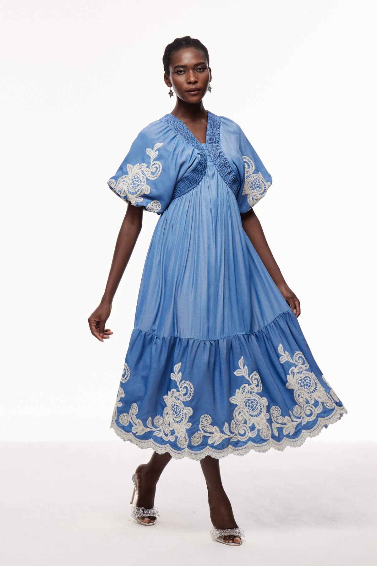 The Blue Embroidered Plunge Maxi Dress combines elegant craftsmanship with a flattering silhouette, featuring intricate embroidery and a deep plunge neckline for a refined and sophisticated style. This maxi dress ensures comfort and movement, perfect for formal occasions or upscale events where a polished look is essential. The stretch factor is non-stretch. Cleaning instructions: Gentle machine wash. Please note: Color may vary due to lighting in images.