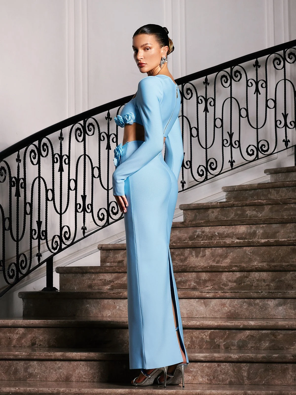 Elevate your style and confidence with our Blue Floral Bandage Skirt Set in Blue. This stylish set features a striking blue color and a captivating floral design, suitable for any event. The bandage material perfectly contours your body, enhancing your curves and boosting your confidence. Upgrade your wardrobe with this essential set that combines fashion and comfort seamlessly. Crafted from 95% Polyester and 5% Spandex, this ensemble offers a high stretch level for optimal comfort. The zippered opening at the back ensures easy wear, while the gentle machine wash ensures hassle-free maintenance. Please note that color may vary slightly due to image lighting. Step out in style and feel empowered. Model is shown wearing size S.