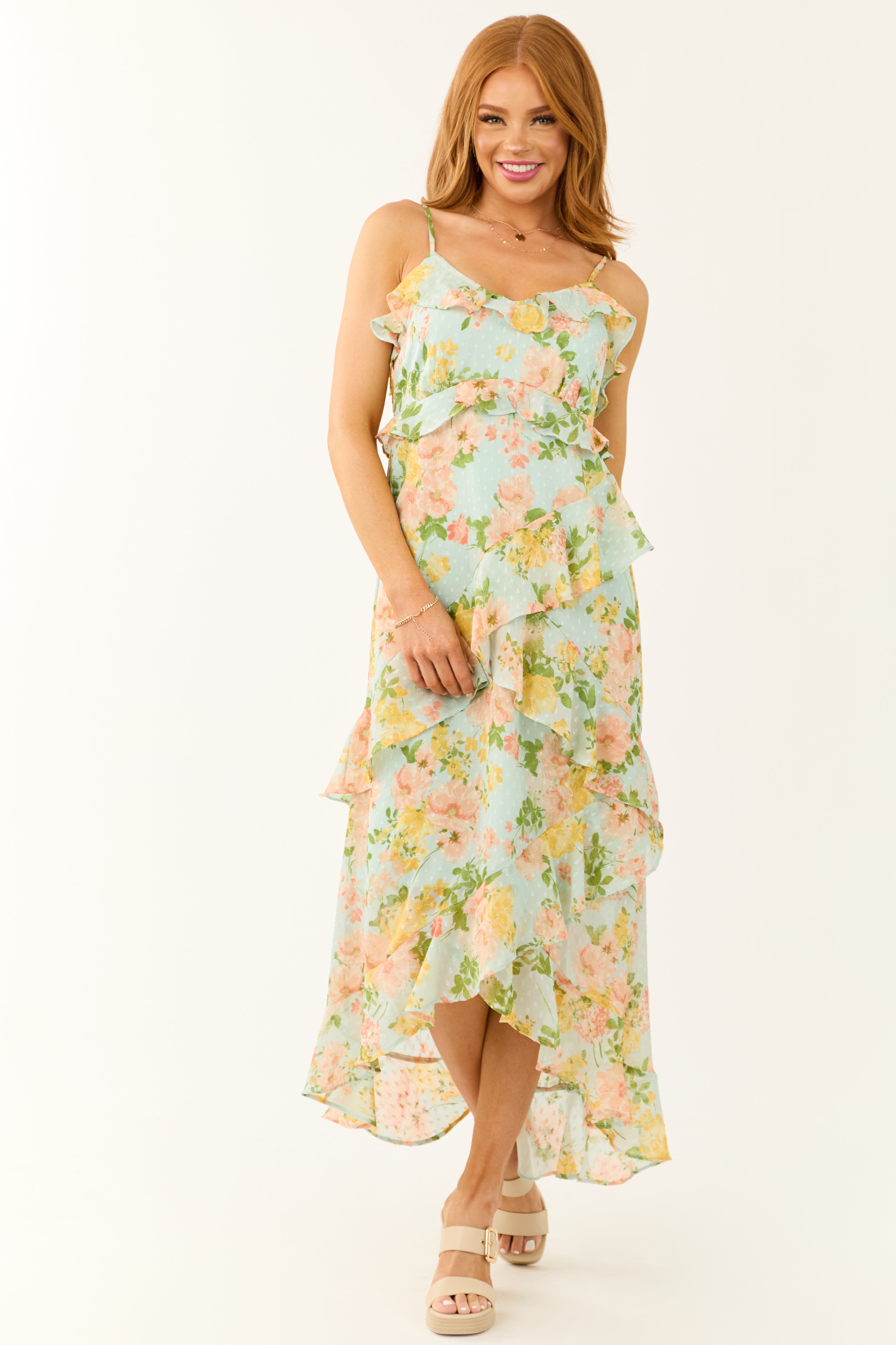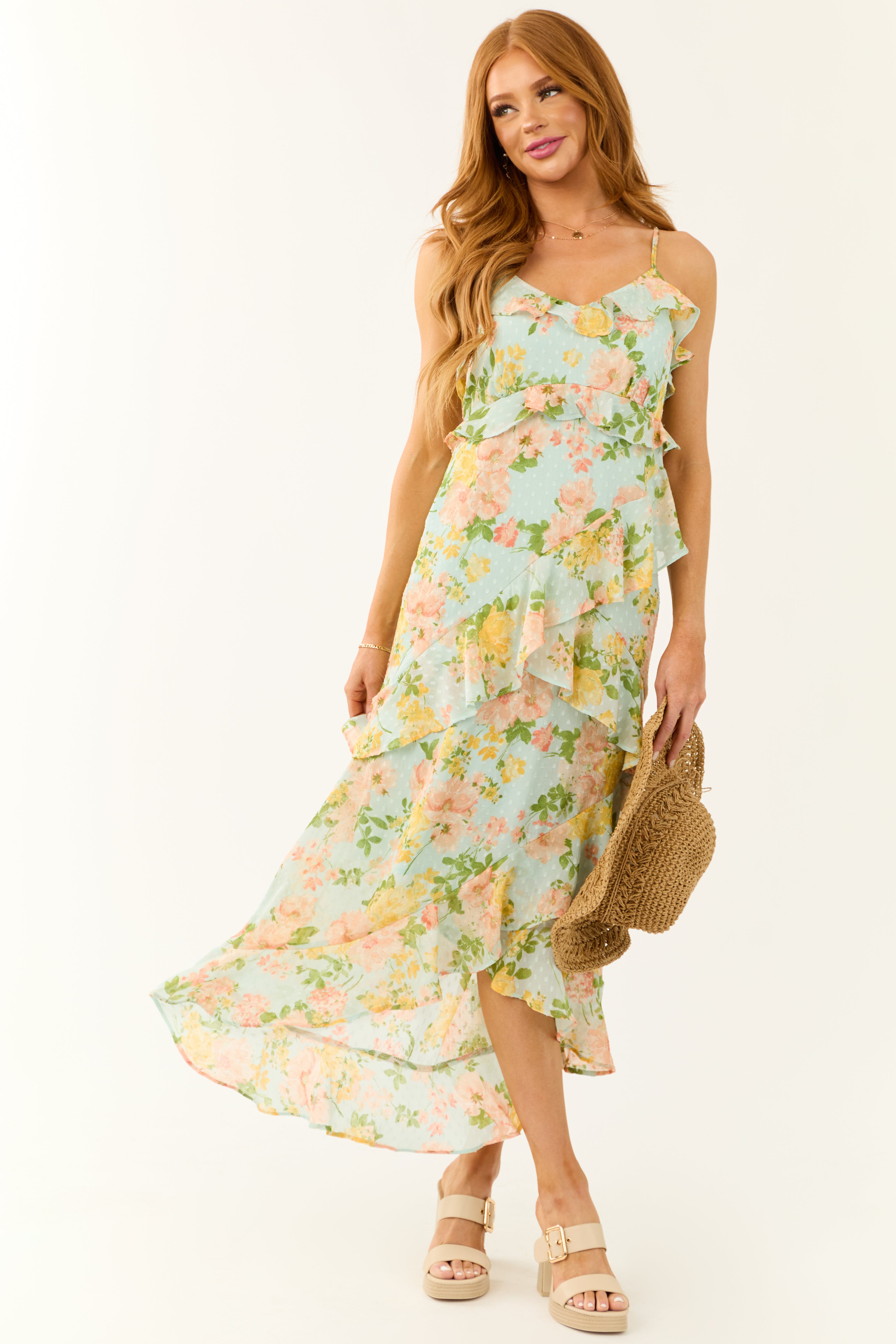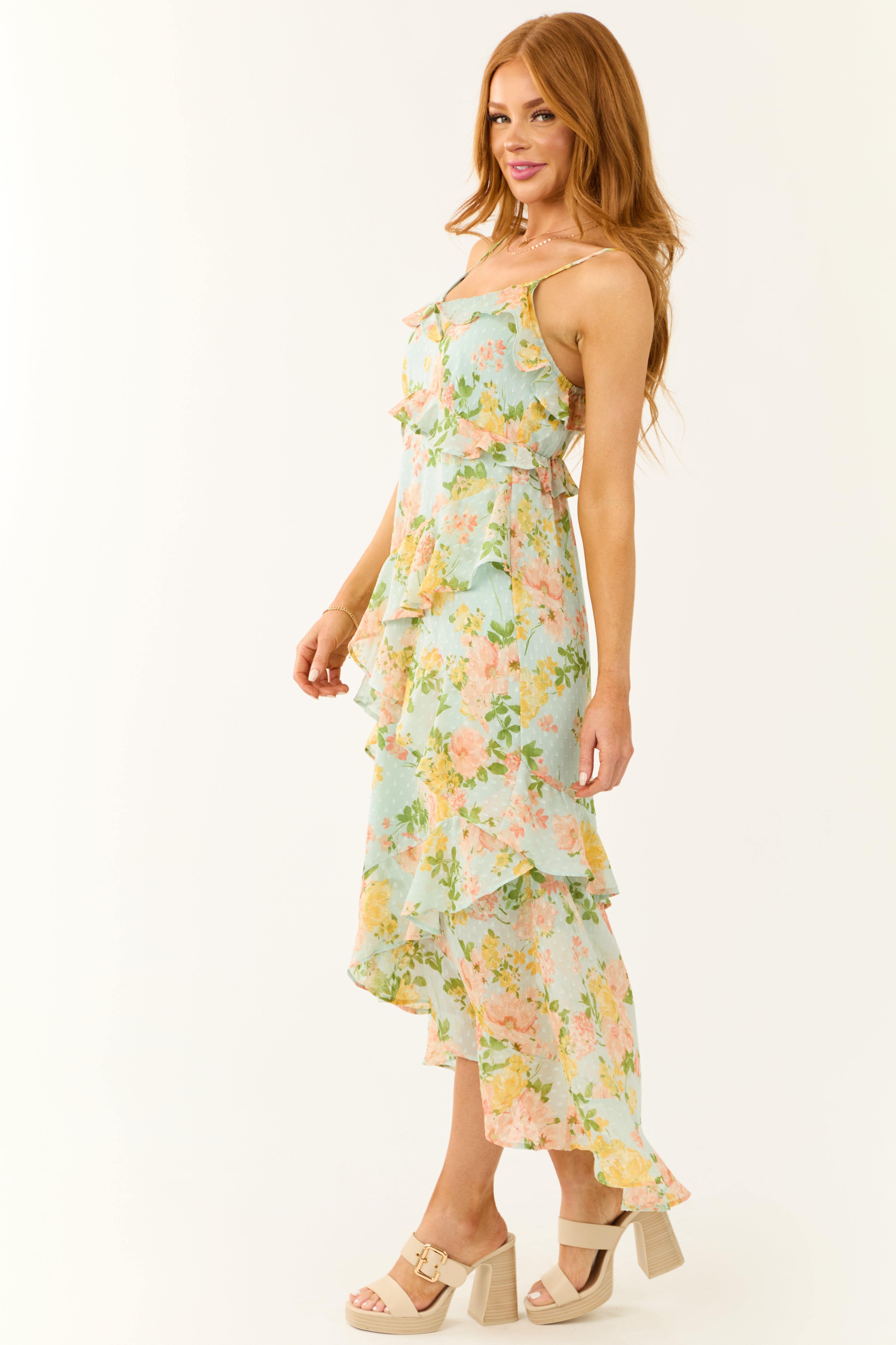 Feel elegant and chic with our Blue Floral Ruffle Midi Dress in sizes S, M, L. Crafted from non-stretchy textured woven fabric, this dress features a sweetheart neckline, adjustable spaghetti straps, ruffle trim, and a tulip hemline. Perfect for daytime events or parties, it has an elastic back and is lined for extra comfort. Turn heads with this beautiful dress that is ideal for spring and summer occasions.