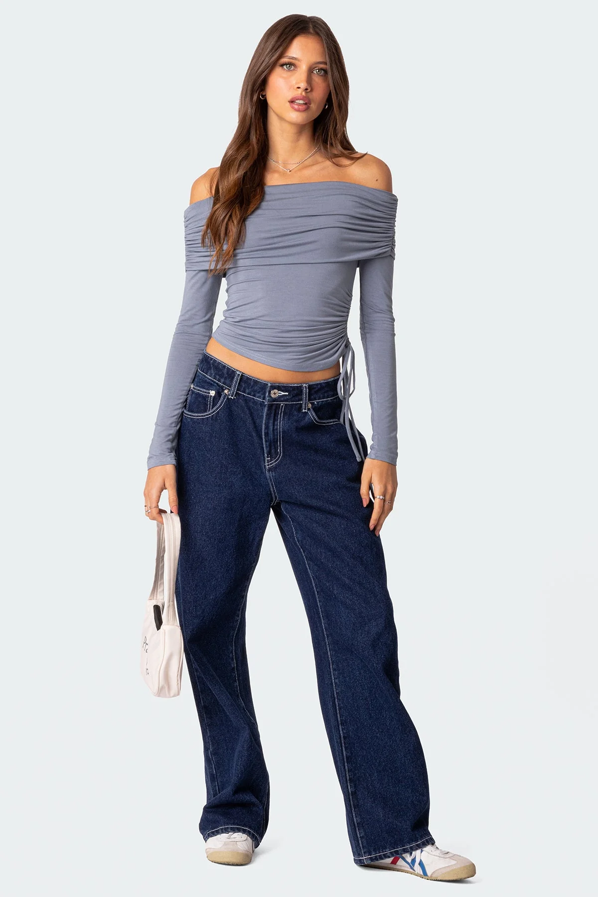 Elevate your casual wardrobe with this stylish blue gathered drawstring top. Featuring a fold-over neckline, adjustable side drawstring, and gathered detailing, this polyester and spandex top is both comfortable and chic. Perfect for everyday wear, this top is versatile and easy to style. Available in sizes XS, S, M, L, and XL. Model wears size S. Model height is 57. To keep this top looking its best, wash with similar colors.