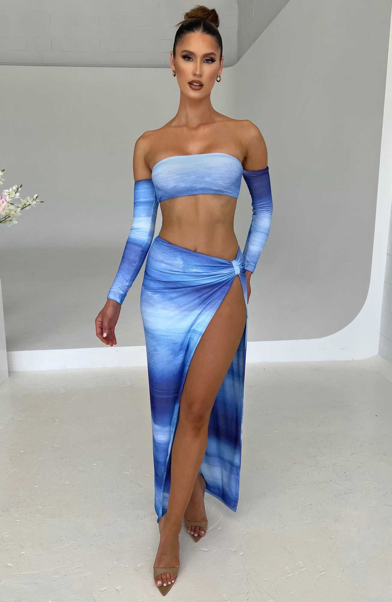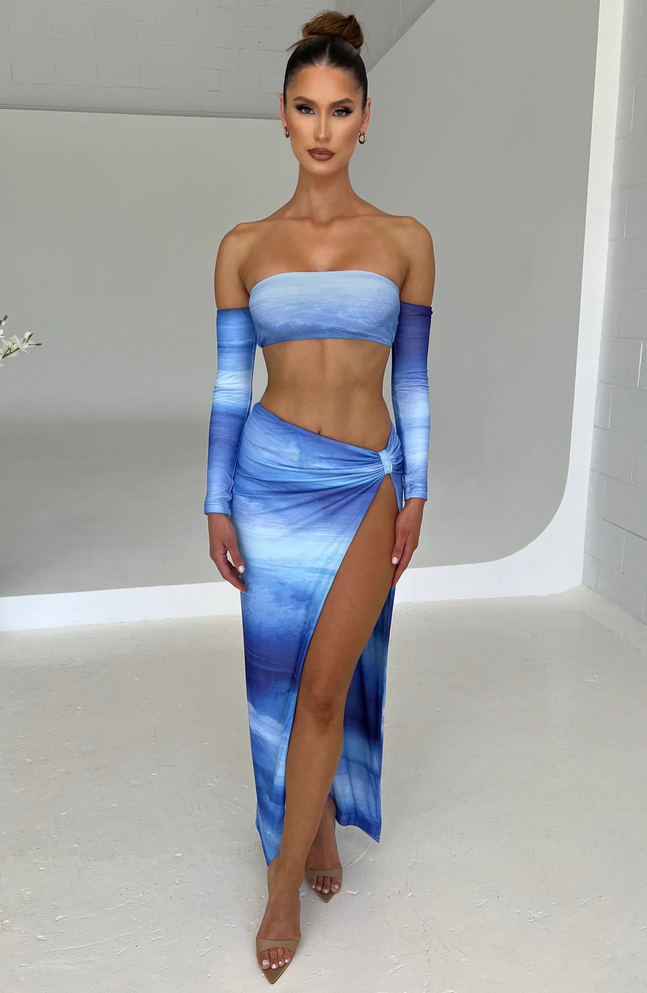 Elevate your style with the Blue Haze high-waisted mesh maxi skirt. Crafted from premium double-layered fabric, this skirt hugs your figure, featuring a stunning ultra-high split for effortless allure. Embrace elegance and pair it with the matching Brynn top, heels, and sleek hair. Available in XS to XXL sizes.