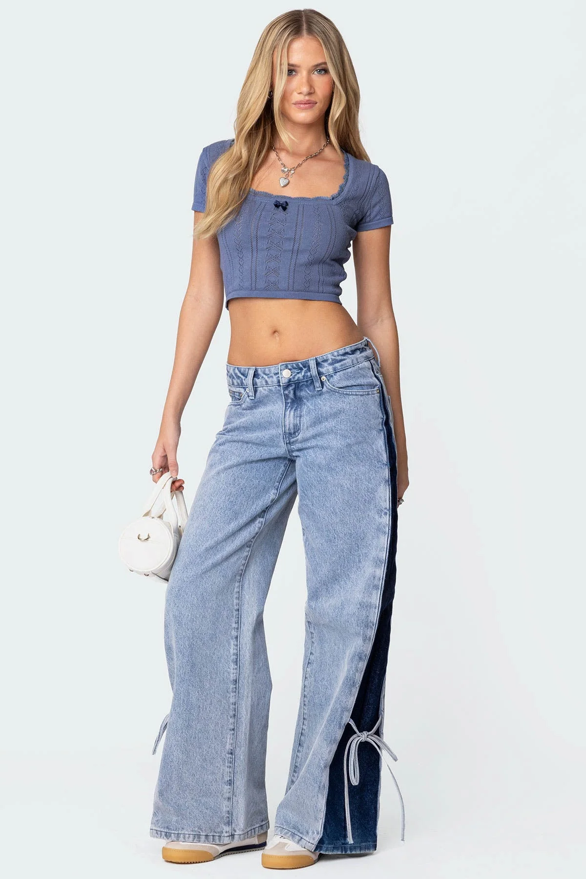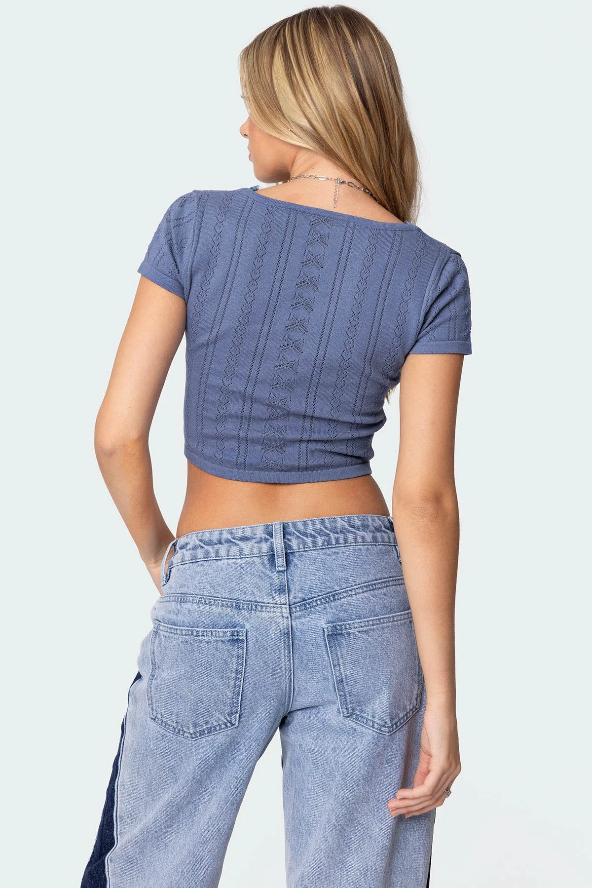 Elevate your wardrobe with our Blue Knit Crop Top featuring delicate lace trim, a charming center bow detail, and crafted from patterned knit fabric for a stylish look. Made of 100% cotton for comfort and breathability. This trendy top is perfect for any occasion. The model is wearing size S and is 58 tall. Care instructions: Machine wash cold, do not bleach, tumble dry low, iron on low heat, do not dry clean.