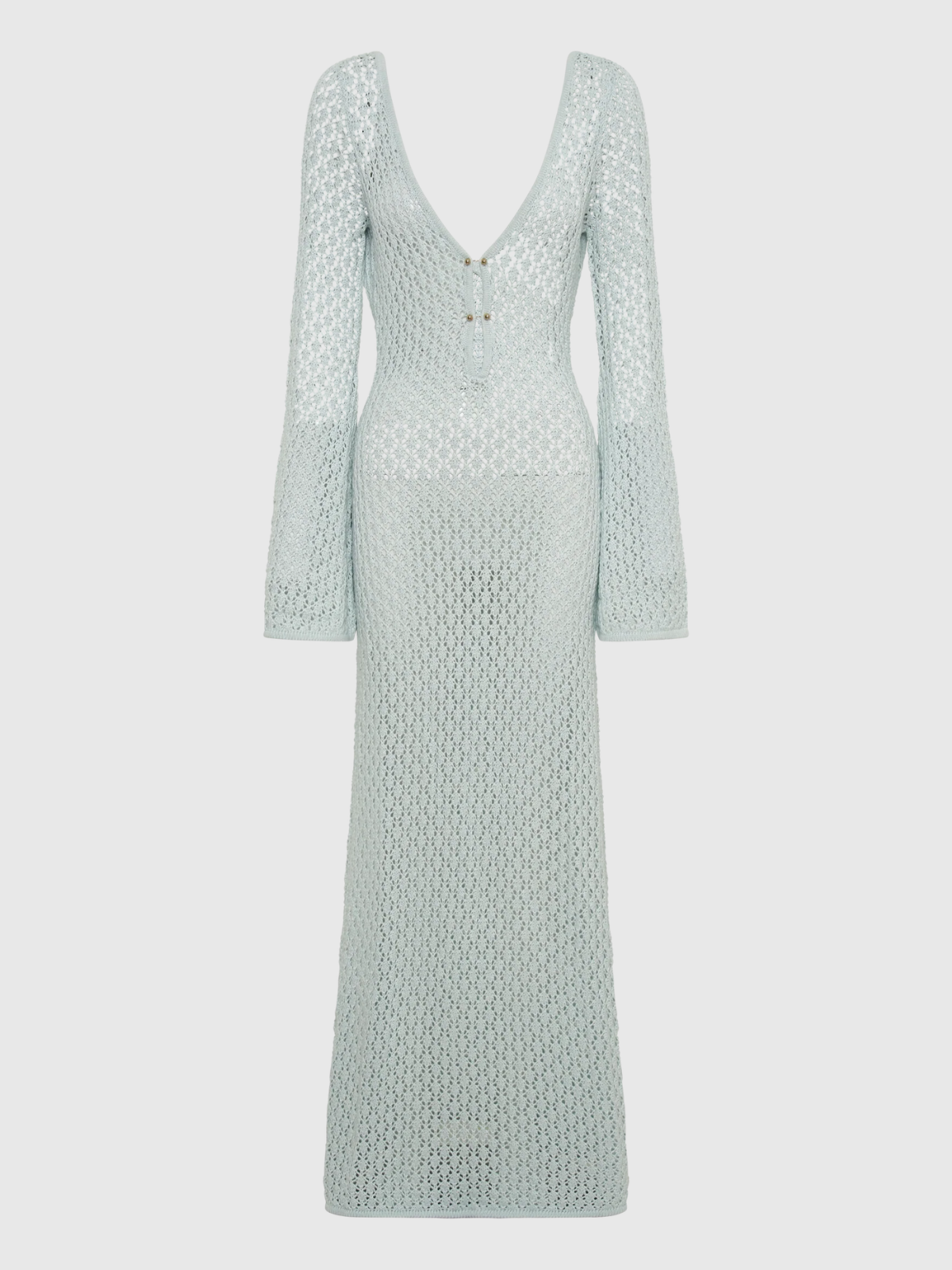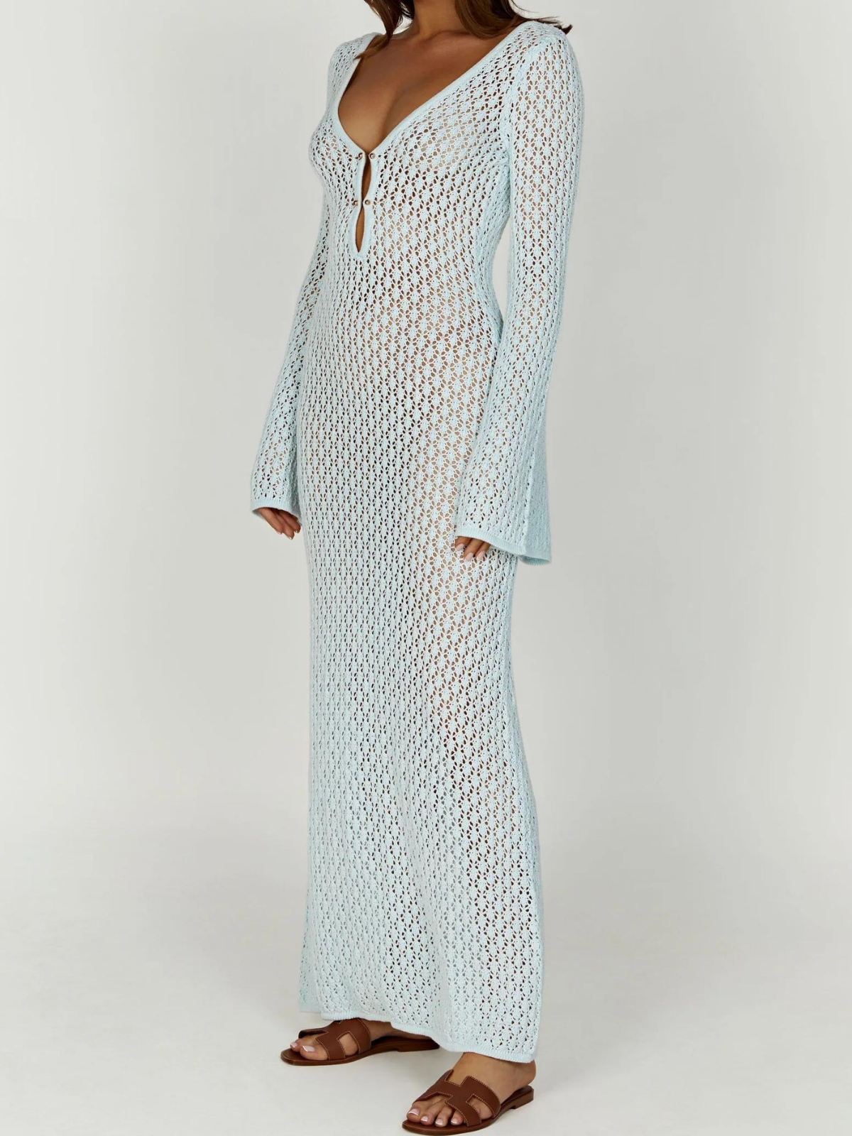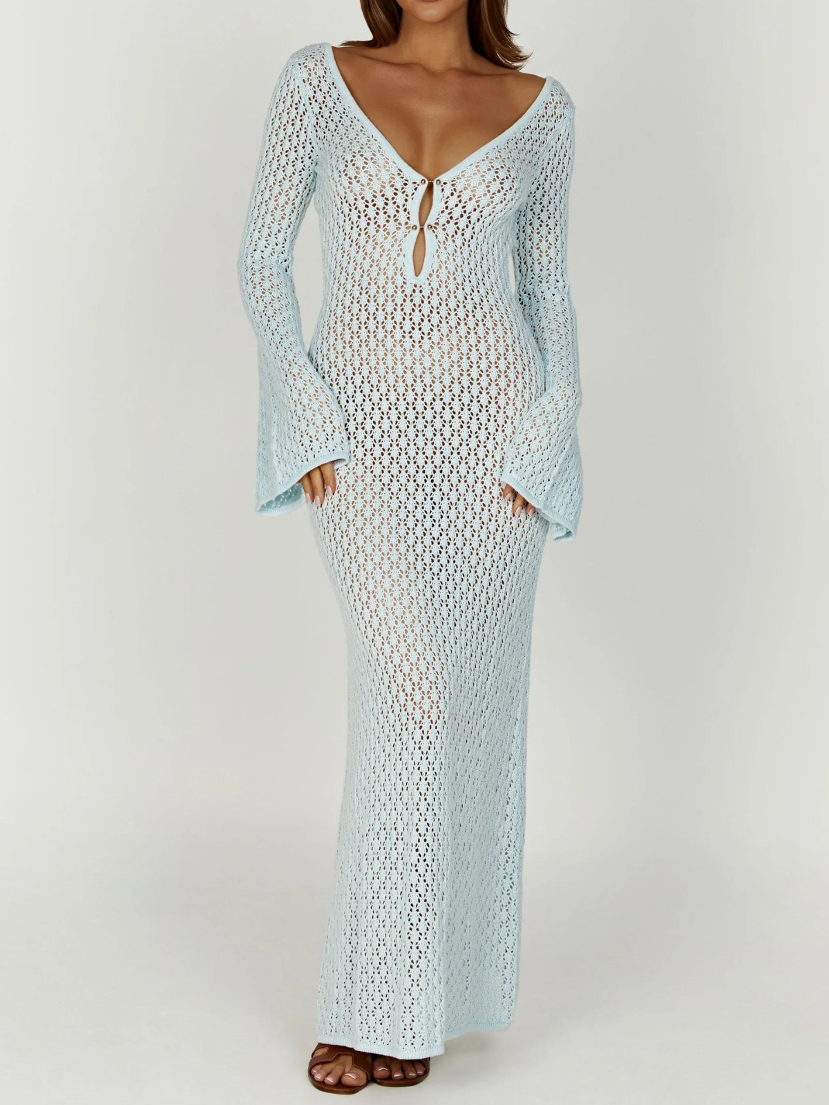 Indulge in sophistication with our Blue Knit Plunge Maxi Dress, perfect for special events. Crafted from premium knit fabric, this dress showcases a striking plunging neckline and intricate hollow designs that guarantee youll steal the spotlight. Its figure-flattering silhouette offers both comfort and style. Wear it with confidence, hand wash cold for lasting beauty. Mix of 100% Polyester material. Catch the tone subtly `Eventful Blue` due to varied lighting in preview pictures (excludes model).