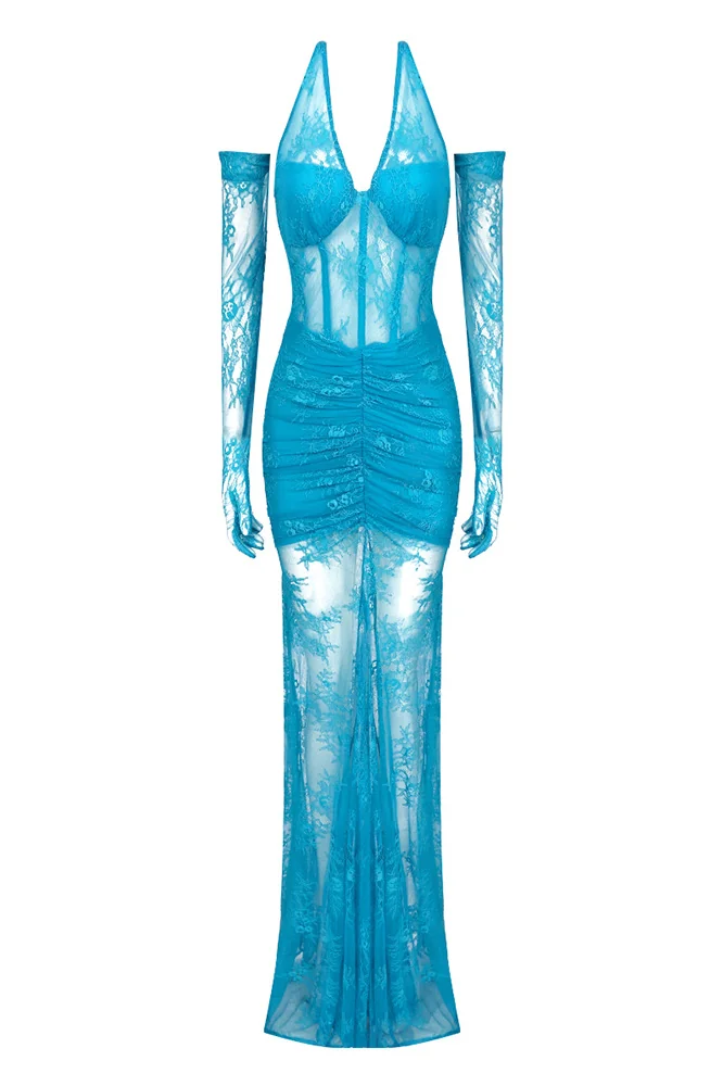 Make a lasting impression at your next event with the Blue Lace Halterneck Maxi Dress. This elegant dress is crafted from translucent floral lace with waist mesh panels, featuring a flattering bodice and a draped skirt that highlights the legs beautifully. The dress has a zipped back closure and is lined with 98% polyester and 2% elastane for comfort. Care instructions include dry cleaning to maintain the materials quality. The color may vary slightly due to lighting effects in images. Refer to our size chart for the perfect fit – this dress runs true to size.
