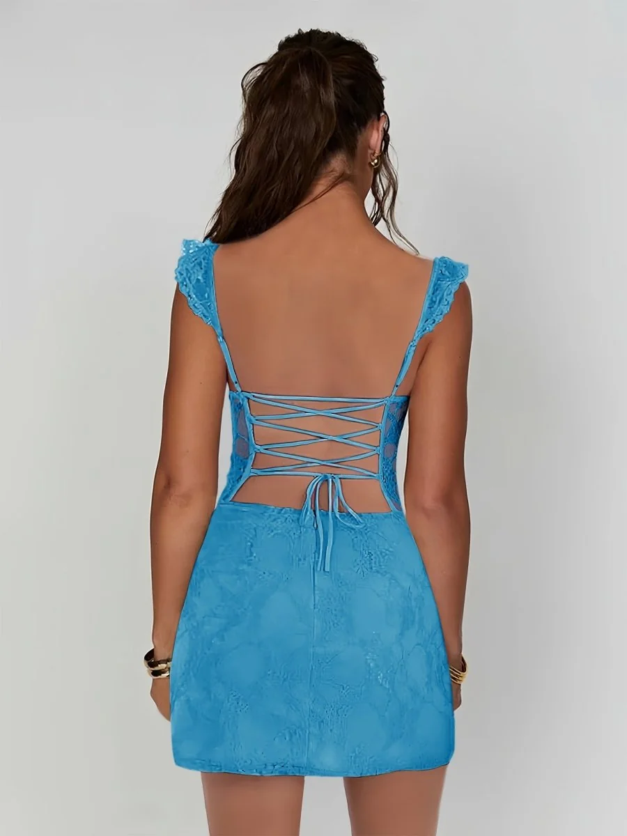 Elevate your style with this exquisite lace sheath mini dress featuring spaghetti straps, a sleeveless design, and a flattering slit detail. Available in lilac, yellow, white, and blue, this dress accentuates your shoulders and offers a perfect fit with a lace-up back. Ideal for homecoming, evening events, and special occasions, this short dress exudes elegance and charm. Crafted from quality lace fabric, this dress ensures a stunning look every time you wear it.