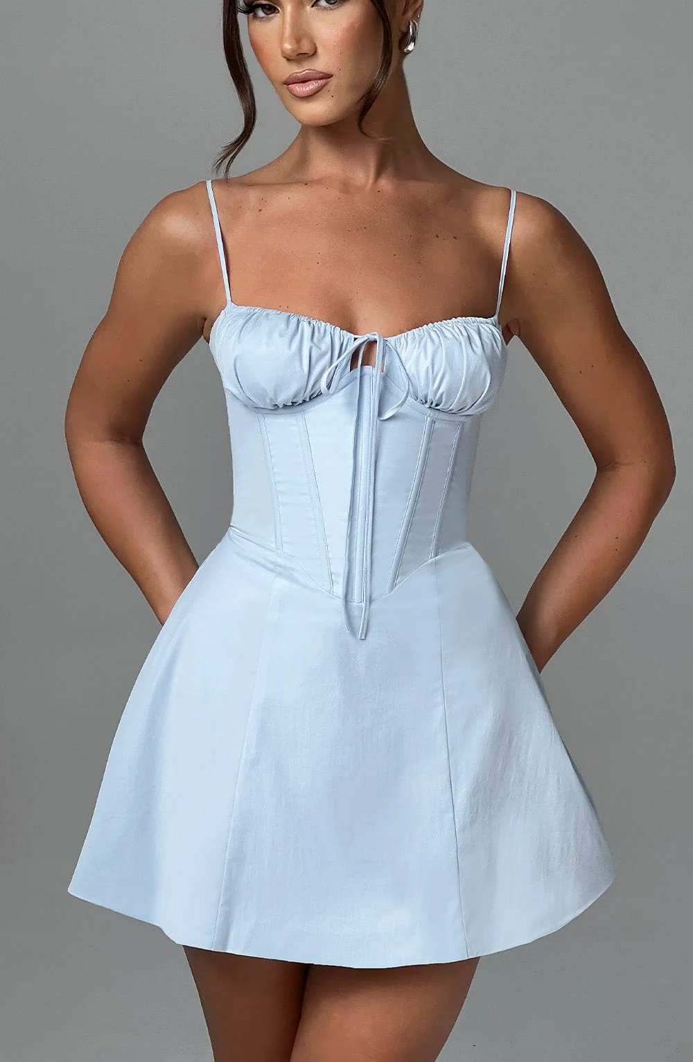 Indulge in the charm of our Blue Mini Corset Dress with Lace-Up Detail. Crafted from a premium non-stretch cotton blend, this dress features underwired cups, boning in the bodice, and a flattering waist-cinching design. The delicate tie detail, adjustable straps, and lace-up back add a touch of elegance. Ideal for parties, weddings, or festive occasions. Embrace confidence and style with this mini dress. Available in sizes XS, S, M, L, XL, and XXL.