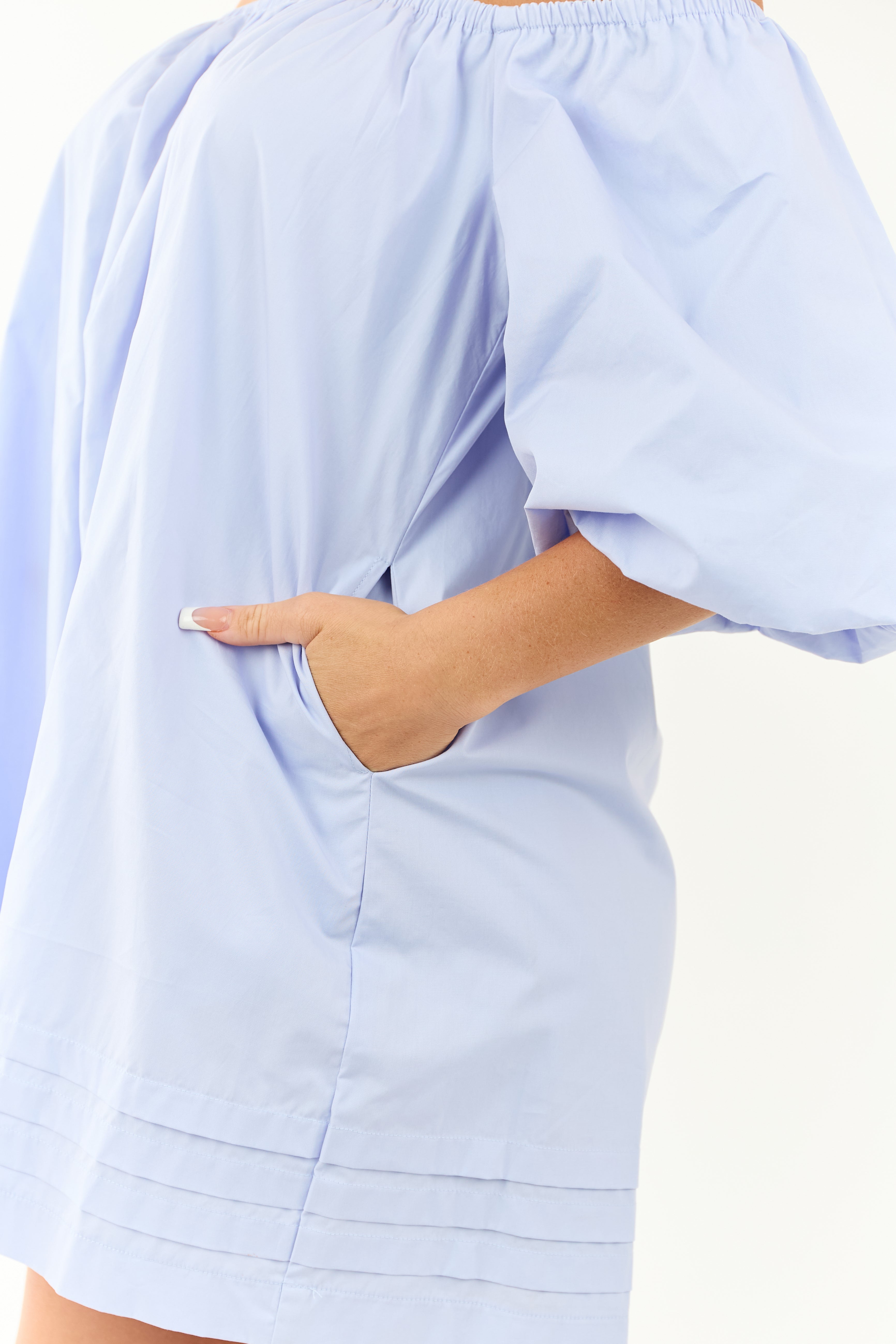 Indulge in the flirty elegance of this blue off-the-shoulder cotton mini dress! Crafted from lightweight cotton with an elastic neckline and cuffs, this dress features half puff sleeves, side pockets, and a relaxed tent fit. Perfect for summer, the ultra-mini length adds a touch of playfulness to your outfit. This garment is lined and suited for various occasions from casual outings to special events. Embrace comfort and style effortlessly with this must-have piece.