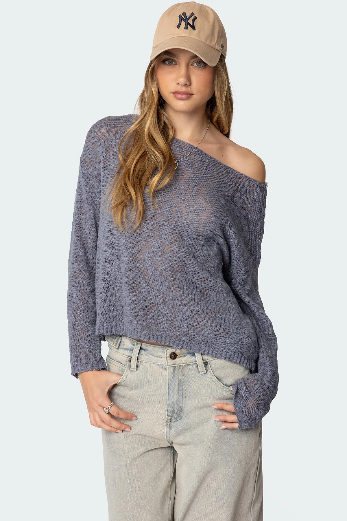 Stay warm and stylish with our Blue Oversized Boat Neck Sweater. This sweater features a comfortable oversized fit, raw hem, and sheer knit fabric for a trendy look. Made of cotton and acrylic, it is easy to care for and perfect for everyday wear. Available in sizes XS to XL, and perfect for layering over your favorite tops.