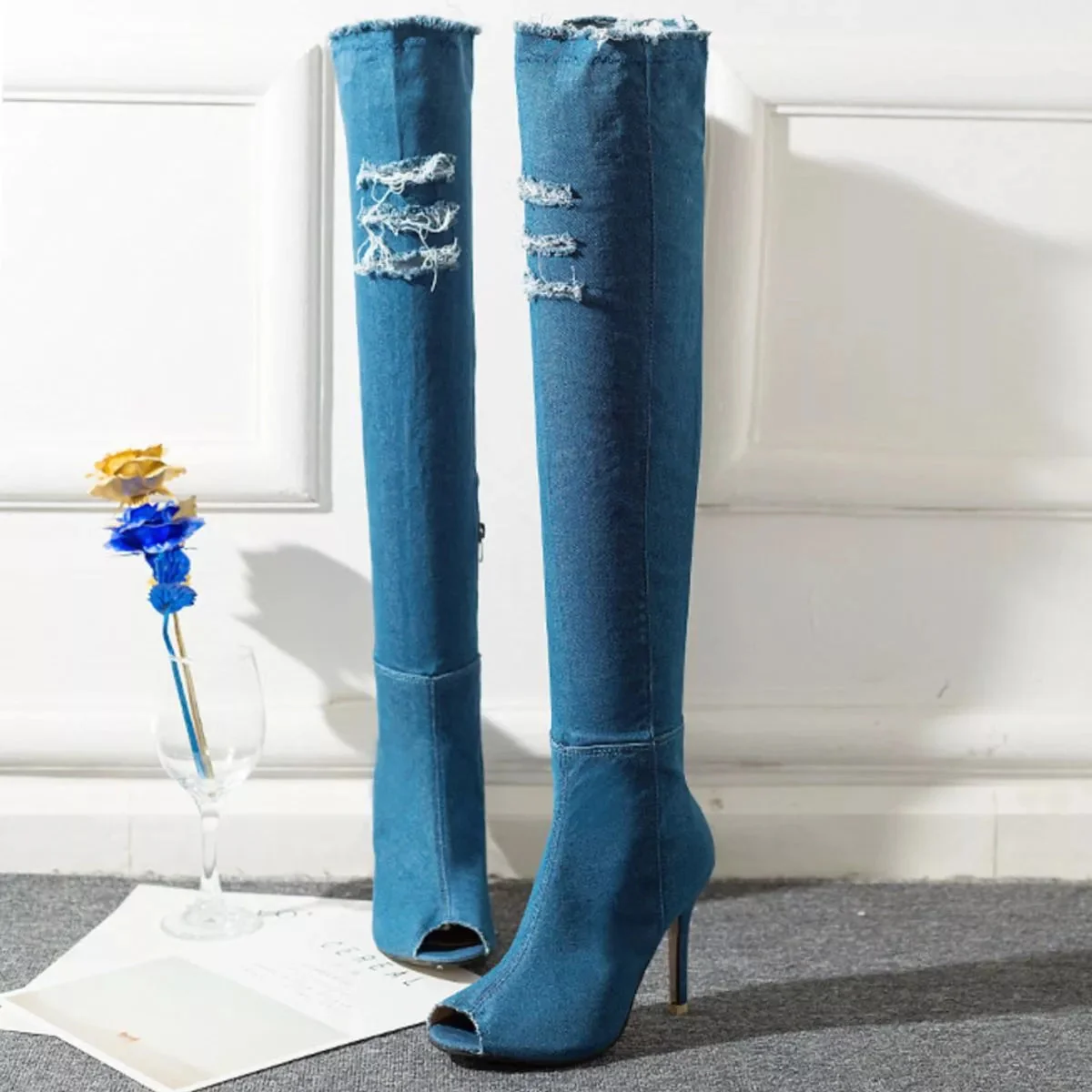These Blue Peep Toe Stiletto Boots are a must-have for fashion-forward individuals. The fit is true to size, so order your usual size for a perfect fit. Made of high-quality PU Leather, Canvas, and Rubber, these boots are both stylish and comfortable. Elevate your outfit with these glamorous high heels. Please note that the box is not included in the shipment. Imported. Product Measurements (Measurements by inches) & Size Conversion: Size Foot length 35(US4) 8.8, 36(US5) 9, 37(US6) 9.2, 38(US7) 9.4, 40(US9) 9.8, 41(US10) 10