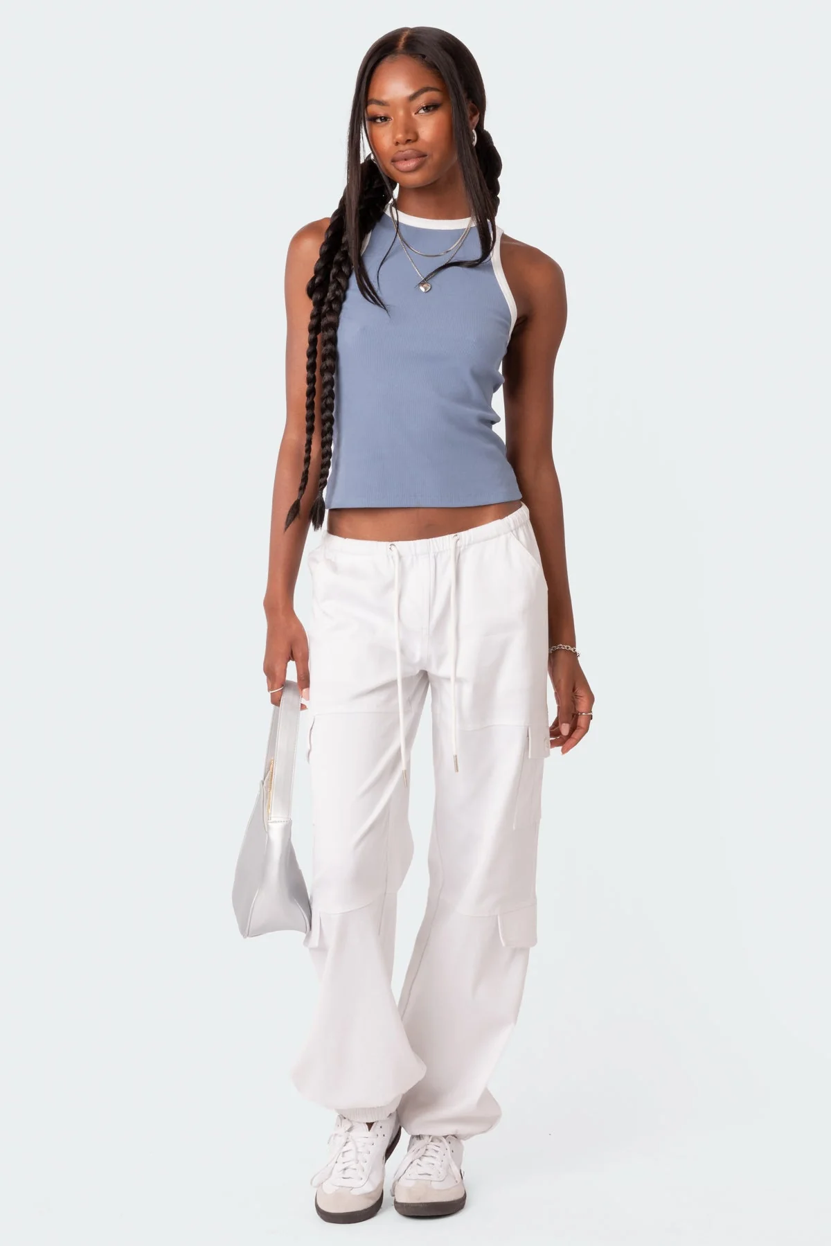 Stay stylish and cool with our Blue Ribbed Cotton Tank Top. Made of a blend of Cotton, Polyester, and Spandex, this tank features contrast binding for added flair. Perfect for everyday wear, this ribbed tank is a must-have in every fashion-forward wardrobe. Model is 59 and wears size S. Care instructions: Machine wash cold with like colors.