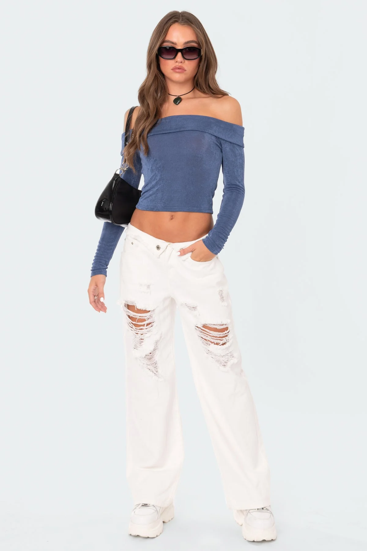 Indulge in the trendy Athena Blue Slinky Fold Over Top designed with an off-shoulder neckline for a chic look. This long sleeve top crafted from polyester and spandex offers a flattering fit. Elevate your style effortlessly with this must-have piece. Model showcases size S and height is 57. Care instructions: Machine wash cold with similar colors.