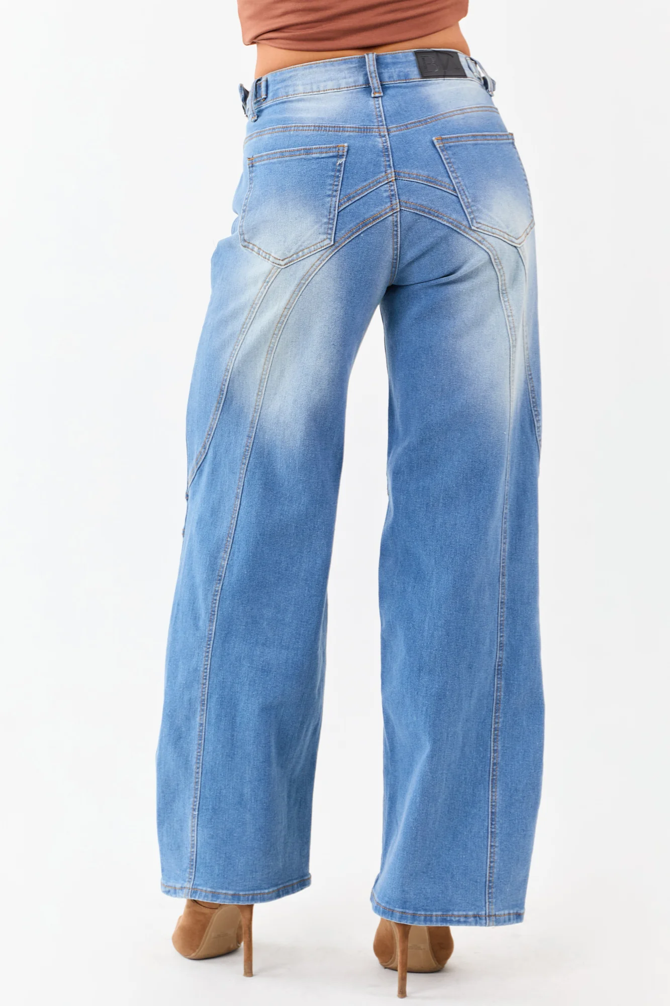 Discover the perfect blend of style and comfort with our blue stone-washed wide-leg denim jeans. Seam detailed with adjustable waist straps for a custom fit, these jeans feature a super high-rise design and stretchy denim that hugs your curves. Imported and made from 65% cotton, 33% polyester, and 2% spandex, these jeans are a must-have for any fashion-forward wardrobe. With five pockets, zipper fly, button closure, belt loops, and an inseam of 31 inches, these jeans are as practical as they are stylish. Fits true to size, forgiving in the waist.