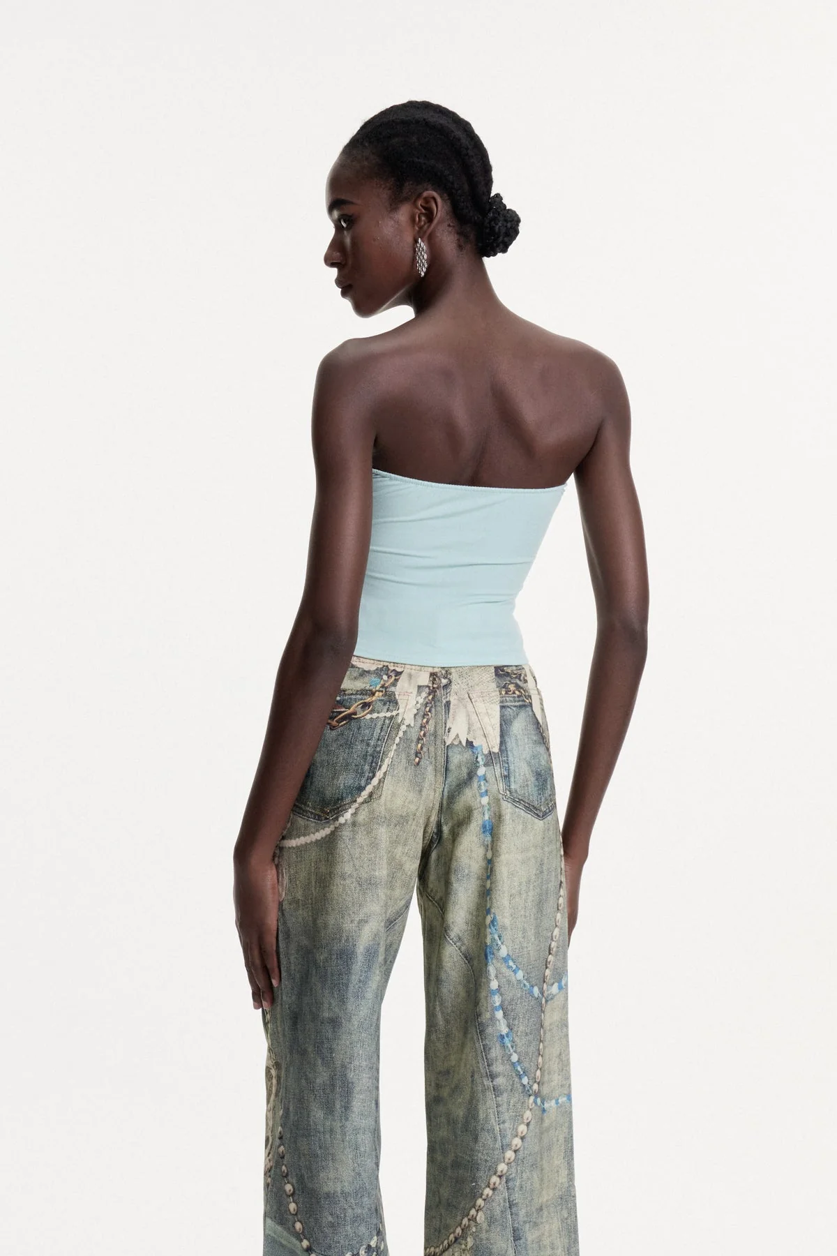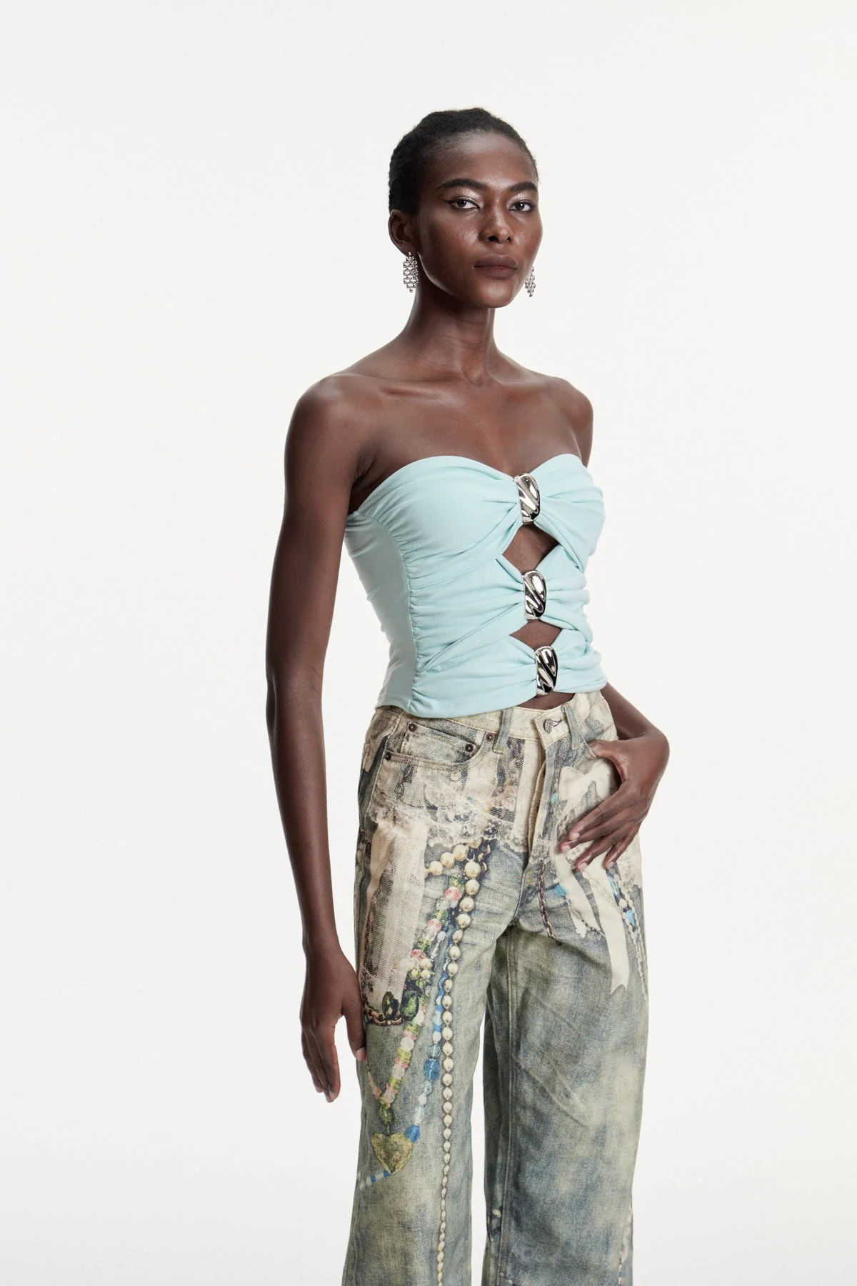 Indulge in the sophistication of the Blue Strapless Cutout Top . This versatile piece combines a seamless strapless design with strategically placed cutouts, adding visual allure to any ensemble. Crafted for both style and comfort, it pairs effortlessly with different bottoms, becoming a staple in contemporary wardrobes. Enjoy a slight stretch for a personalized fit. Elevate your urban edge with this trendy essential. Clean with a gentle machine wash. Due to lighting, color variations may occur. Discover unmatched elegance with this striking top!