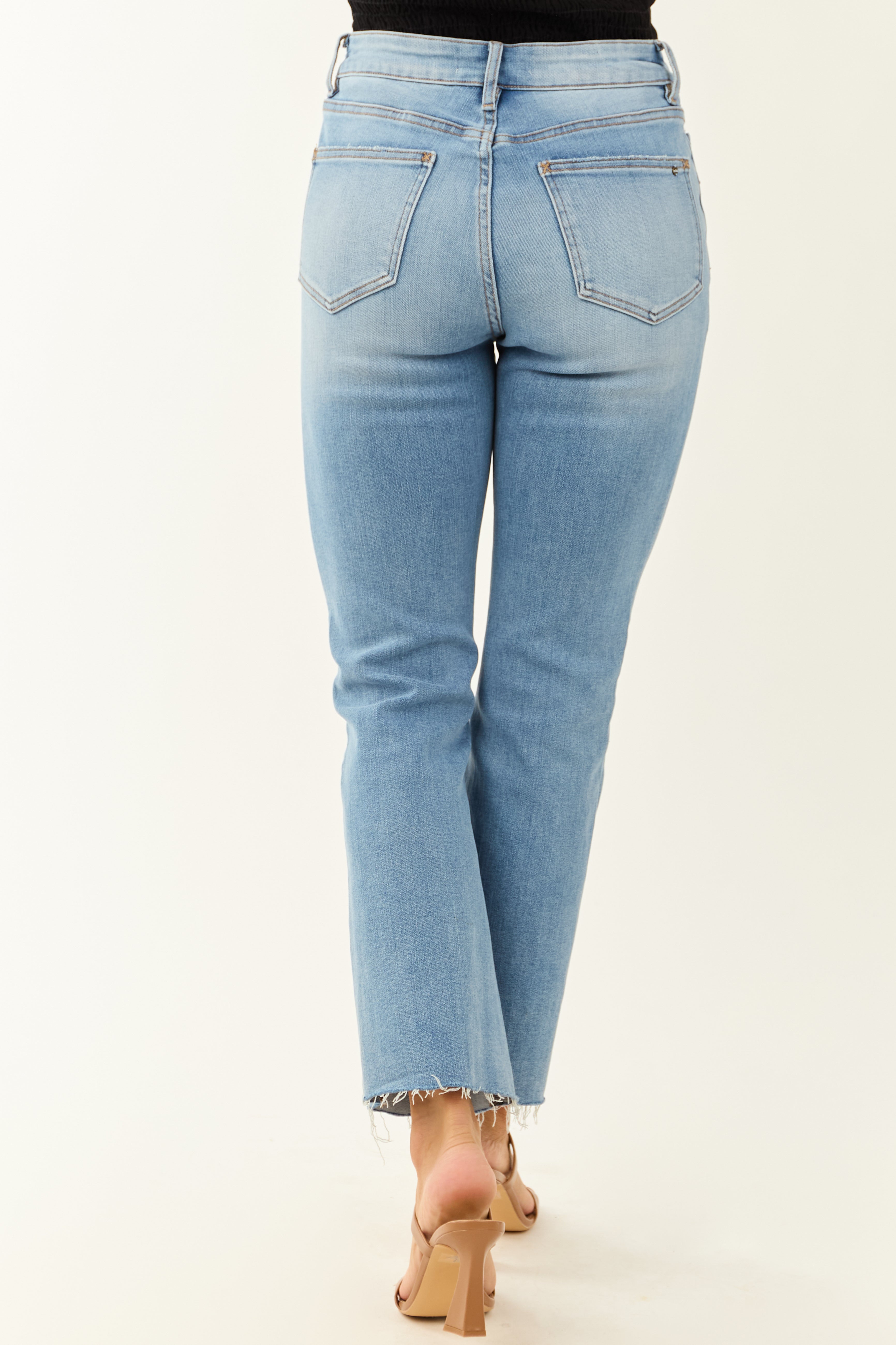 These Blue Stretchy Bootcut Jeans feature a V-waist yoke detail that accentuates your curves. The raw hem adds a trendy touch while maintaining comfort with stretchy denim. Enjoy a high-rise fit that complements your figure. Crafted from 61% Cotton, 33% Polyester, 3.5% Viscose Rayon, and 2.5% Spandex, these versatile jeans are perfect for any occasion. Feel confident and stylish with these ankle-length jeans adorned with slight distressing and five functional pockets. Available in waist sizes ranging from 24 to 32.