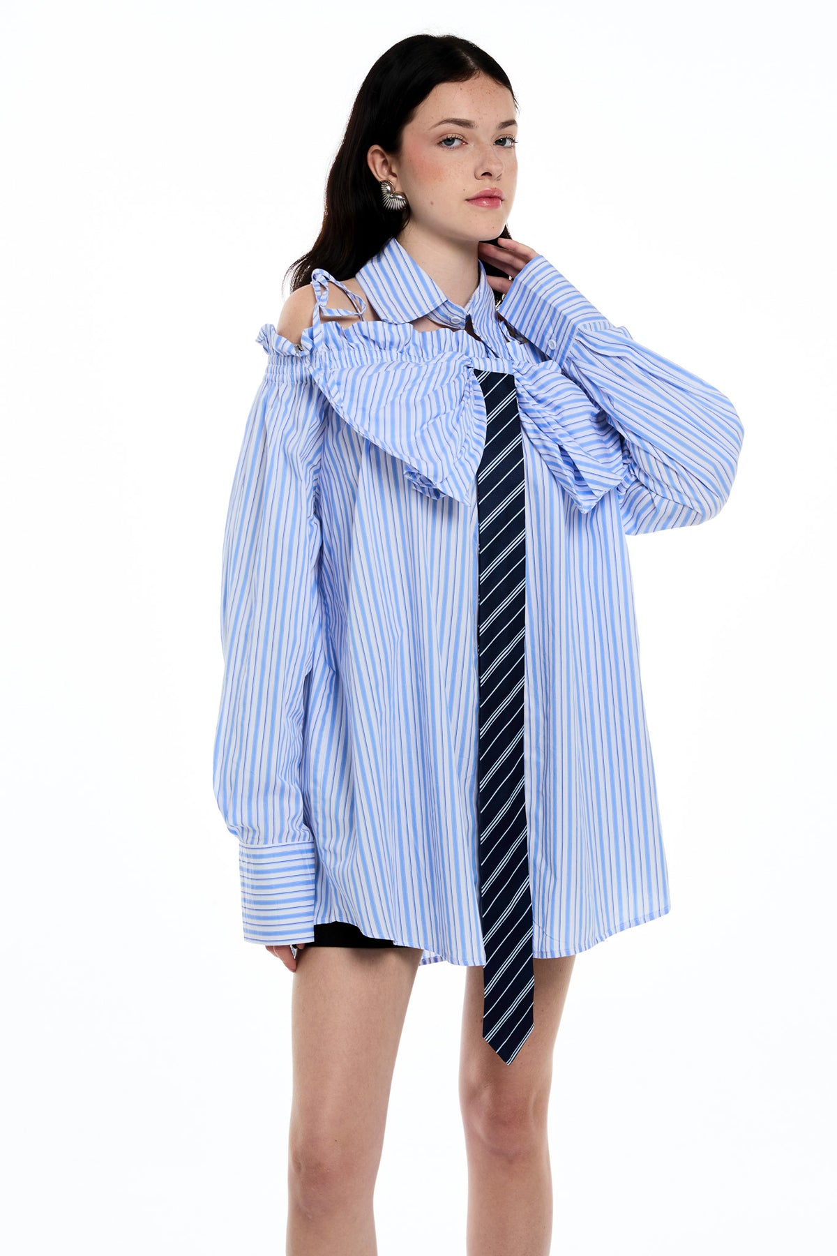 Elevate your wardrobe with the Blue Stripe Two-Piece Bow Top Shirt. This expertly crafted set features delicate bow details, blending classic stripes with contemporary style. Perfect for casual or semi-formal occasions, this versatile top pairs effortlessly with various bottoms. The breathable fabric ensures all-day comfort and a polished appearance. Whether for a refined or approachable look, this shirt is a perfect choice. Note: Color may vary due to lighting on images. Stretch Factor: Non-Stretch. Cleaning: Gentle machine wash.