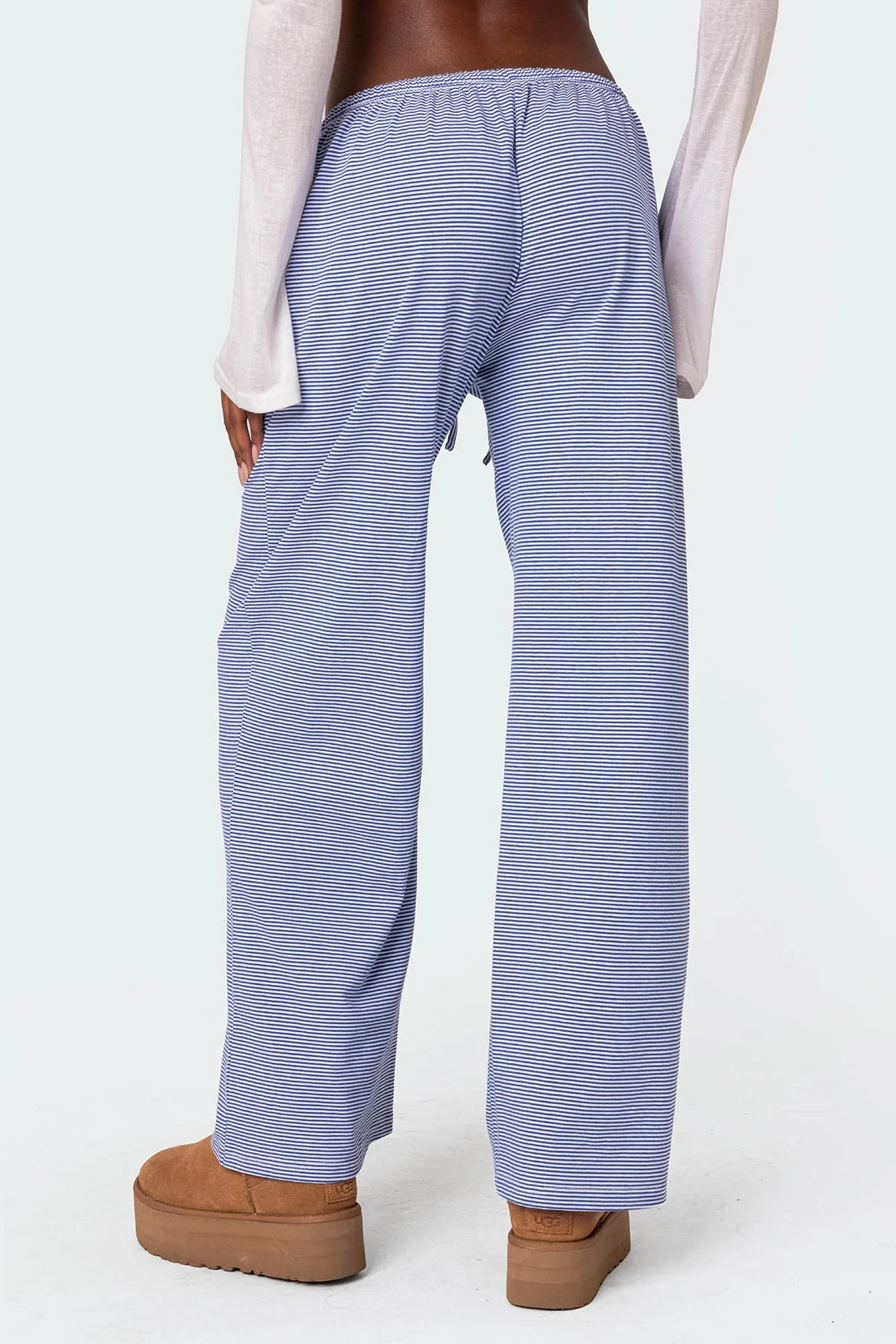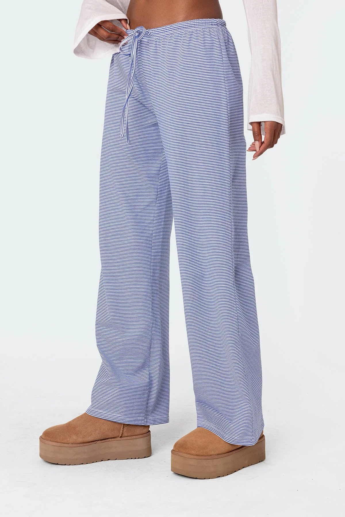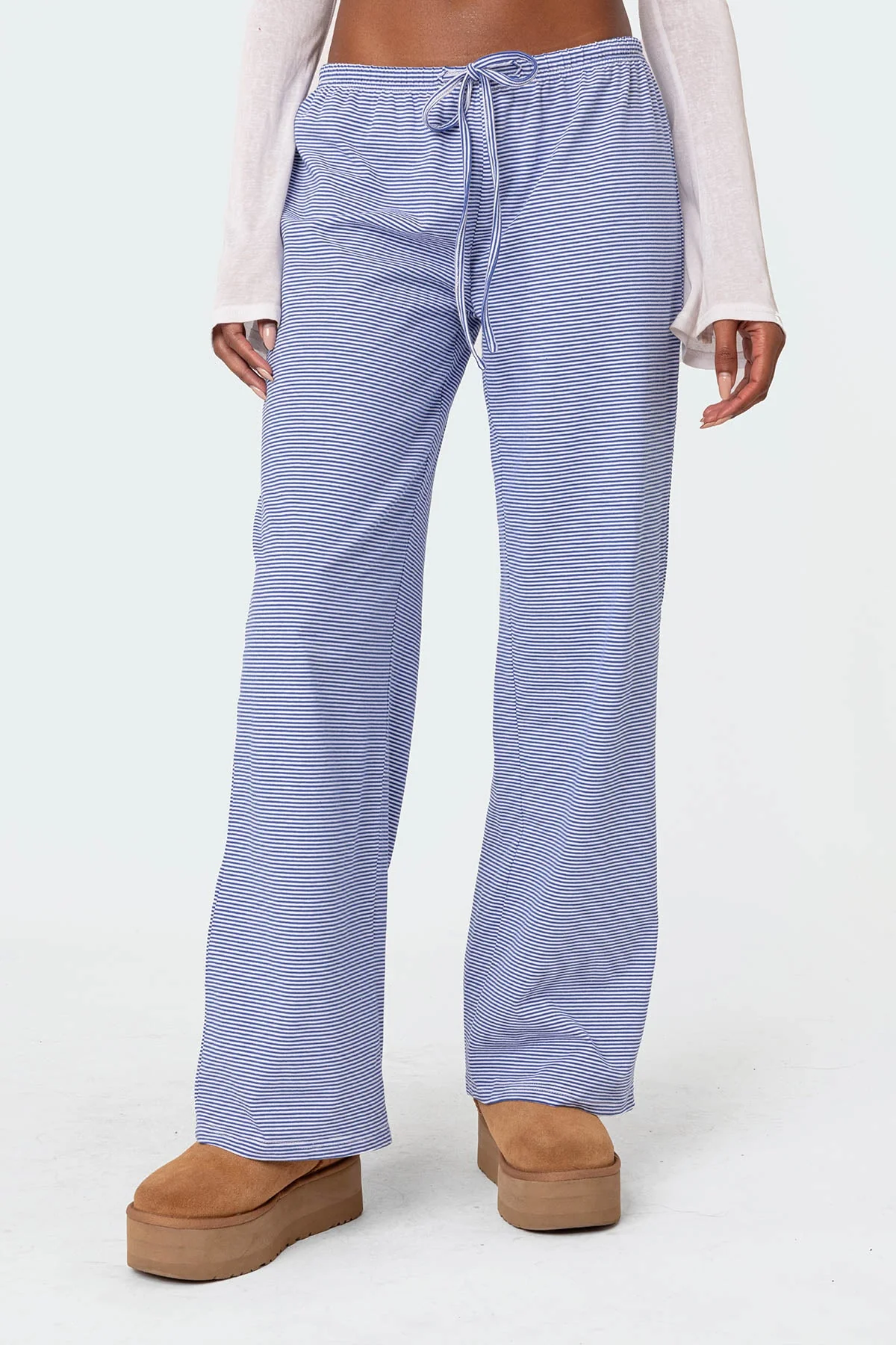 Indulge in comfort with our blue striped lounge pants featuring a loose fit design and adjustable tie waist for a personalized look. Made from a blend of cotton and spandex, these pants ensure both style and ease of movement. The striped pattern adds a touch of playful charm to your loungewear collection. Care Instructions: Machine wash with similar colors. For a Petite version, click the provided link below.