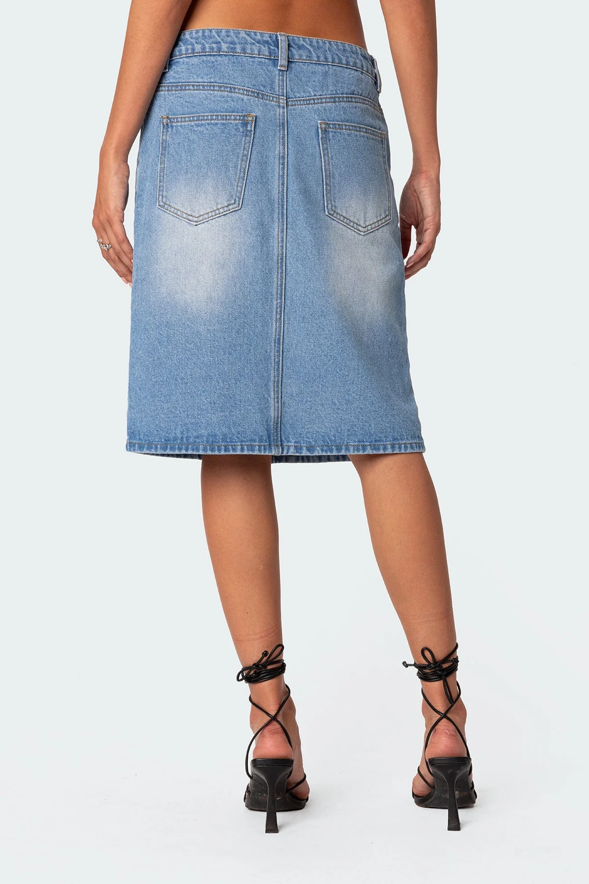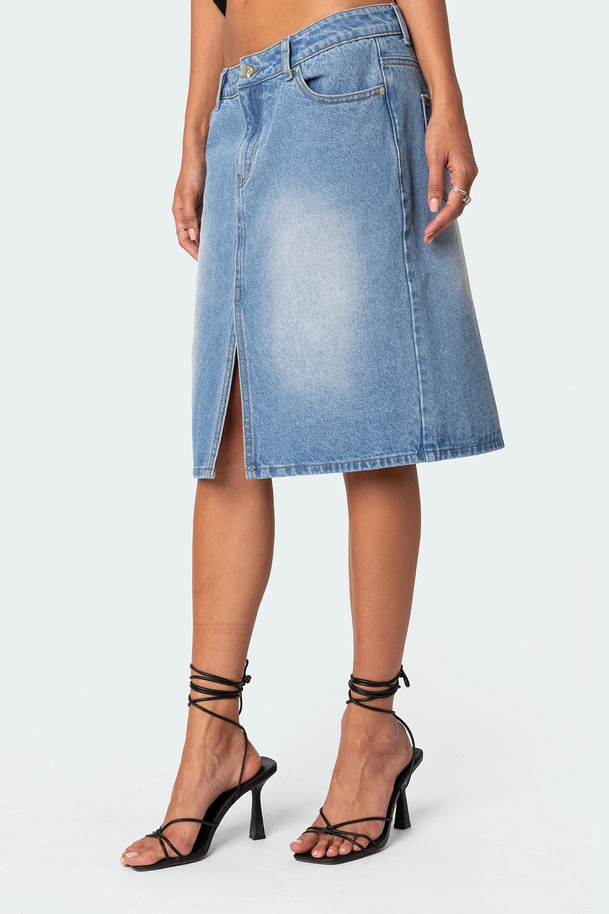 Indulge in the classic charm of our Blue Washed Denim Midi Skirt, crafted from 100% cotton for supreme comfort. Featuring a front slit for a touch of sophistication. This versatile piece complements any occasion effortlessly. Pair with your favorite top for a chic ensemble. Available in sizes XS to XL.