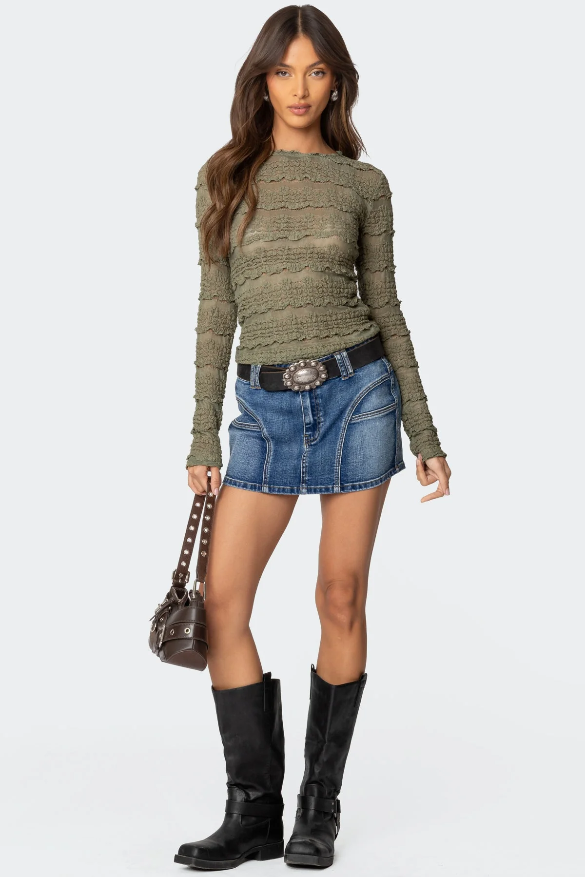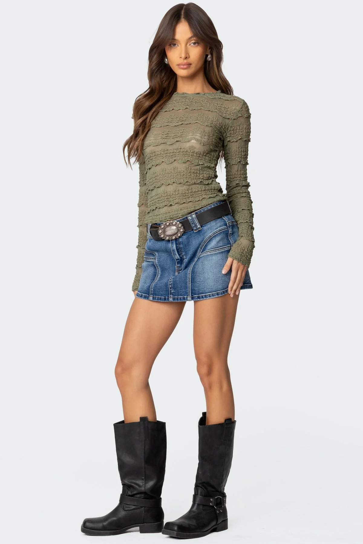 Elevate your style with our Blue Washed Denim Mini Skirt featuring stitch detailing and a stretchy fabric blend of cotton and spandex. This versatile skirt is a must-have in every fashion-forward wardrobe. Pair it effortlessly with tops of your choice for a trendy look. Model wears size S and is 59 tall. Care instructions: Machine wash in cold water, tumble dry on low heat, iron on low, do not bleach or dry clean. Add this chic mini skirt to your collection today!