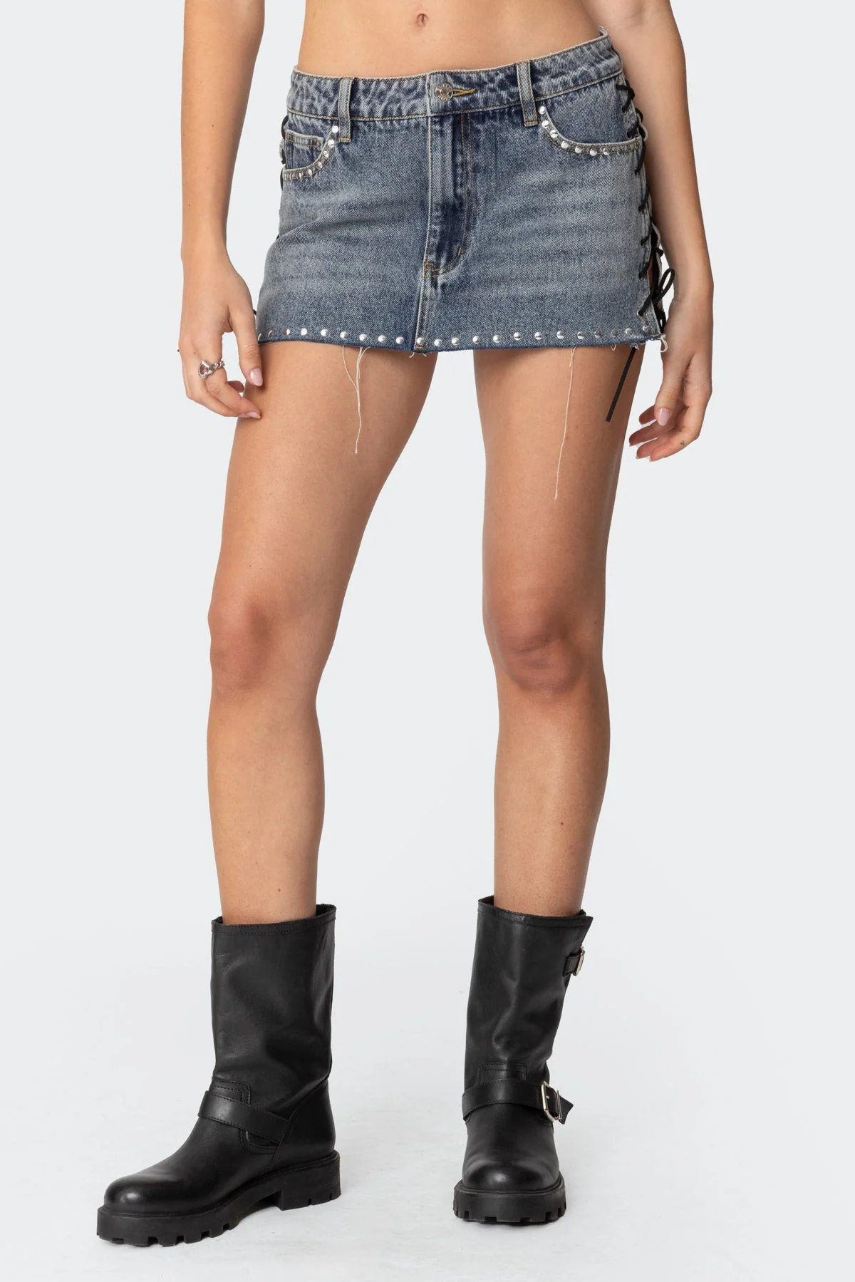 Stay stylish with our Blue Washed Denim Mini Skirt featuring faux suede lace-up detailing, studded hemline, and pockets. Made of cotton denim, this skirt is comfortable and trendy. Machine wash at max 30ºC for easy care.