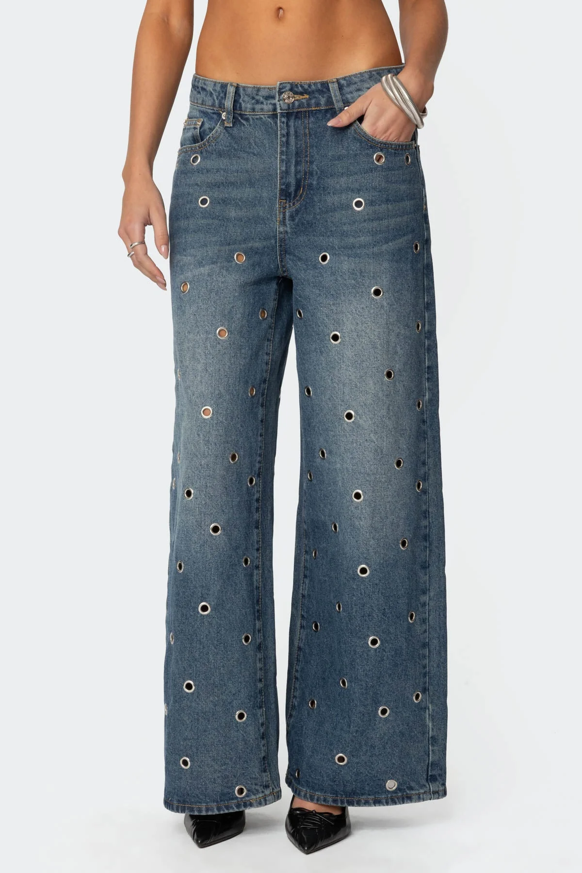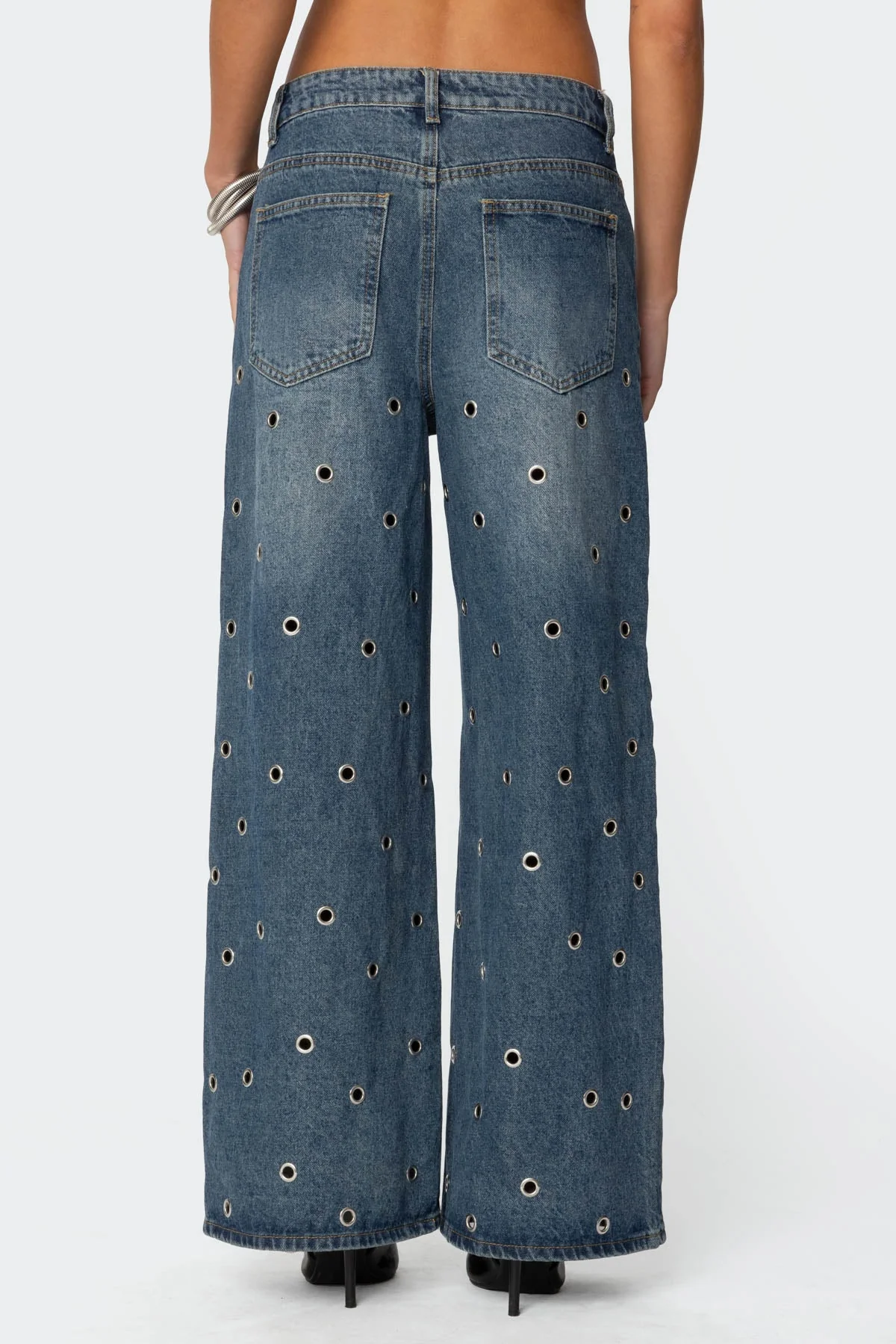 Discover ultimate comfort and style with our Blue Washed Grommet Low Rise Jeans. Crafted from premium 100% Cotton denim, these straight-leg pants feature stylish grommet detailing. Enjoy a flattering low-rise waist fit, perfect for everyday wear. Pair with your favorite tops for a chic look. Machine washable for easy care.