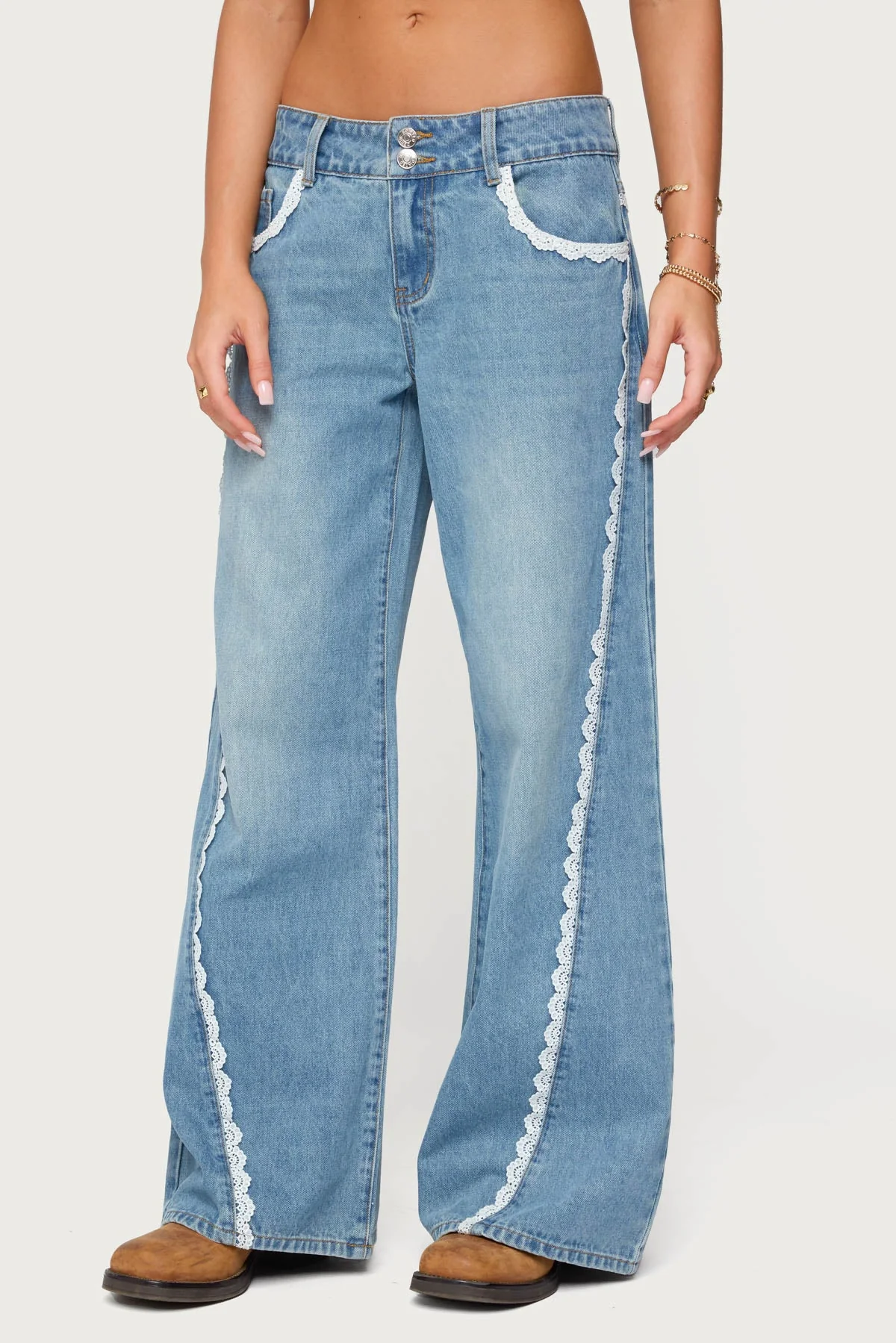 Experience chic comfort with our Blue Washed Low Rise Wide Leg Jeans. Crafted from 100% Cotton denim, these jeans feature a double-button closure, lace detailing, and a wide leg fit for a trendy look. Perfect for any occasion, this versatile piece is a wardrobe essential. Model height is 58, wearing size S with an inseam of 31.1 inches. Easy care instructions: Machine wash cold, tumble dry low, iron on low heat. Say goodbye to style compromises with our premium jeans!