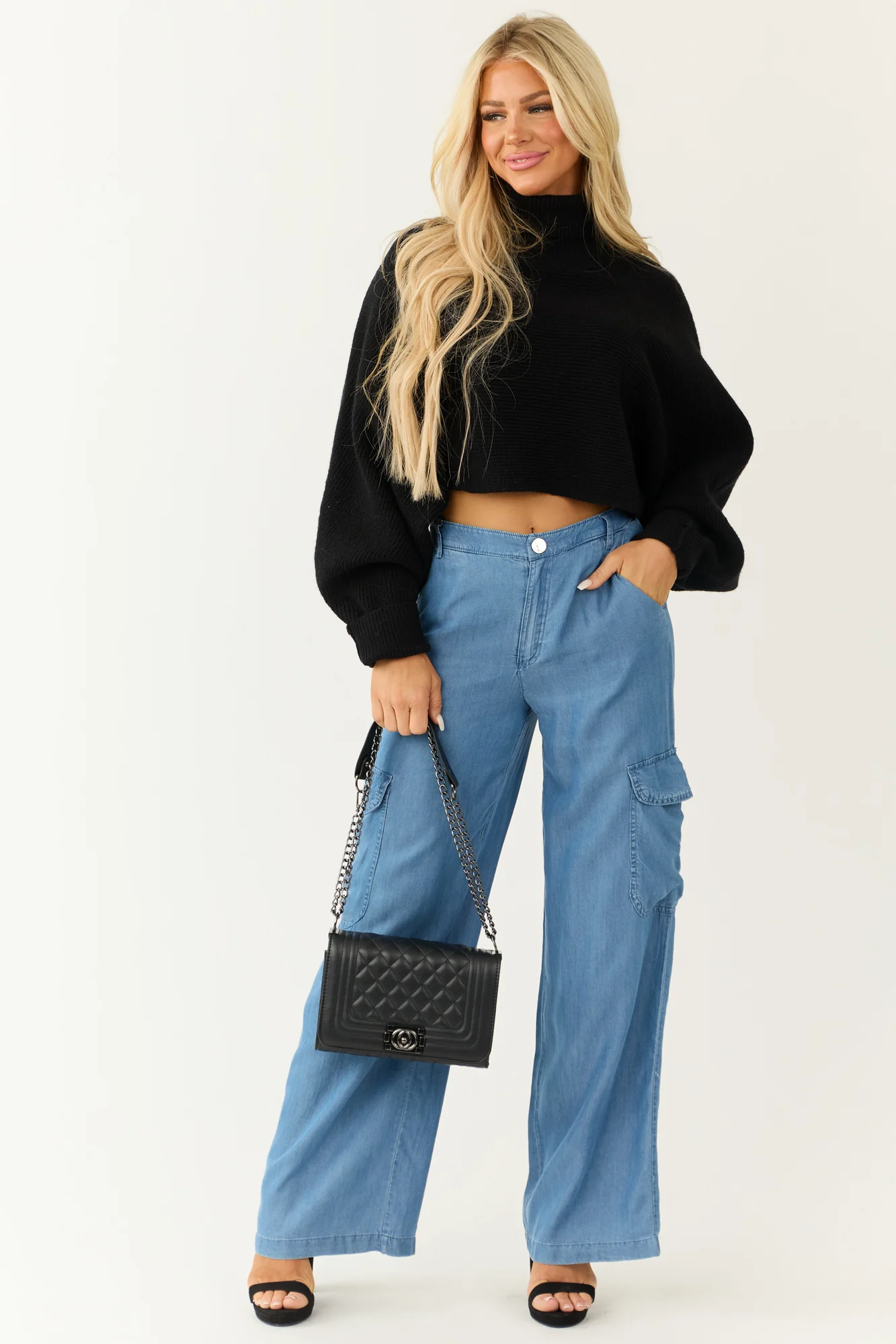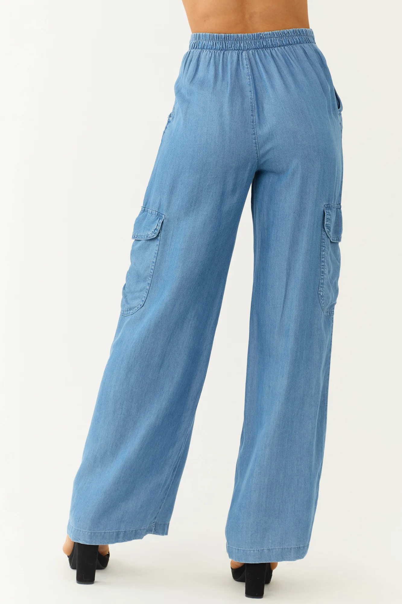 Upgrade your wardrobe with our stylish Blue Wide Leg Cargo Pants. Available in sizes Small, Medium, and Large, with a non-stretchy woven fabric for a comfortable fit. The elastic waistband provides extra room, and the zippered fly with button closure ensures convenience. Featuring side pockets, cargo pockets, belt loops, and a wide leg design, these pants are perfect for any casual occasion. Crafted from 100% Lyocell, these pants are both trendy and practical. Care Instructions: Hand wash cold, do not bleach, iron low, and dry flat. Model is wearing a size Small. Model’s Profile: Size 1, Height 57″, Bust 34″, Waist 26″.