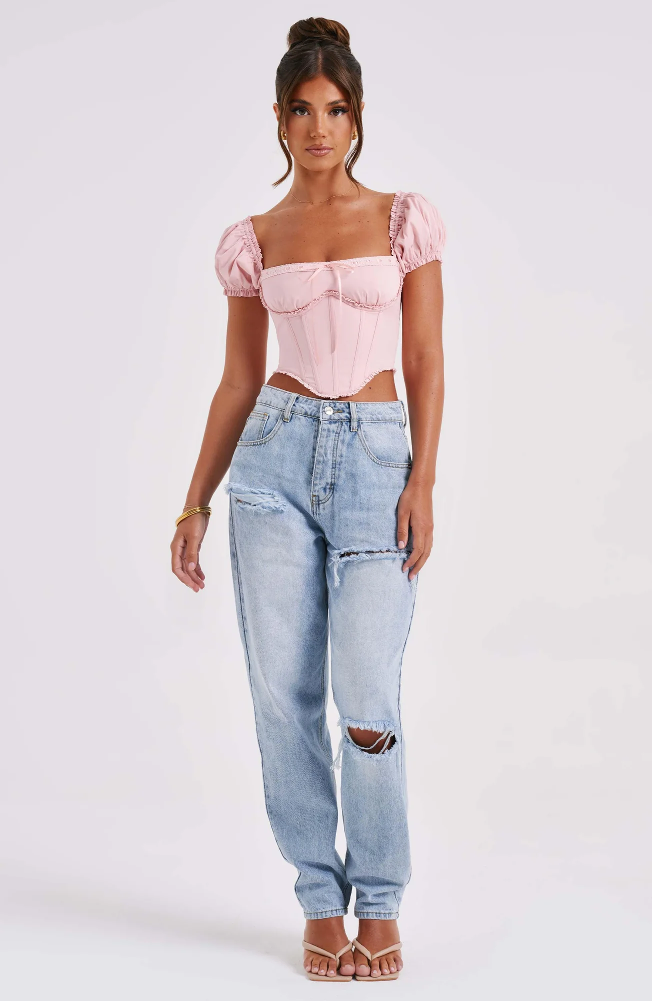 Experience the must-have milkmaid corset top trend with our Matilda Corset in luxurious blush color. Made of premium non-stretch cotton, this underwired top features dreamy puffed sleeves, waist-cinching design, pretty tie detail, and a flattering cropped length with a dipped hem. Perfect with denim and mule heels for any occasion. Available in sizes XS to XXL.