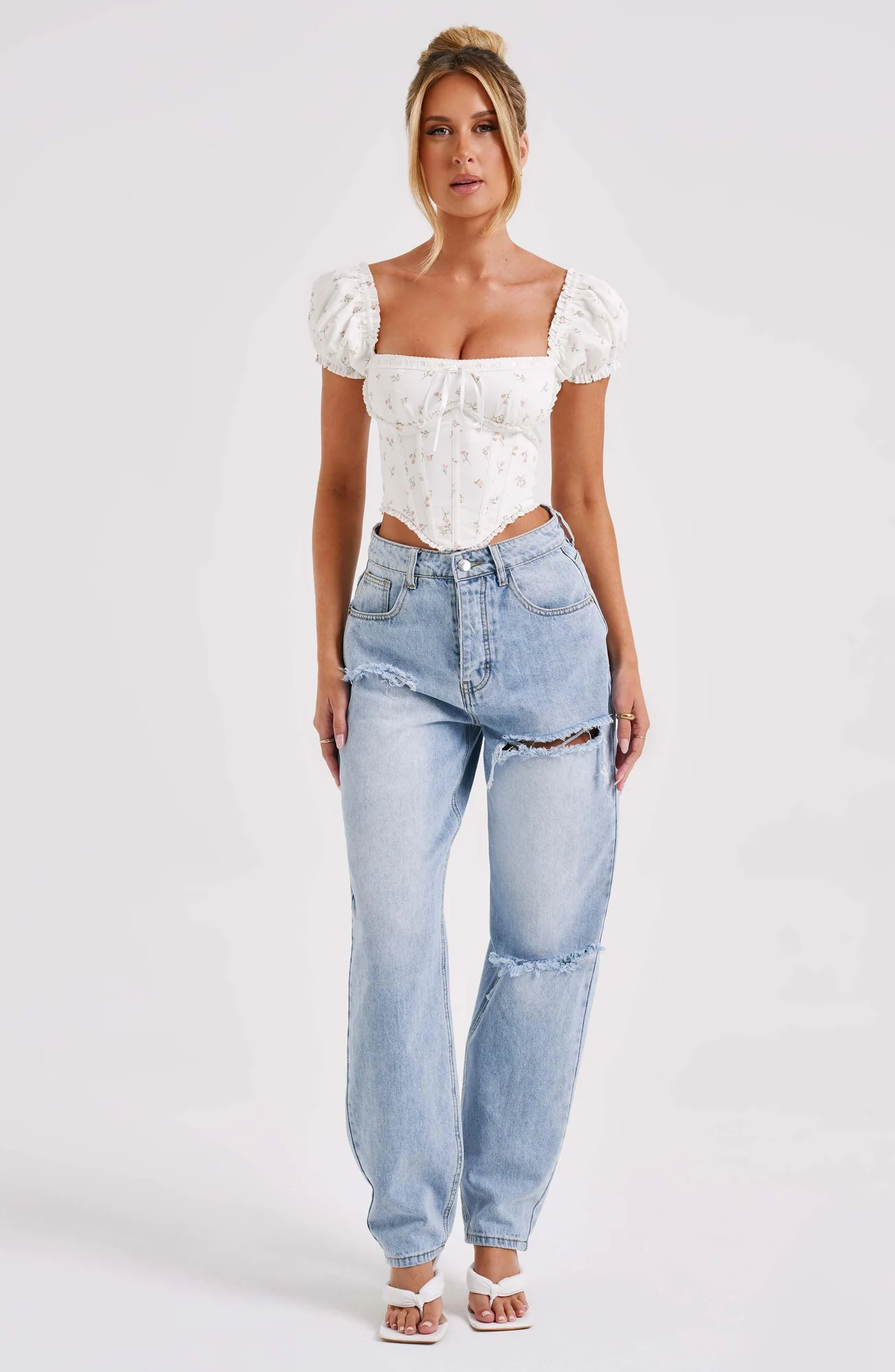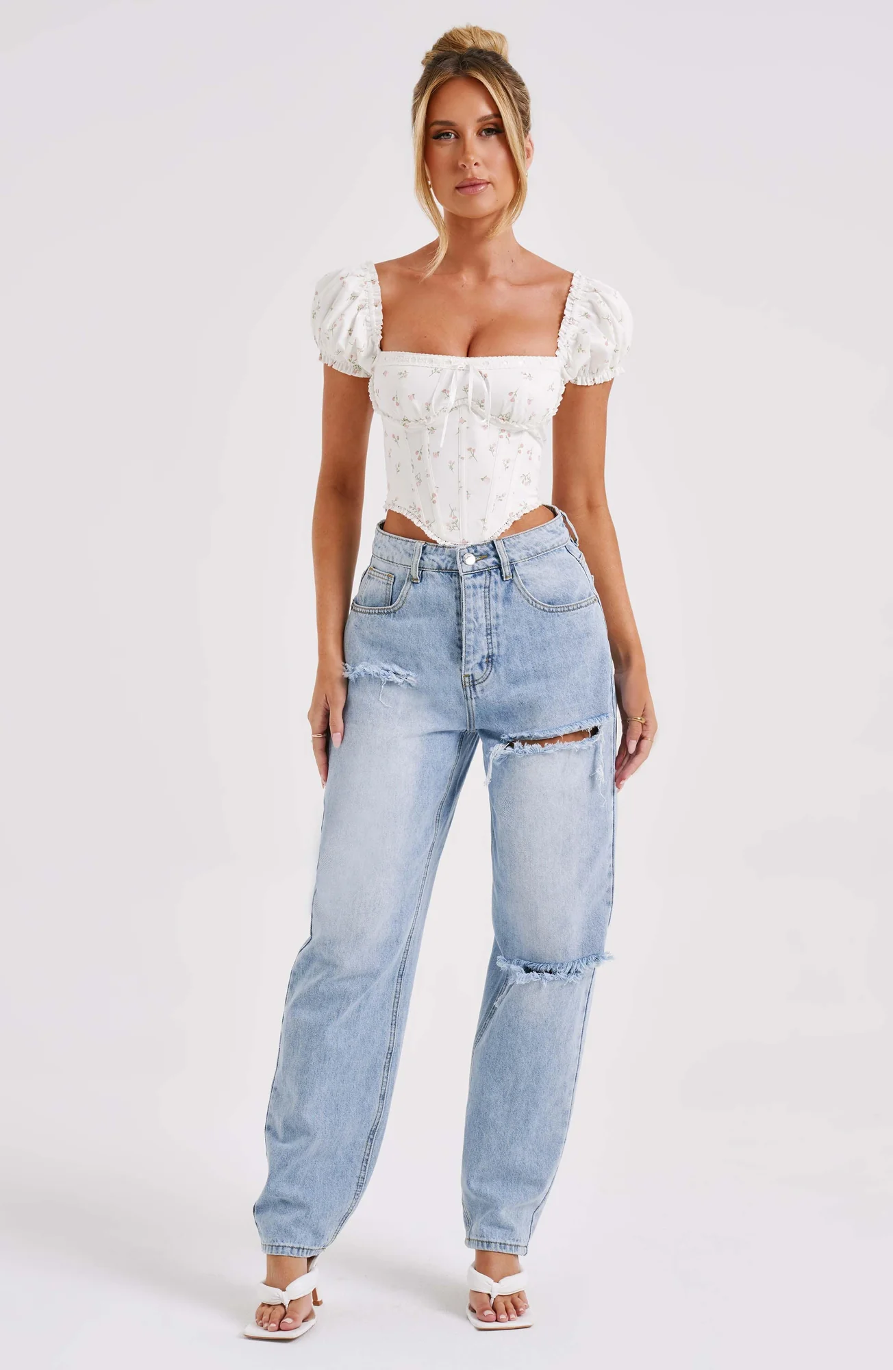 Embrace this must-have blush floral print corset top — a wardrobe essential for any season. The Matilda corset features dreamy puffed sleeves, a snatched waist, and a pretty tie detail on the bust for a romantic touch. Made from premium non-stretch cotton, it includes underwired bust support, waist-cinching design, and a flattering dipped hem. Perfect for pairing with your favorite denim and mule heels. Model is wearing size XS. Available in sizes XS to XXL.