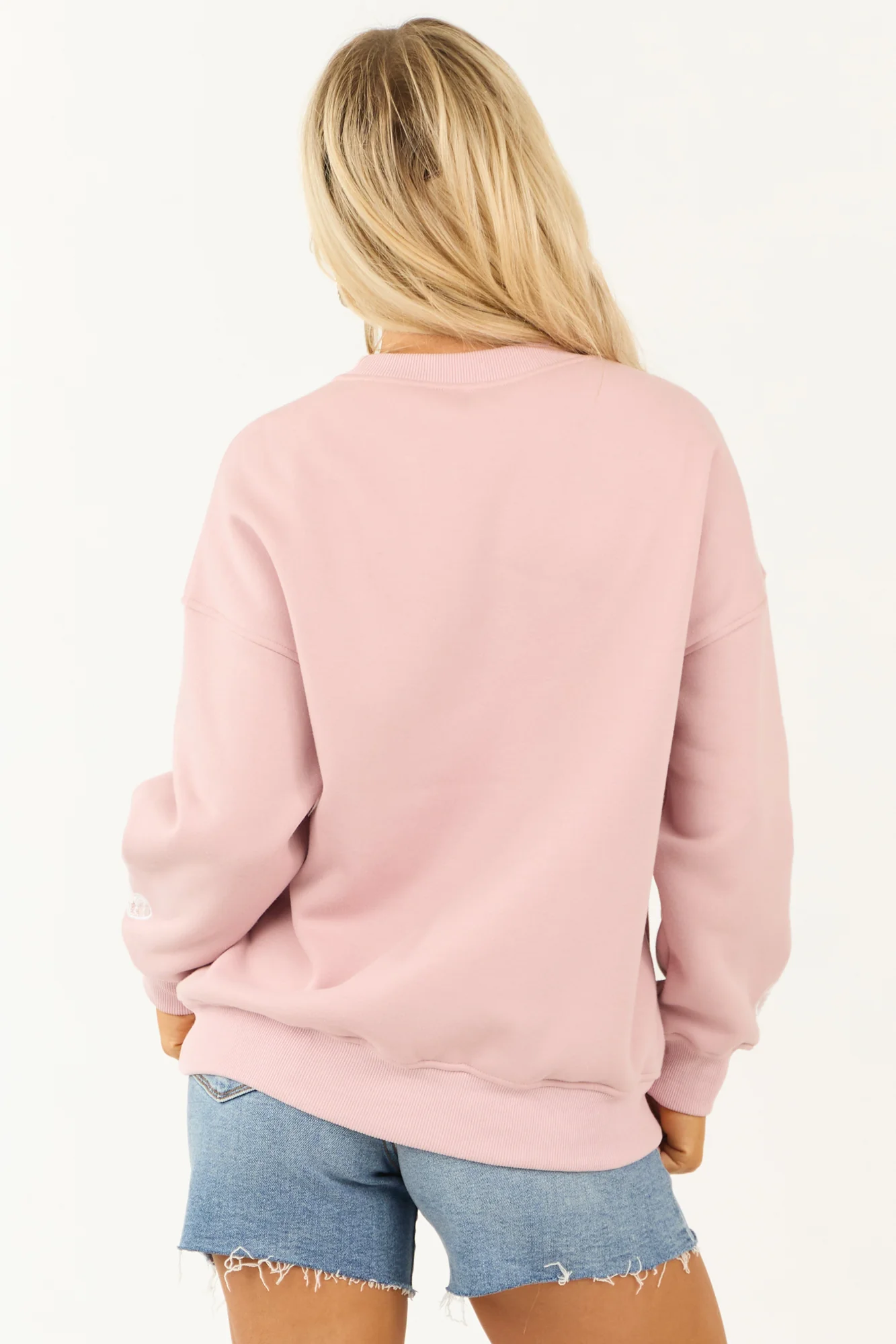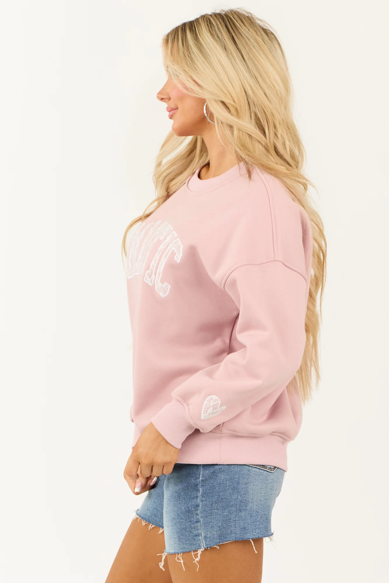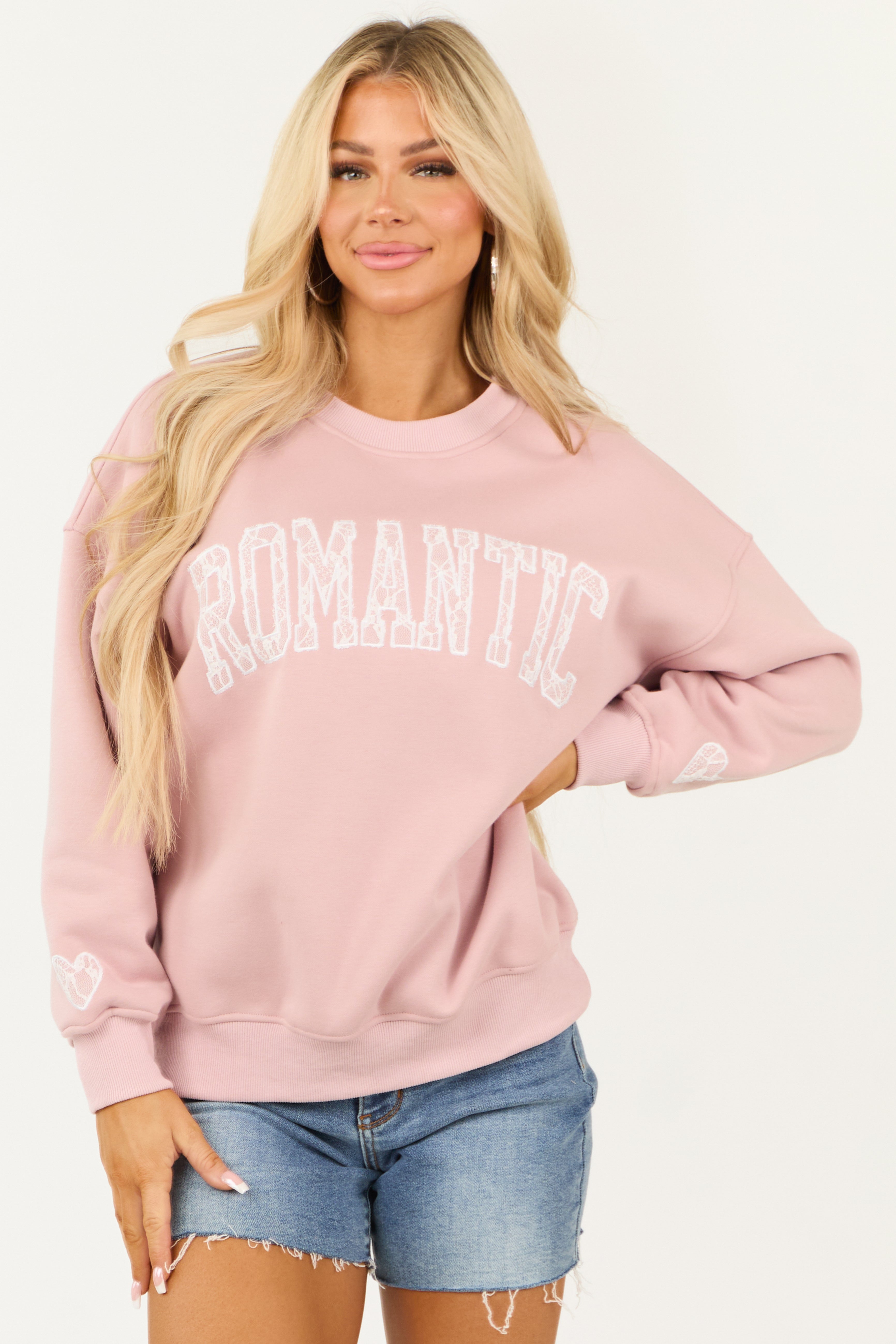 Add a touch of romance to your wardrobe with our Blush Lace Graphic Sweatshirt featuring heart embroidery details. This oversized sweatshirt offers a stretchy knit for comfort and style. The long sleeves, crew neckline, and drop shoulder enhance the chic look. Crafted from a blend of cotton and polyester, this sweatshirt is both cozy and trendy. Hand wash cold and lay flat to dry to maintain its quality. Perfect for casual wear during the spring season.