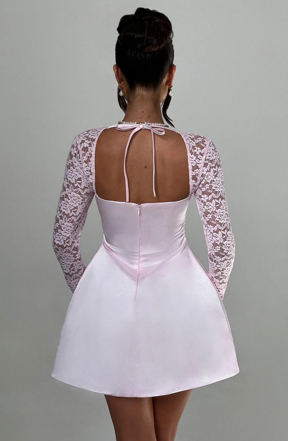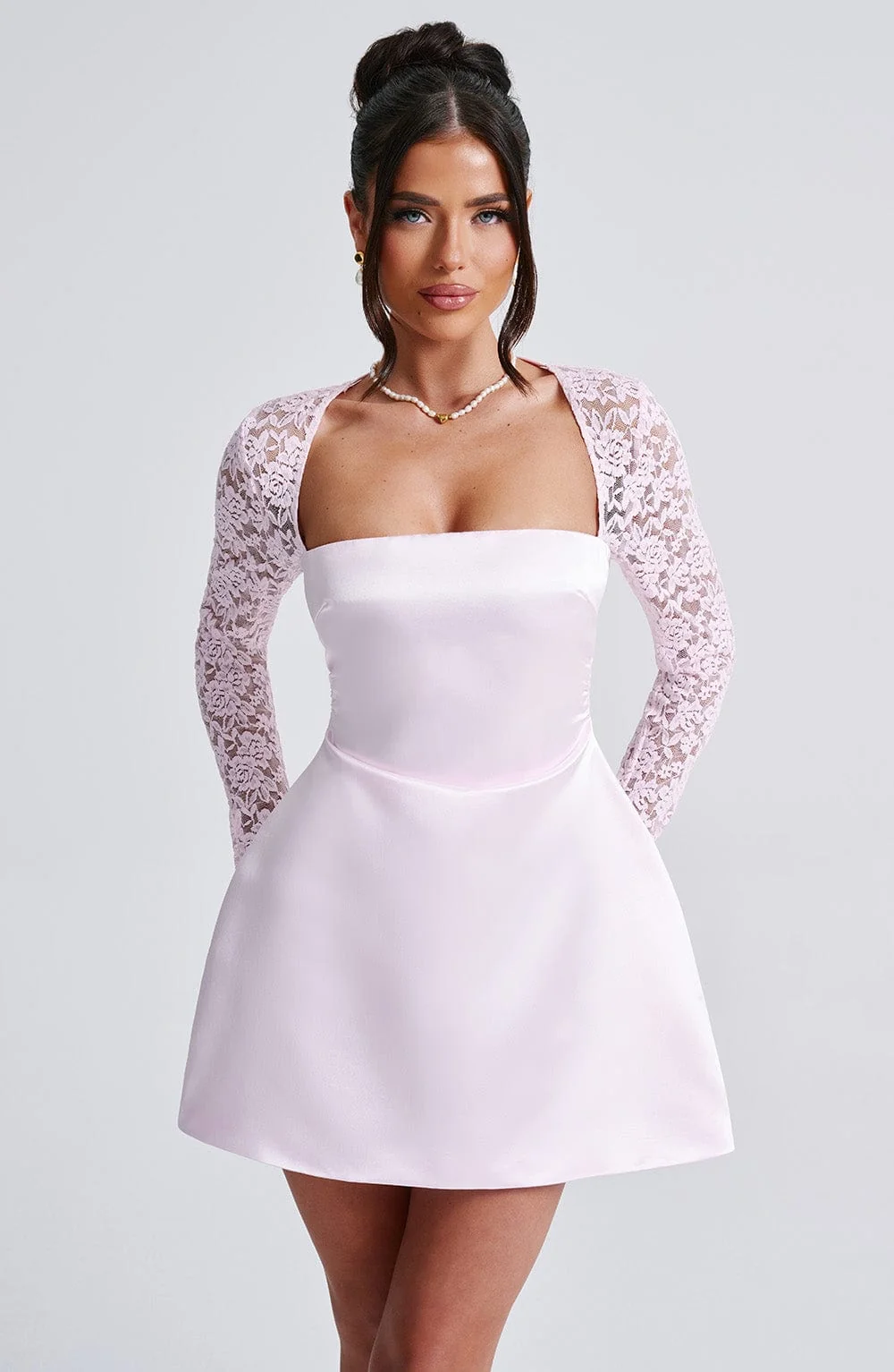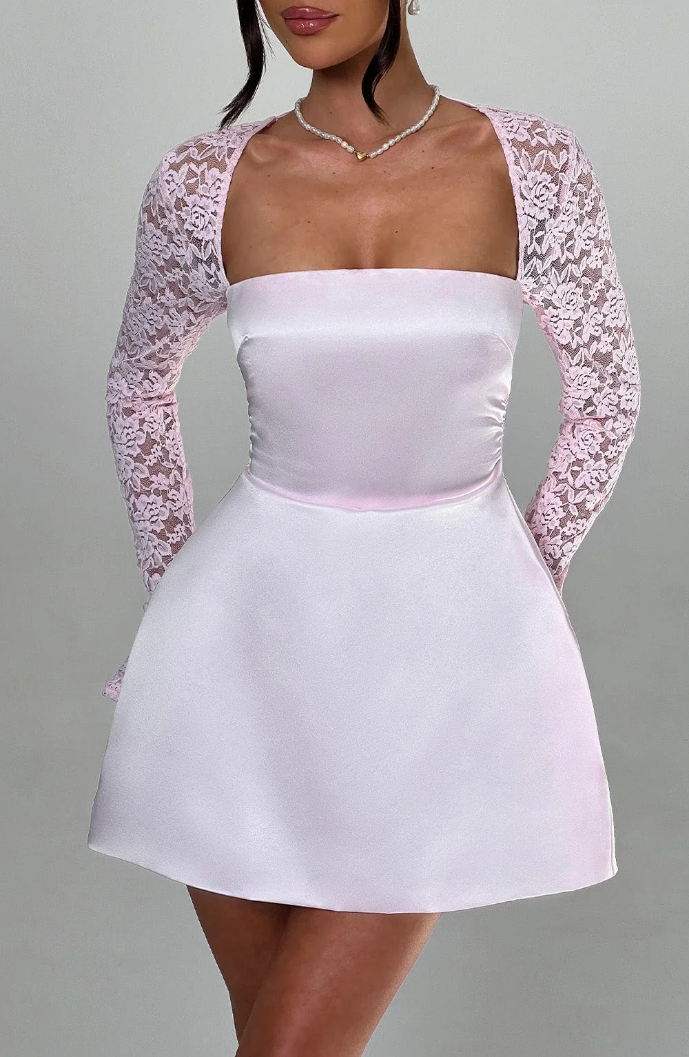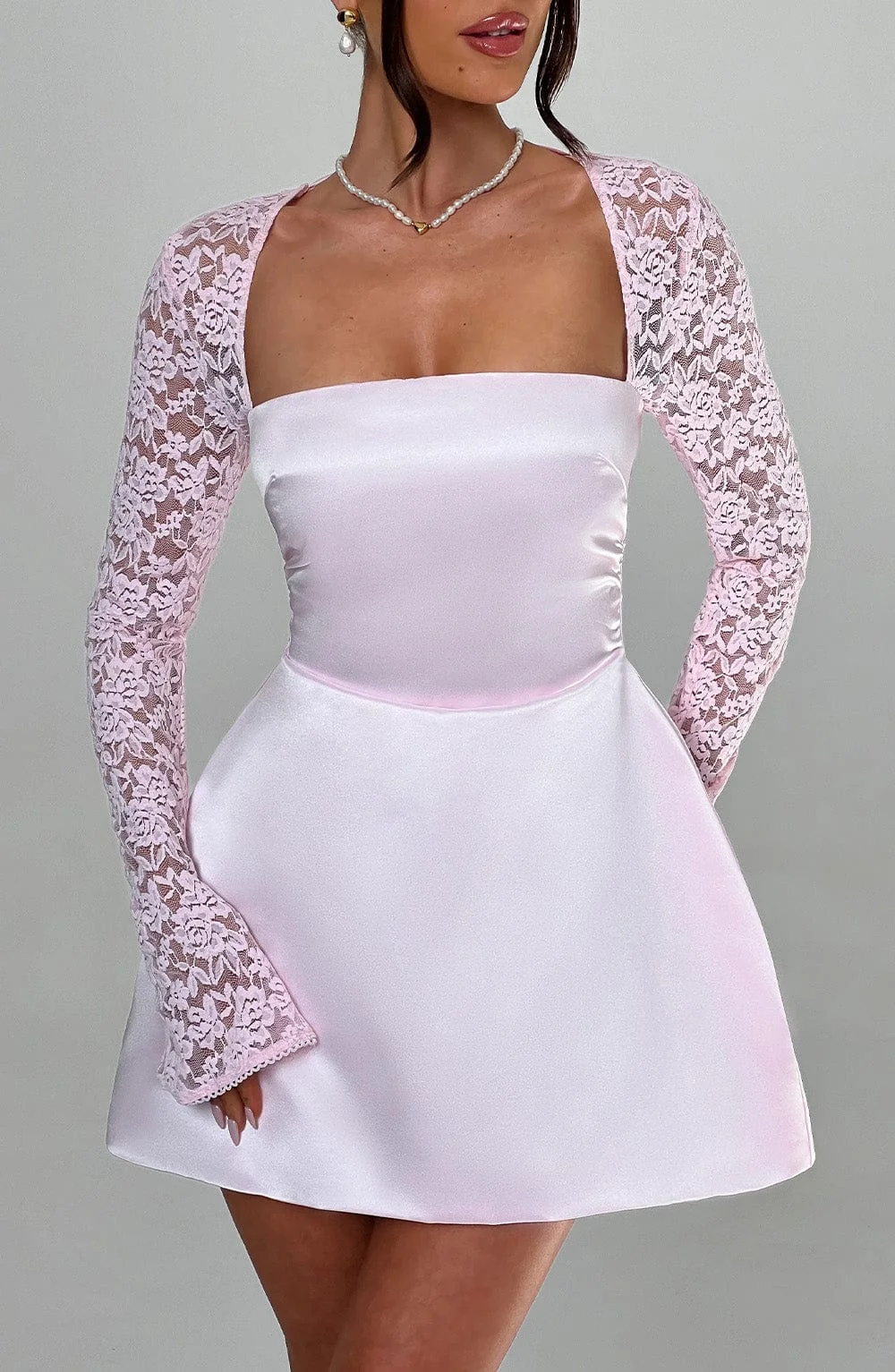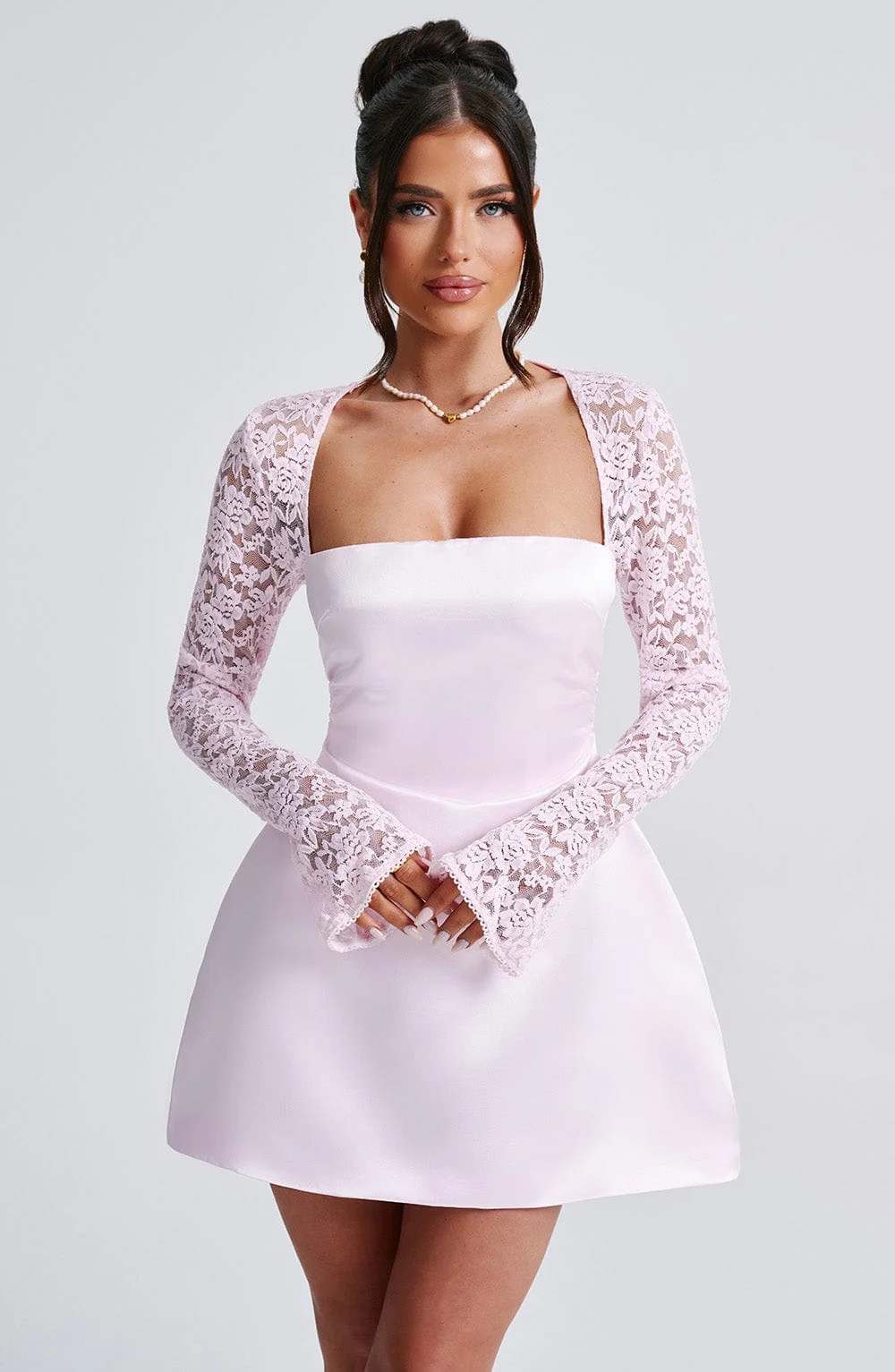 Indulge in the ultra-feminine and alluring Blush Lace Sleeve Mini Dress, perfect for romantic dinner dates, garden parties, and more. Crafted from premium satin fabric, this dress features a square neckline, a cinched waist, and a voluminous bubble skirt. The exquisite design includes sheer lace sleeves with flared cuffs for a touch of elegance. This mini dress in Blush is fully lined, ensuring a luxurious feel and comfortable fit. Elevate your style effortlessly with this dreamy ensemble. Available sizes: XS, S, M, L, XL, XXL.