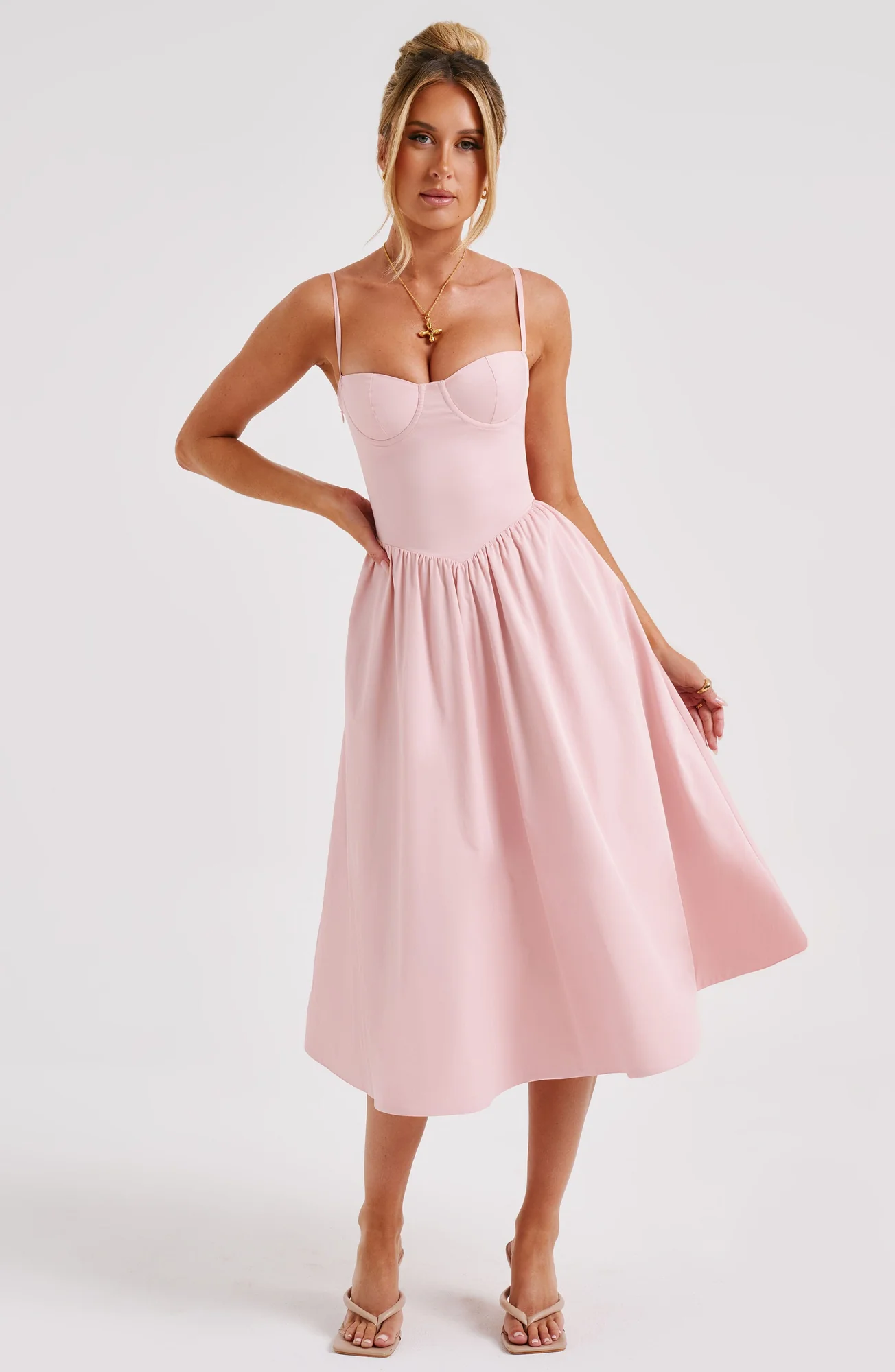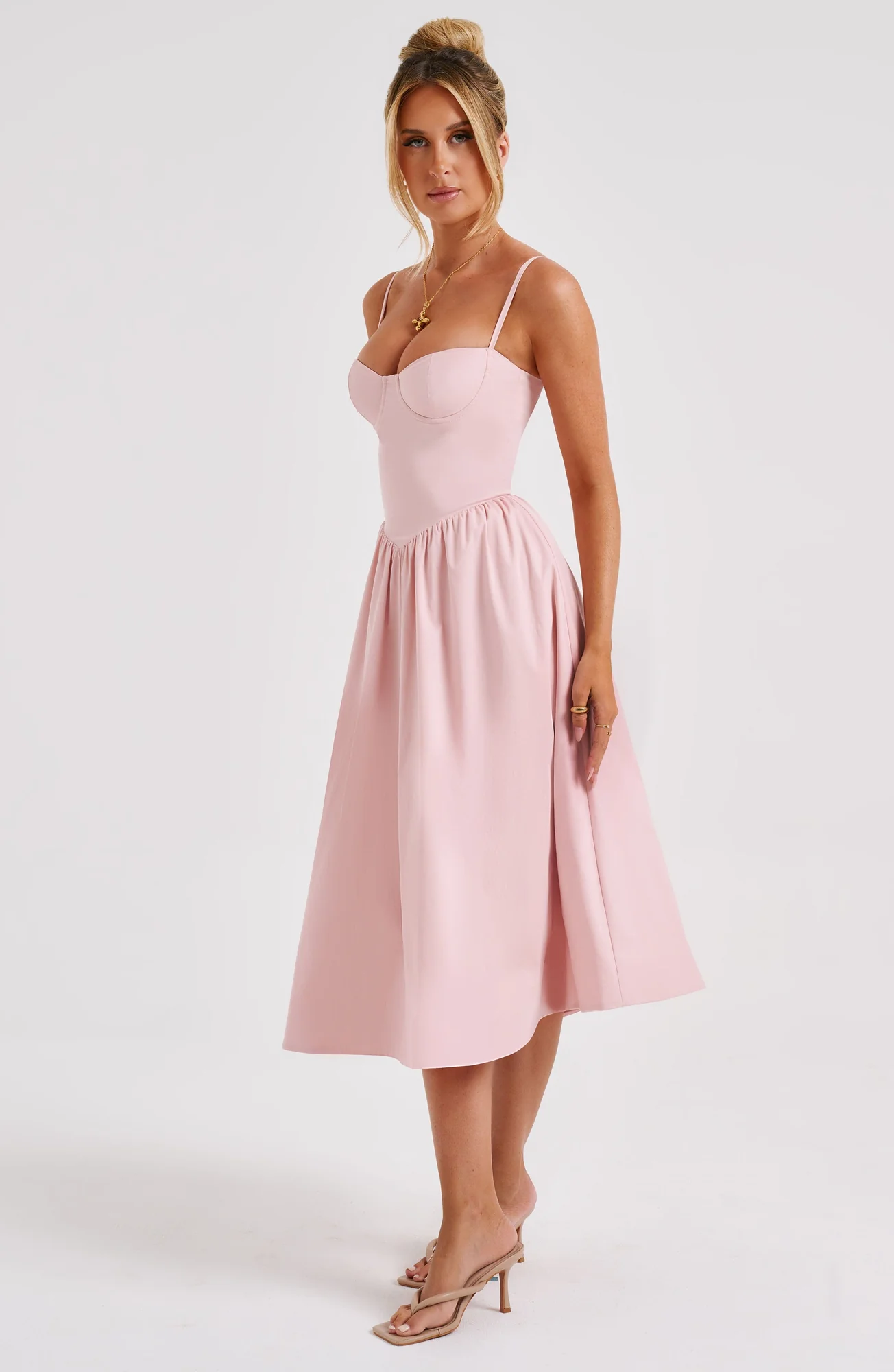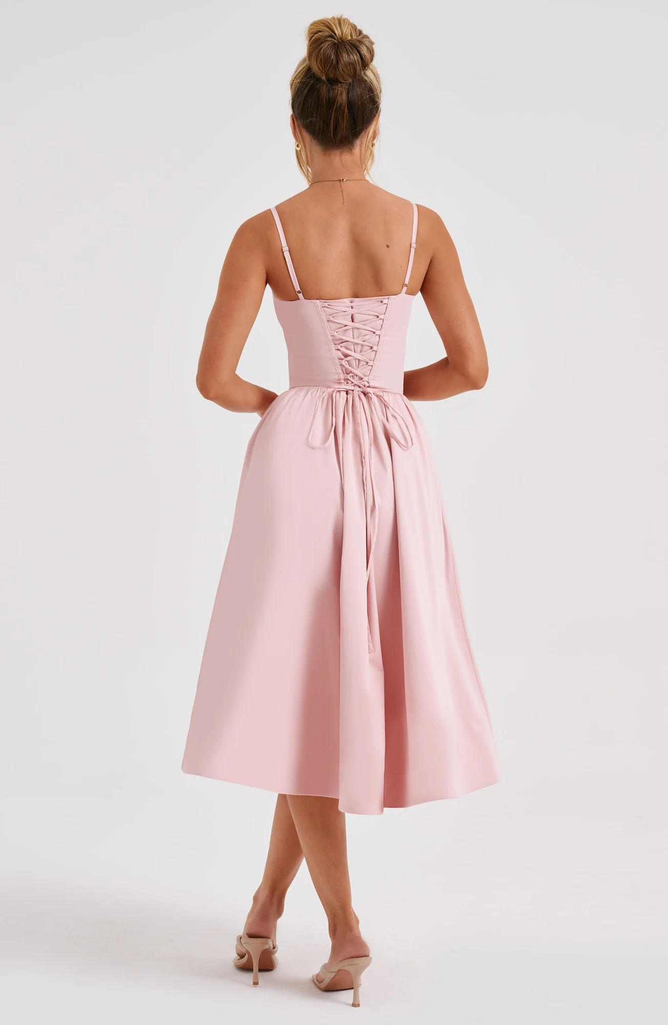 Introducing the dreamy Blush Lace-Up Corset Midi Dress crafted from premium poplin fabric for unmatched comfort and style. This ultra-feminine dress features an underwired bust, waist-cinching corset bodice, pretty voluminous skirt, and a lace-up back detail. With adjustable straps and a flattering midi length design, this dress is versatile for all occasions. Model is wearing size XS. Experience elegance and sophistication with this must-have dress.