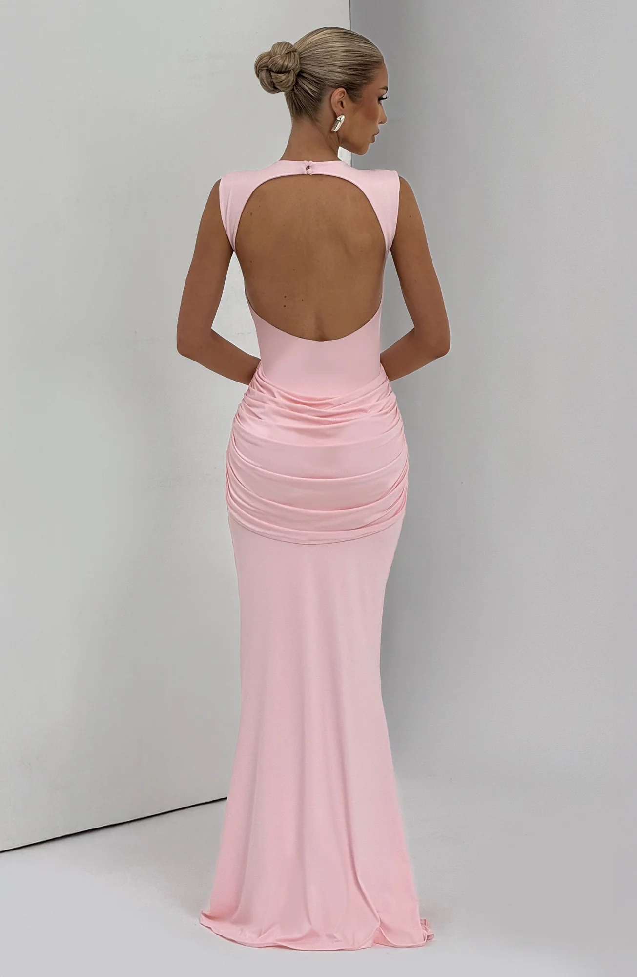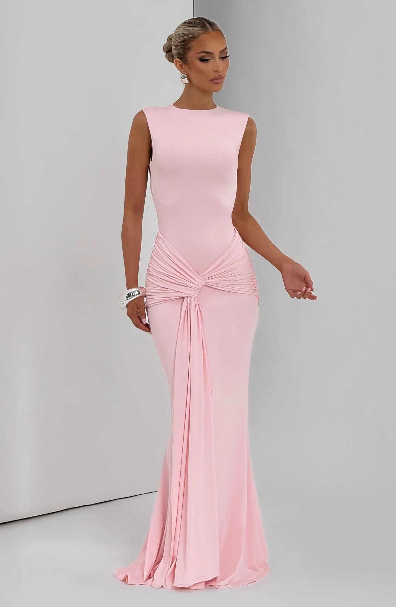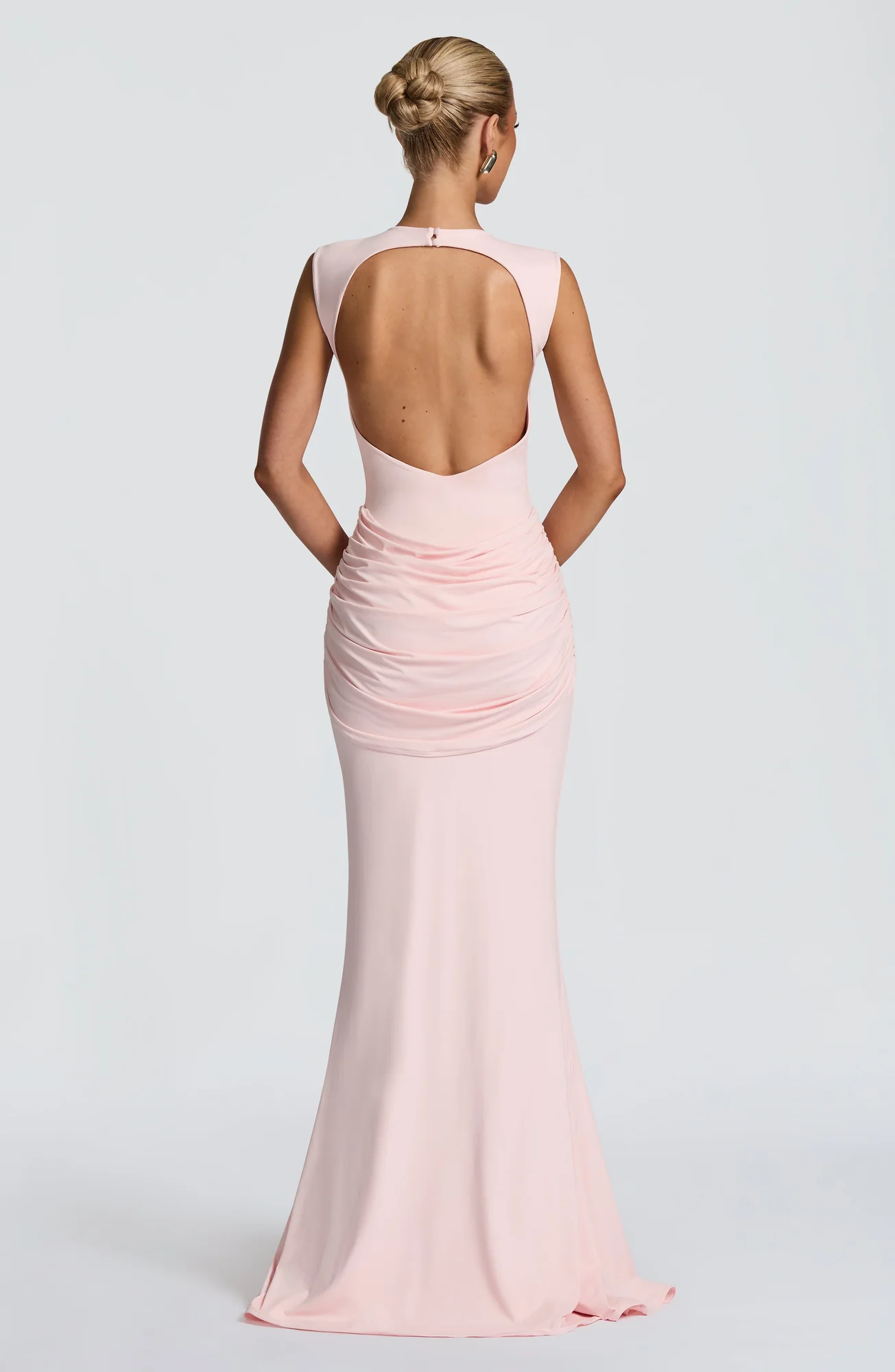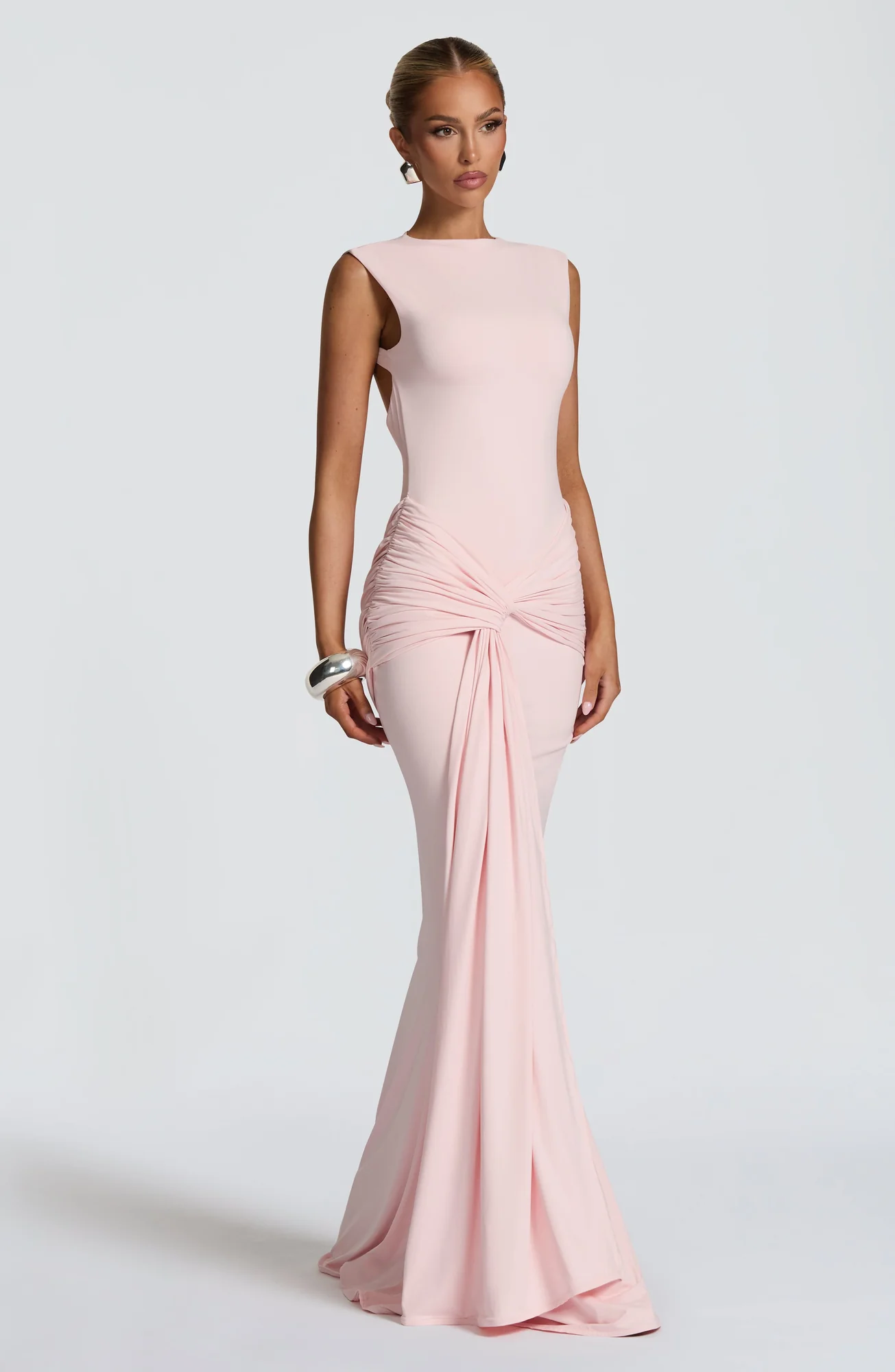 Elevate your style with the Blush Maxi Dress featuring a sleek high neckline, open keyhole back, and a refined silhouette. Crafted from luxurious slinky jersey, this dress boasts a fitted bodice, fit-and-flare skirt, and elegant ruched knot detail with a drape tie. Fully lined for comfort. Perfect for weddings, parties, prom, or any formal occasion. Available in sizes S to XXL.