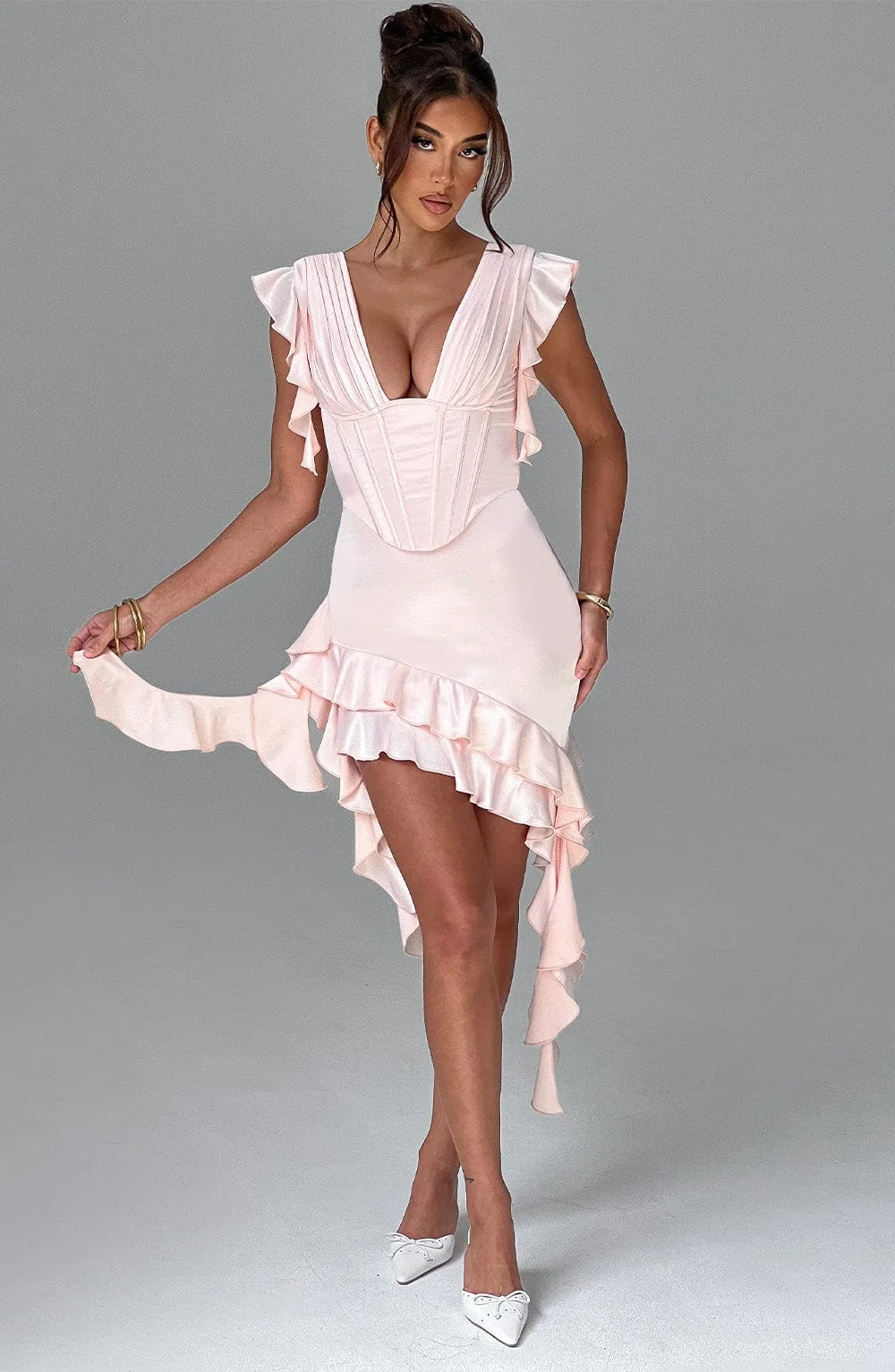 Indulge in the luxurious charm of our Blush Satin Frill Mini Dress featuring a stunning built-in corset with boning for a perfectly cinched waist. Crafted from premium stretch satin, this dreamy ensemble boasts delicate lace-up back detailing, dramatic frill cap sleeves, and a plunging underwired neckline. The cascading frill accents and pleated underwired cups add a touch of elegance to this mini-length dress. Fully lined for comfort. Ideal for weddings, brunches, holiday gatherings, and more. Get ready to dazzle in this flirty number. Available in sizes XS to XXL.
