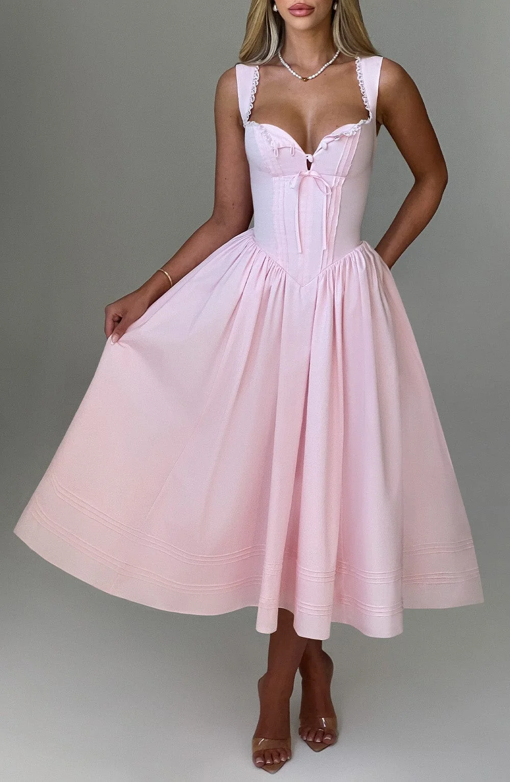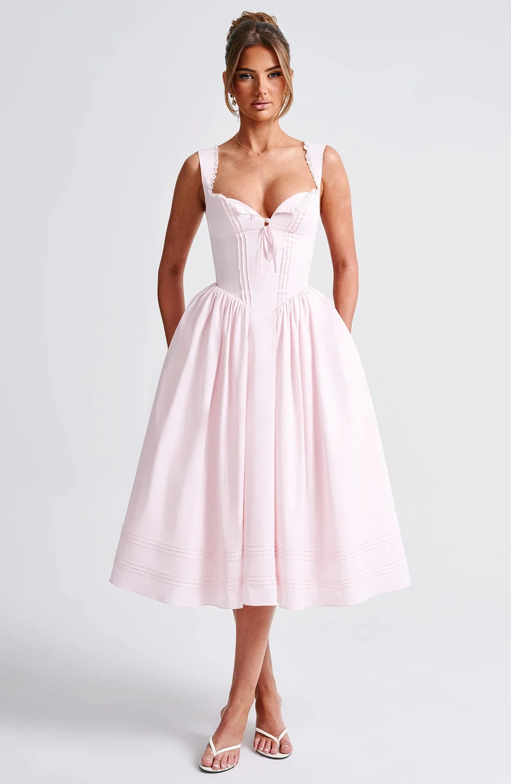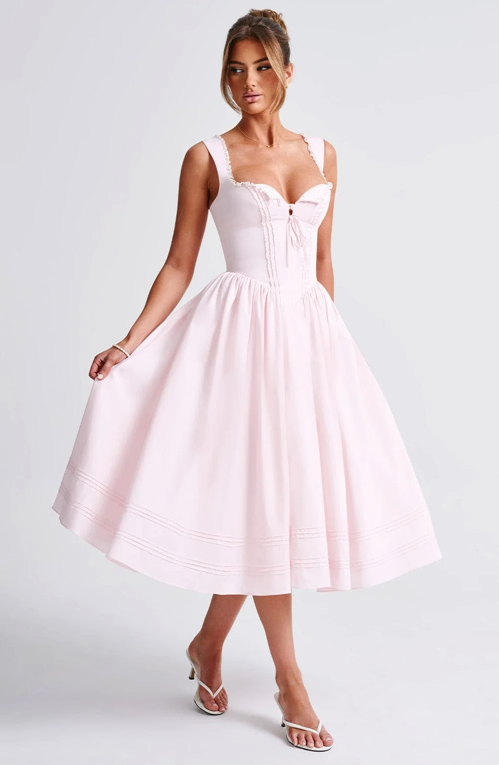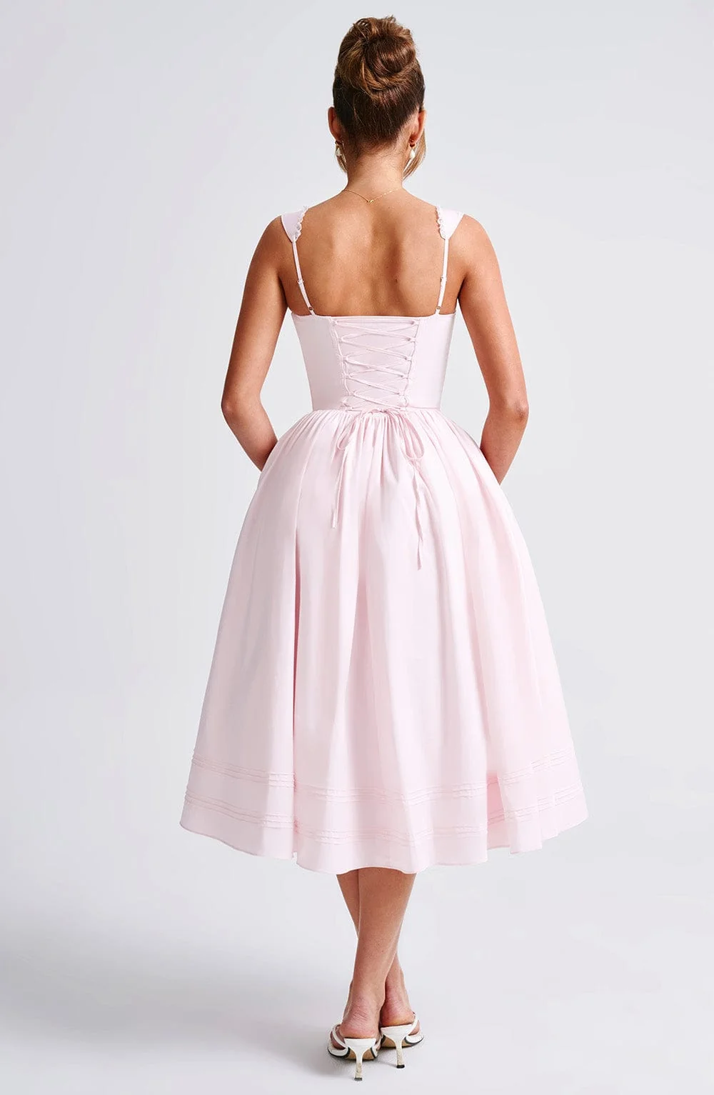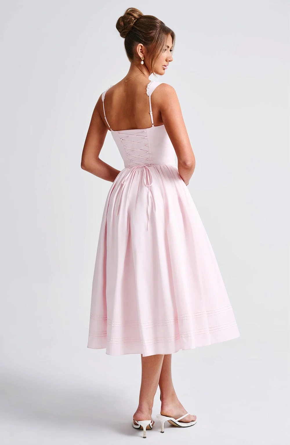 Elevate your bridal look with the Blush Square Neck Midi Dress. Crafted in a premium cotton-blend fabric featuring an all-over floral print, pintuck and lace trim details, this dress boasts a square neckline, full voluminous skirt with internal tulle, lace-up back, and functional button closure. Stay comfortable and stylish in this fully lined, midi-length dress ideal for various occasions. Available in sizes XS to XXL.