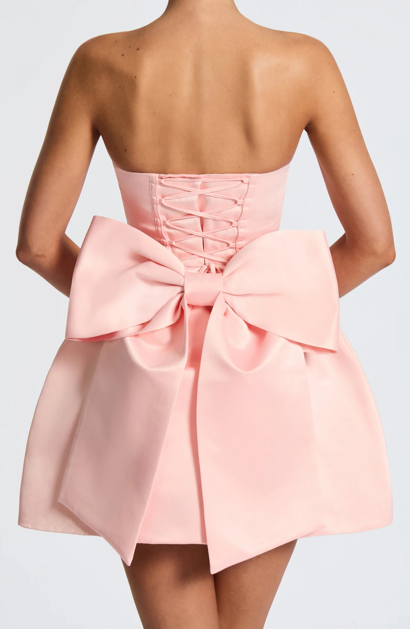 Elevate your style with the Blush Strapless Mini Dress with Lace-Up Back. Crafted from non-stretch structured satin, this chic dress features a bubble-shaped skirt and an oversized detachable bow for a touch of whimsy. Ideal for special occasions, the dress is fully lined and finished with an invisible zipper closure. Embrace sophistication and charm with this elegant piece.