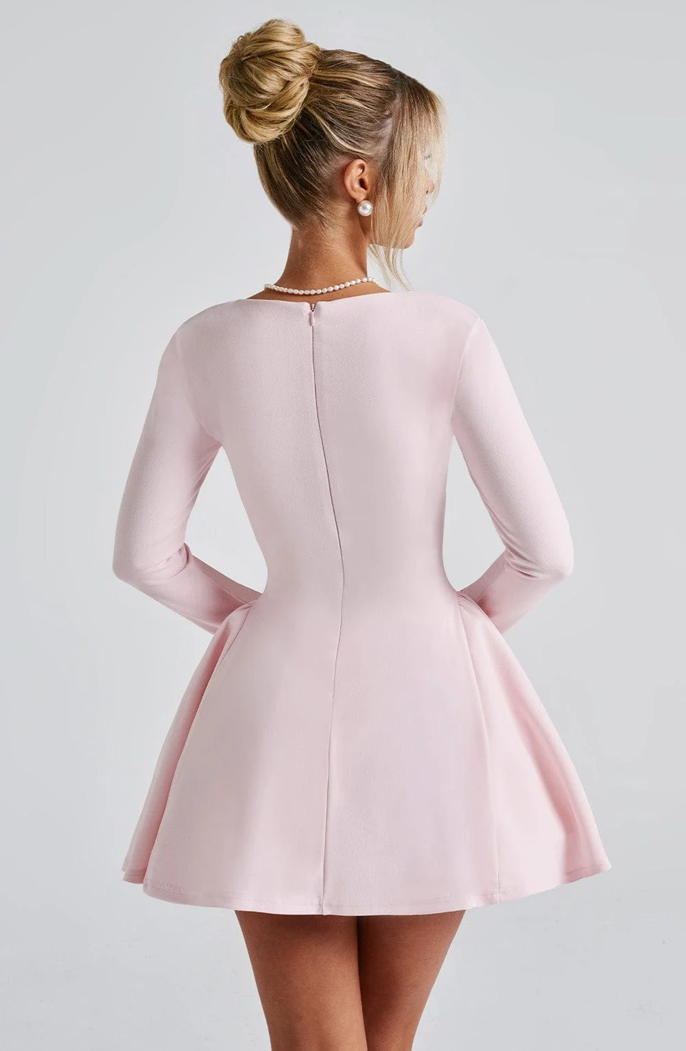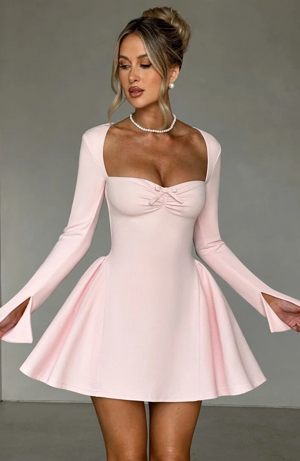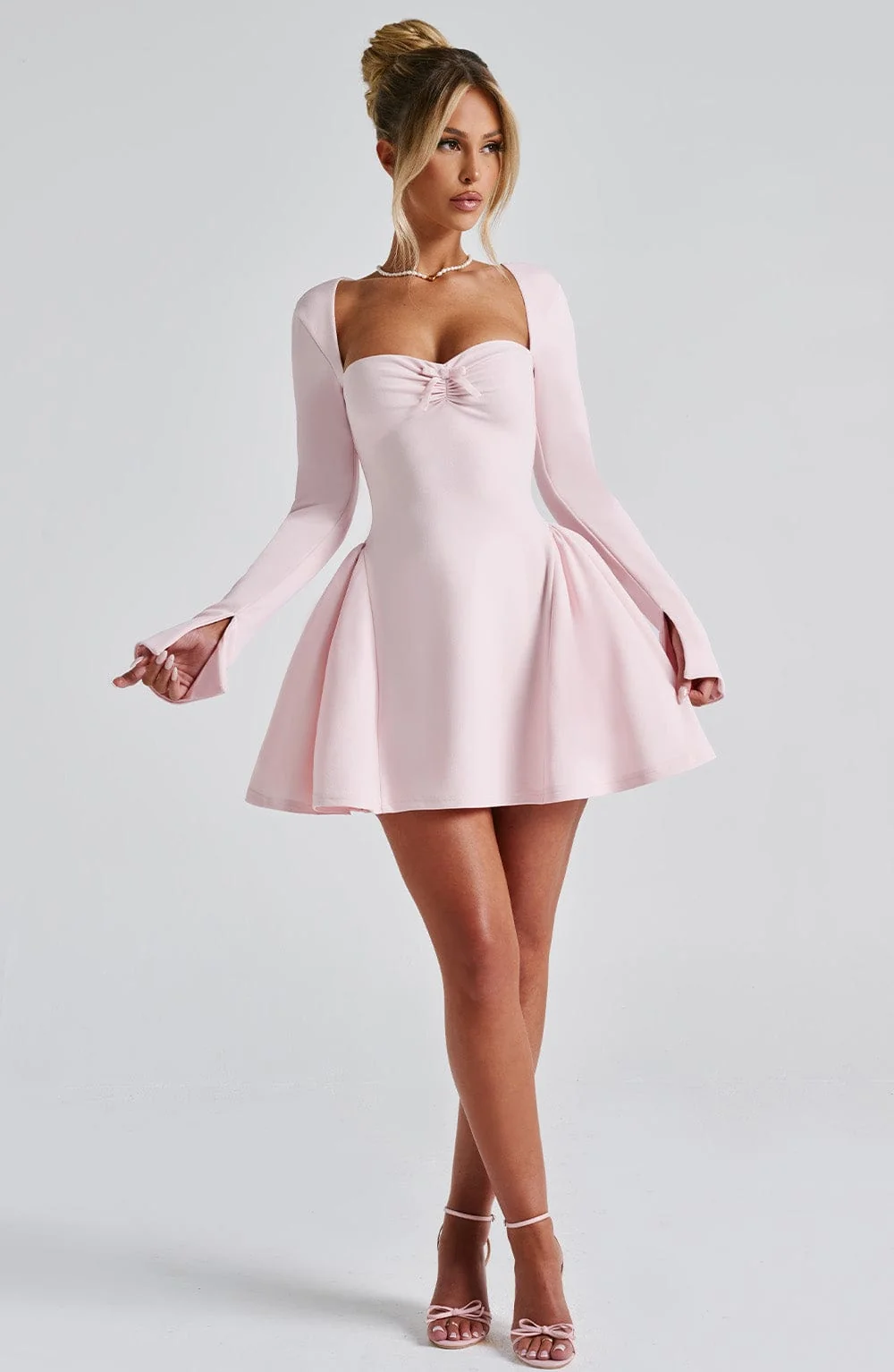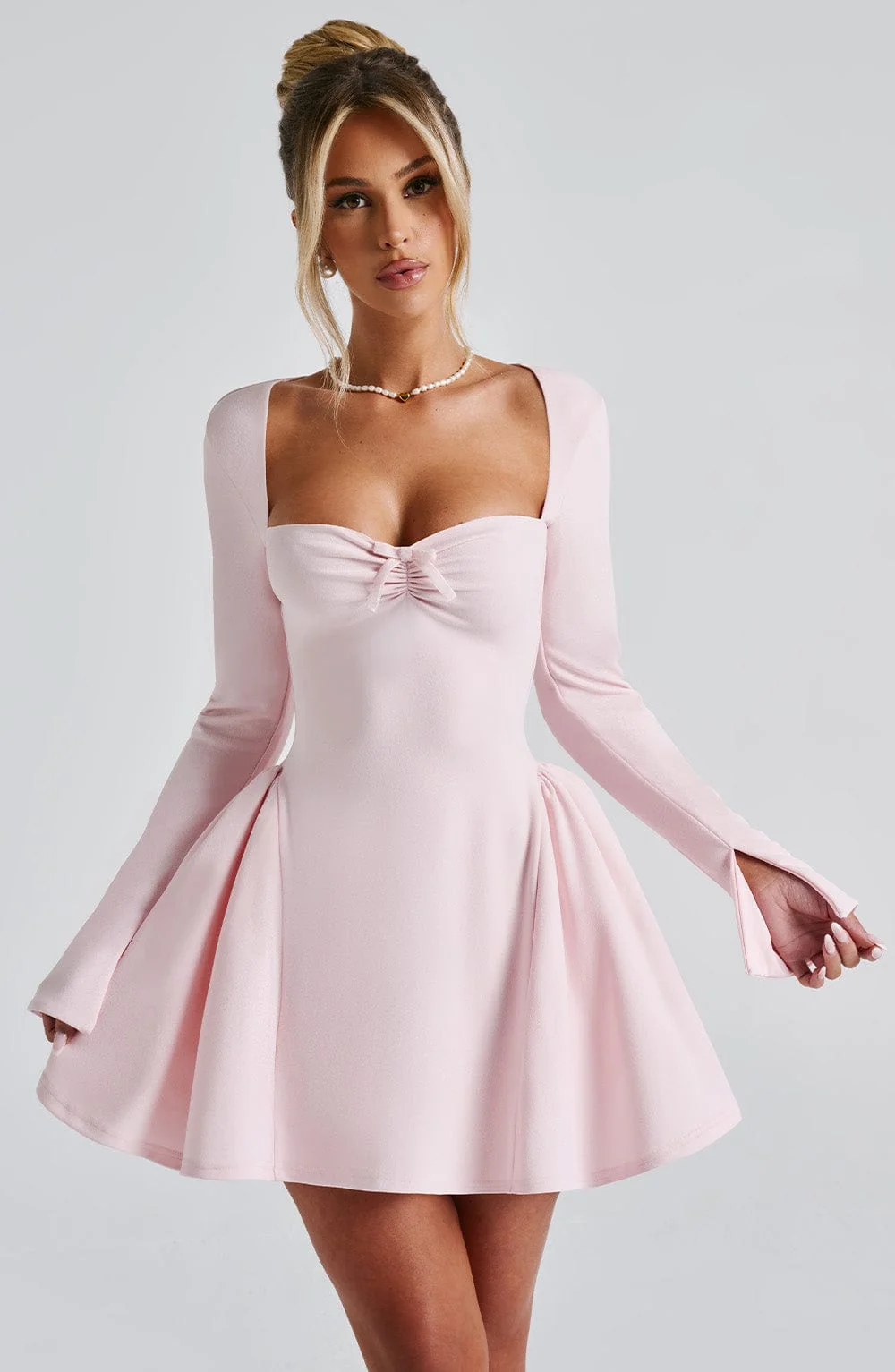 Experience romance with our Megan mini dress in blush. Crafted from premium stretch crepe, this dress features a cinched waist, hip panels for a full skirt effect, sweetheart neckline, velvet bow accent, and long fitted sleeves. Fully lined and finished with intricate details, including tulle panels and an invisible back zipper. Perfect for various occasions like brunch, evening events, parties, races, weddings, and more. Pair with cherry red mule heels for a stunning look.